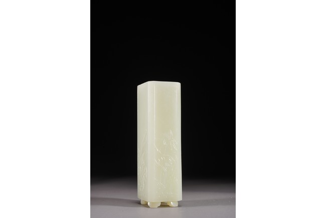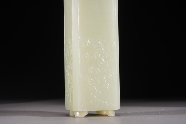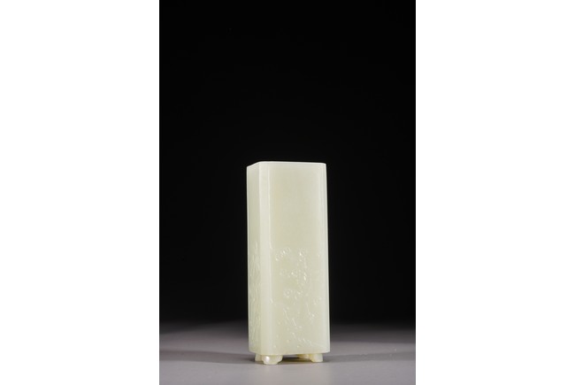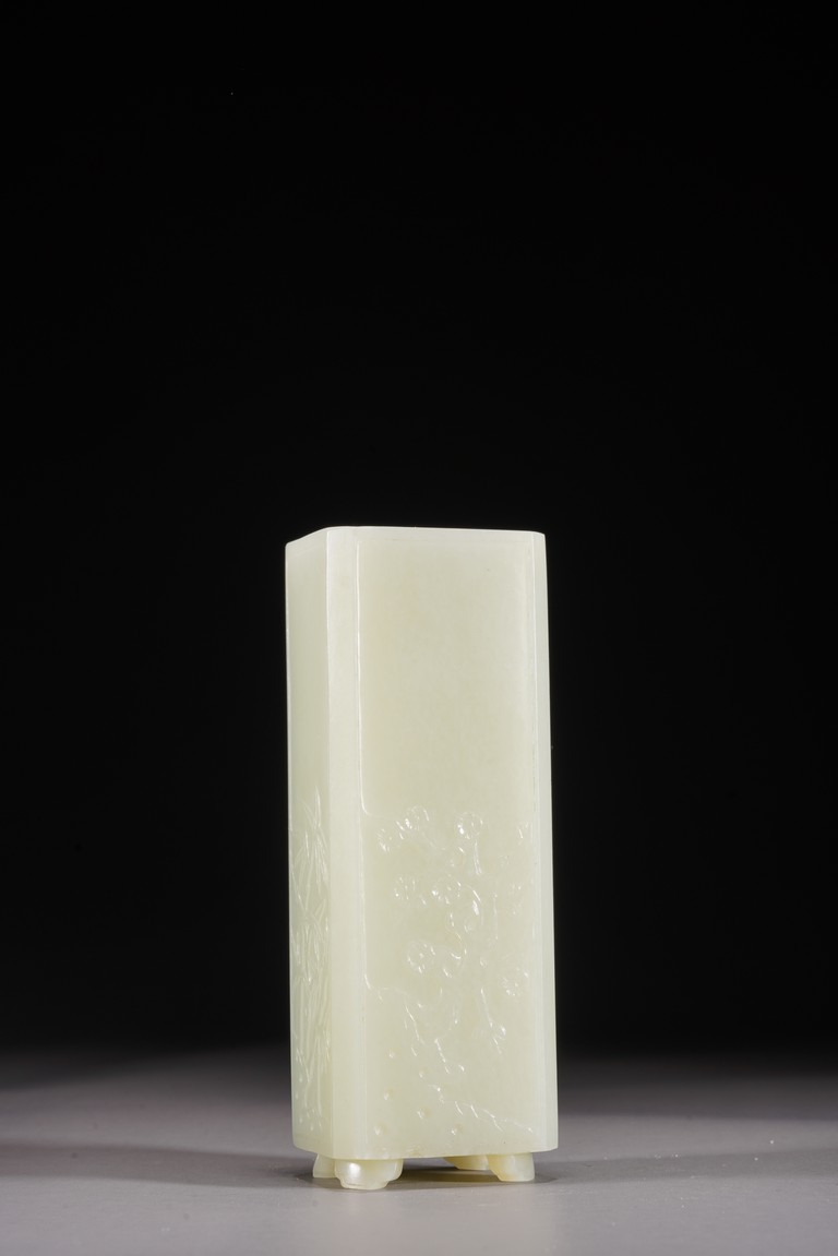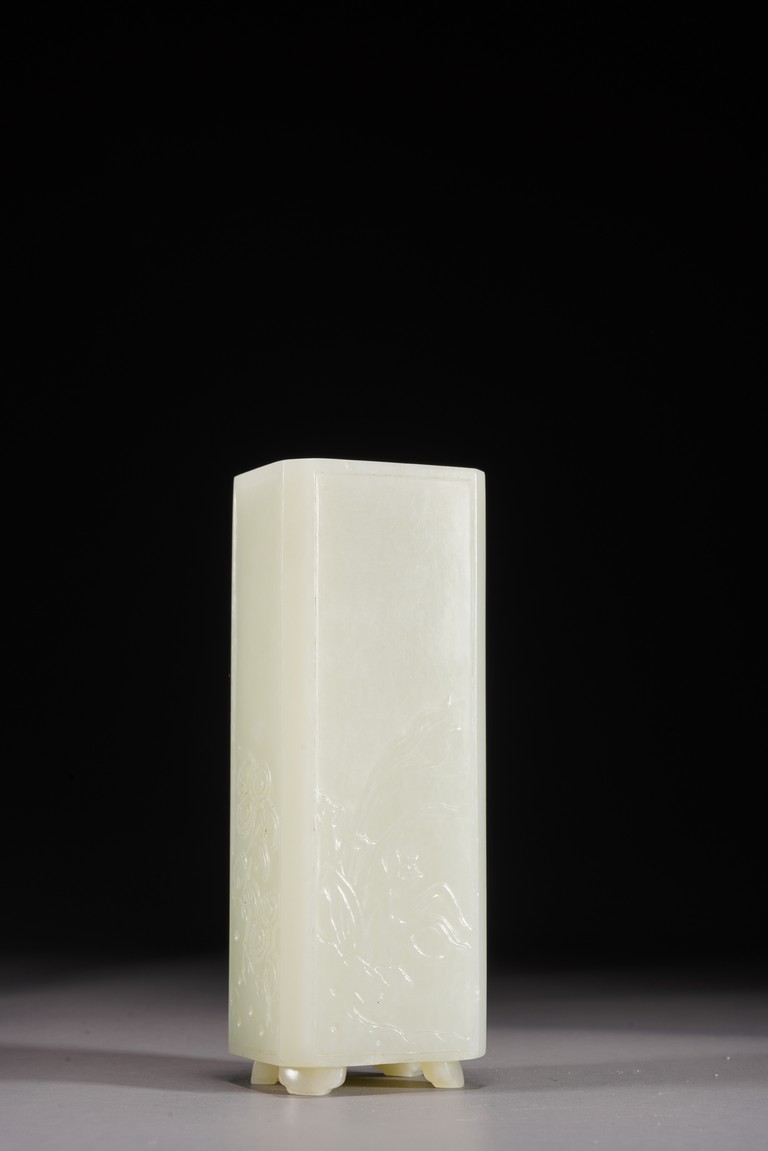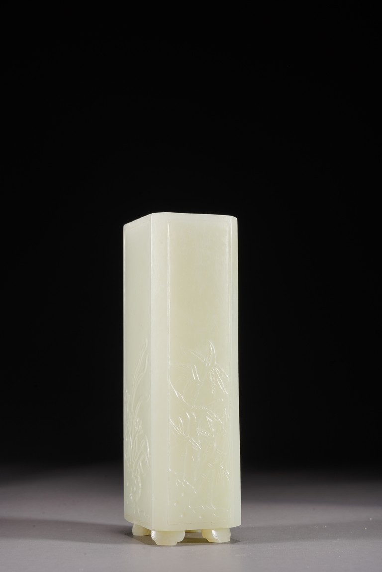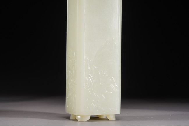 此件筆筒以上等和田白玉精心雕琢,質地潔白溫潤,通體純美無暇。方口直壁,掏膛整挖,中空以納筆,下承雲頭足,外壁浮雕四季花卉紋飾,素潔淡雅,雅意超群,是為不可多得玉雕文房精品。