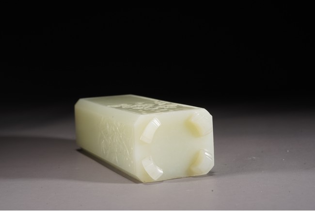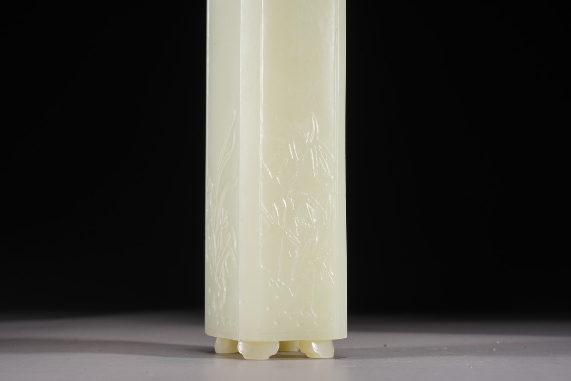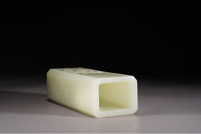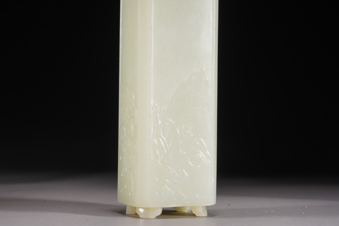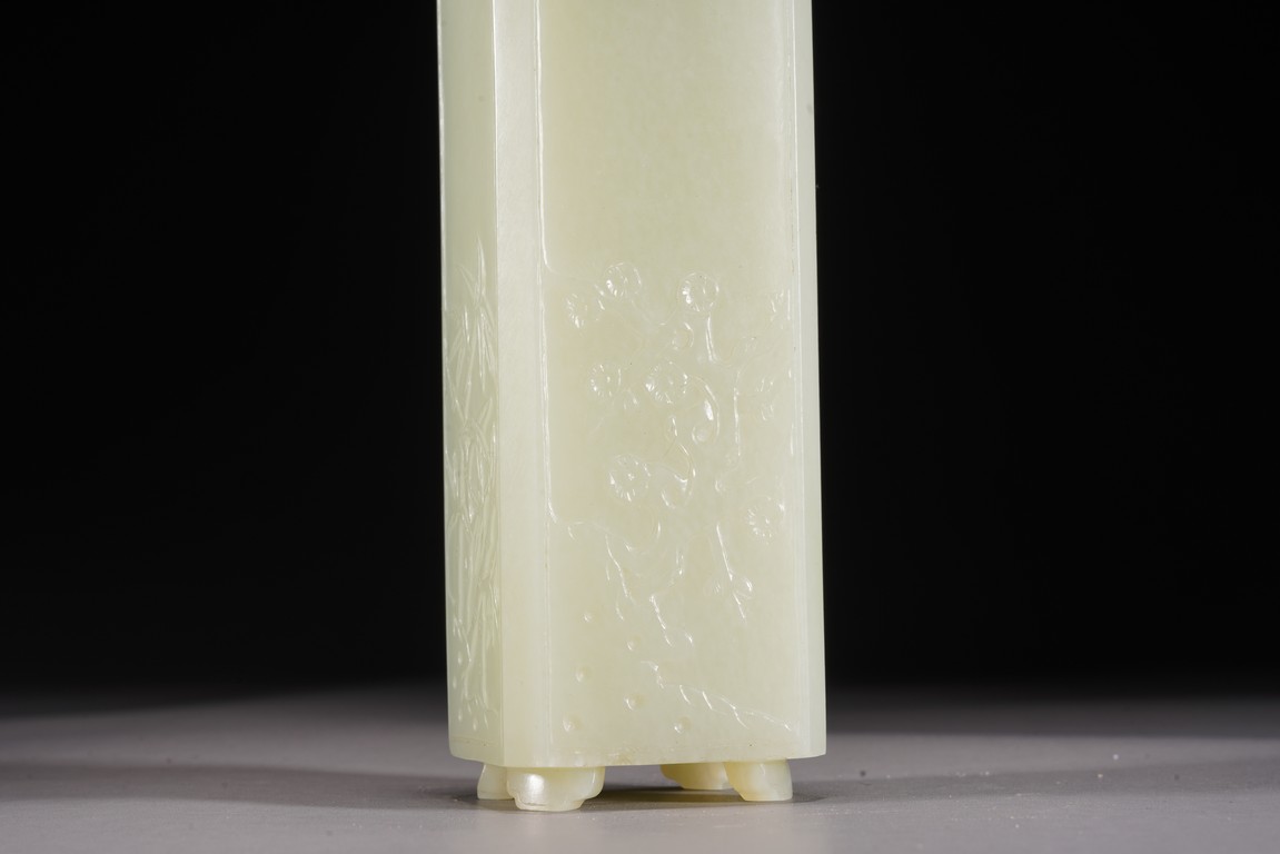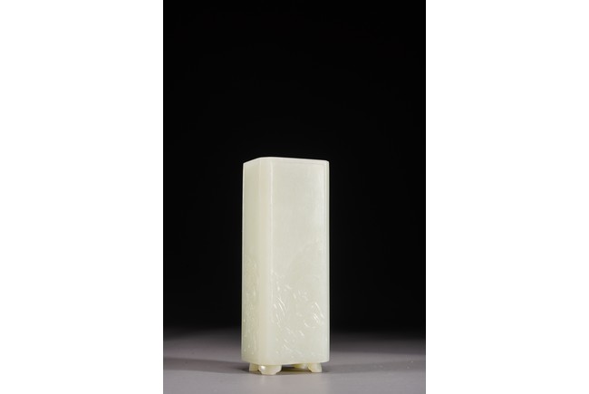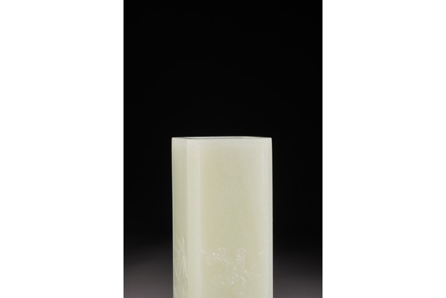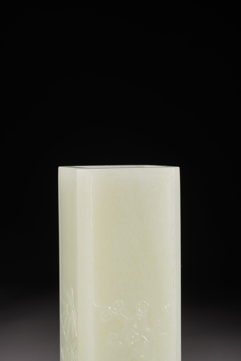 此件筆筒以上等和田白玉精心雕琢,質地潔白溫潤,通體純美無暇。方口直壁,掏膛整挖,中空以納筆,下承雲頭足,外壁浮雕四季花卉紋飾,素潔淡雅,雅意超群,是為不可多得玉雕文房精品。