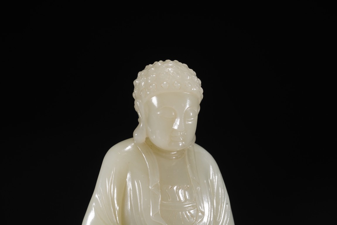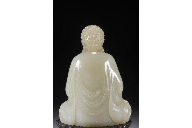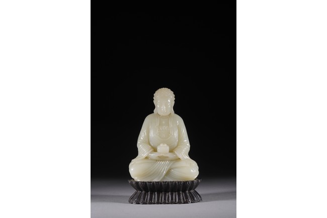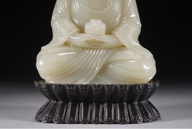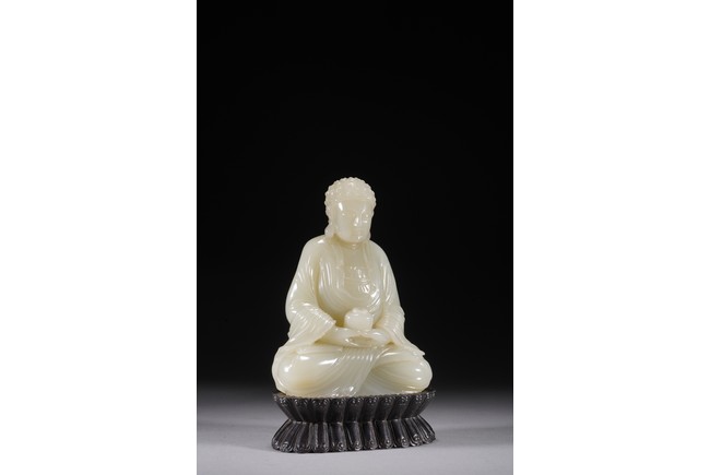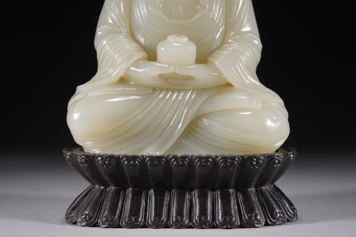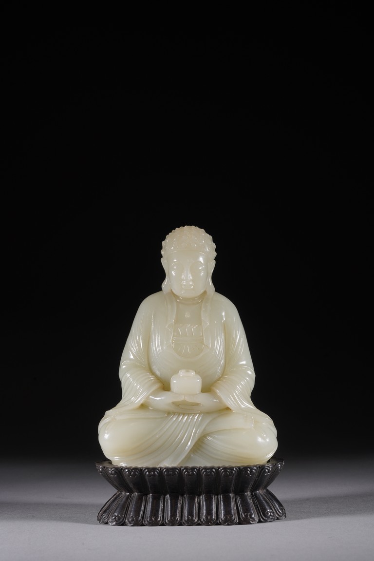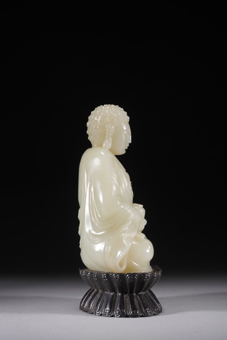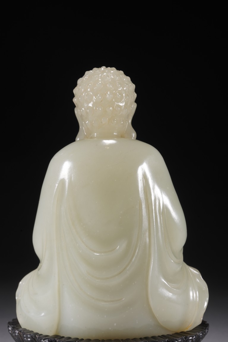取材和田白玉制,精雕釋迦牟尼佛坐像。坐像面態豐盈,盤坐於紫檀雕俯仰蓮瓣紋寶座之上,慈悲肅穆,威嚴大氣,形神兼備。材質上佳,瑩潤潔淨,細緻溫潤,富有光澤,色質勻一,觸手舒適,實為難得。來源: 華盛頓貝爾維尤私人收藏 Property from a private collection in Bellevue, Washington