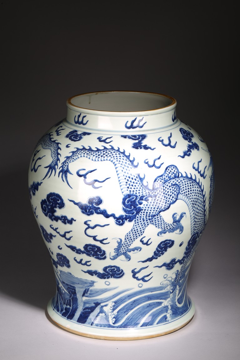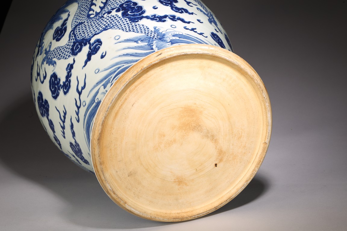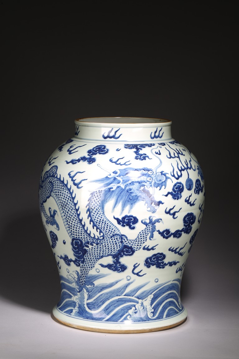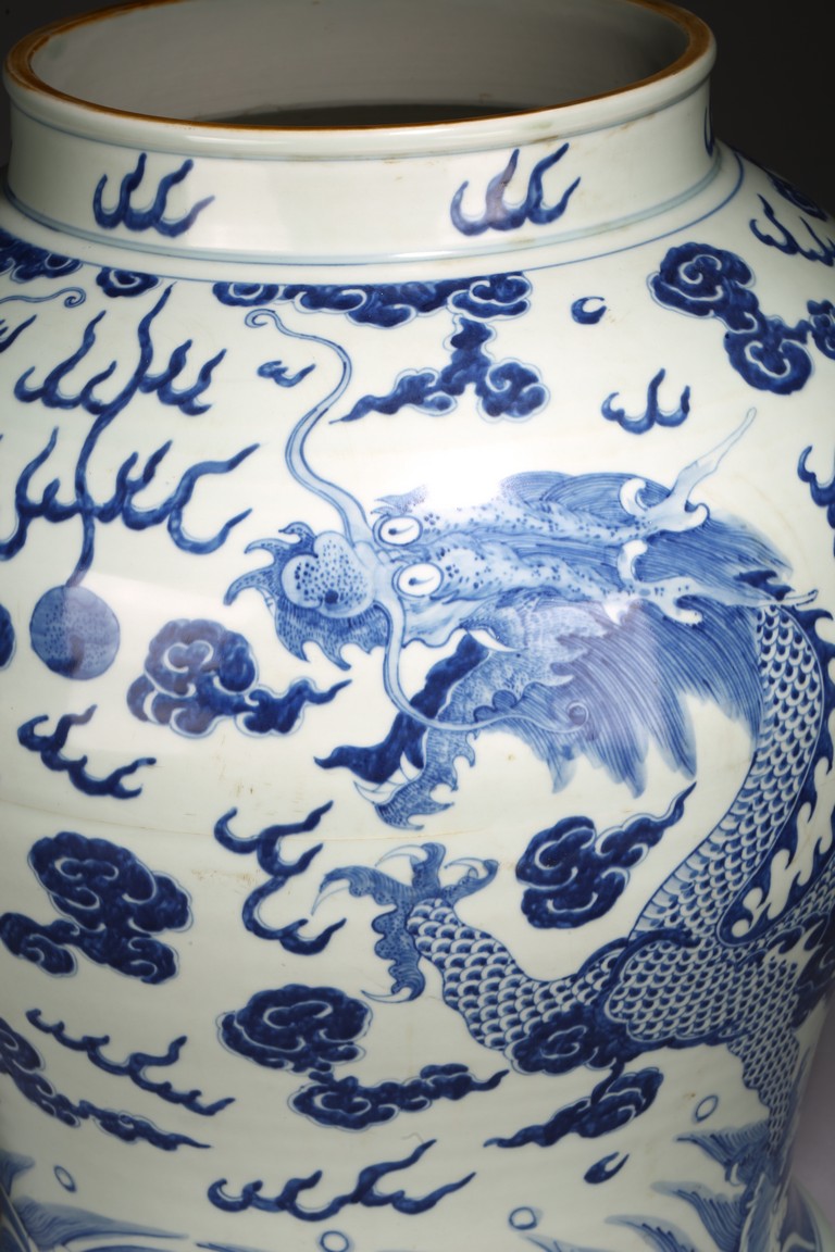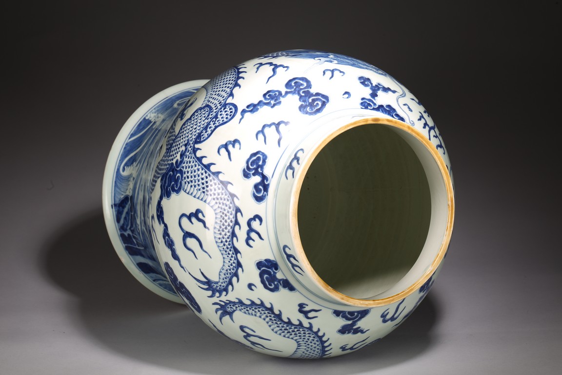 直口,鼓腹漸下收,圈足。器身青花滿繪“雲龍紋”,蒼龍於雲氣中騰躍,口齒怒張,鬚髮披散,氣勢磅礡,右前爪前伸追逐前方的火珠,肌肉鼓脹,皆鋒利尖銳,氣勢撼人。其身形於雲氣中時隱時現,將飛龍在天的靈動體現得淋漓盡致,極富藝術表現力。來源: 洛杉磯私人藏家收藏 Provenance: Private collection, Los Angeles