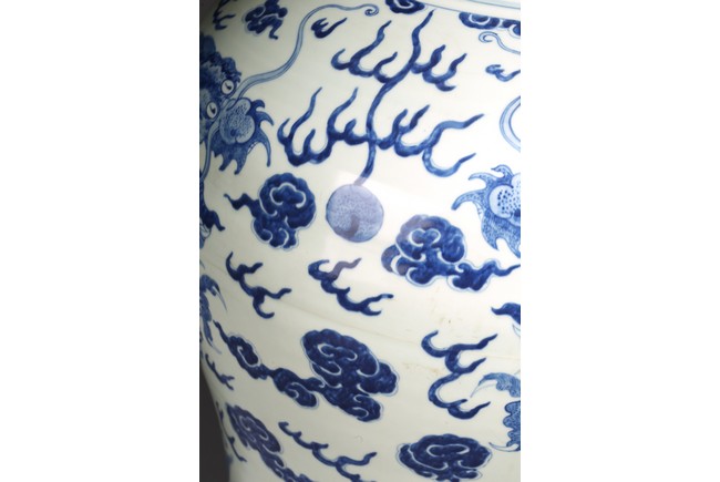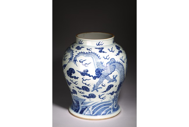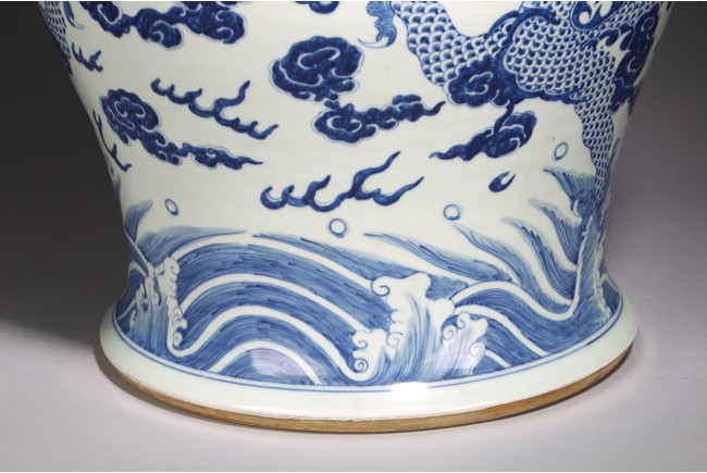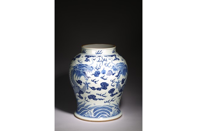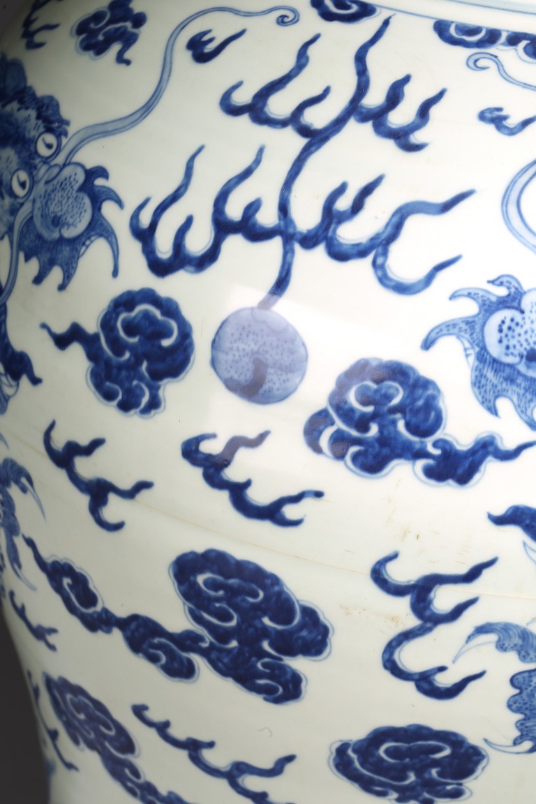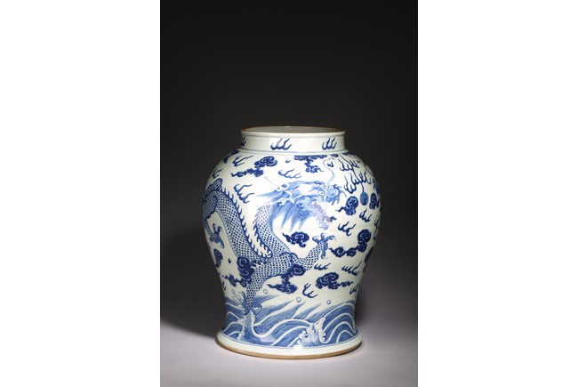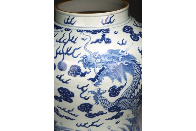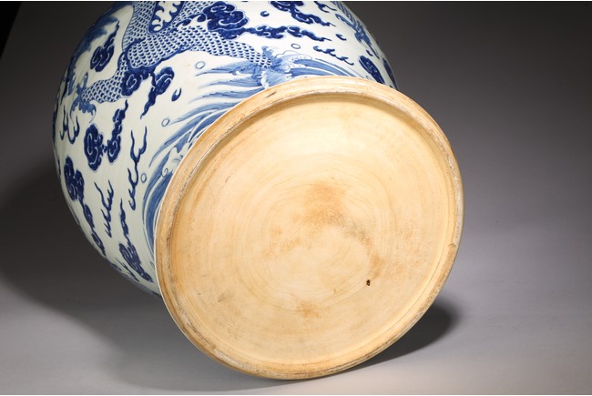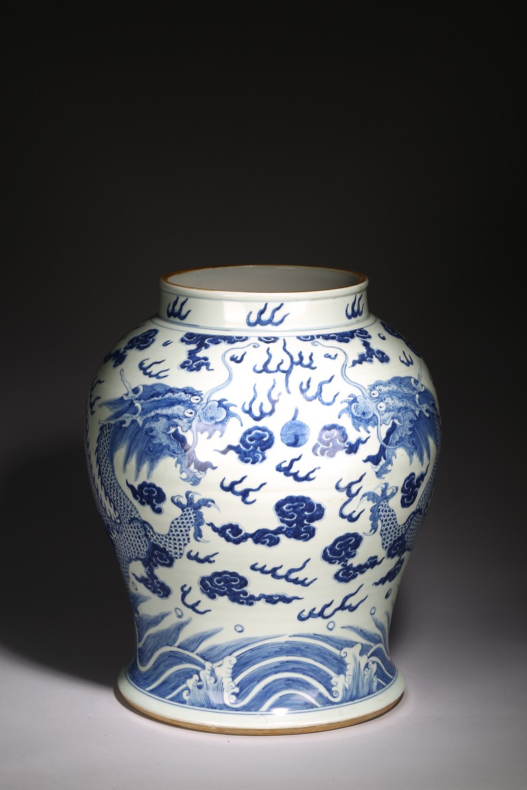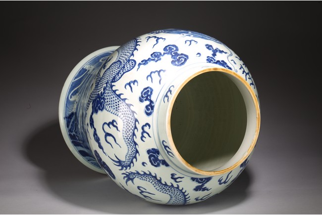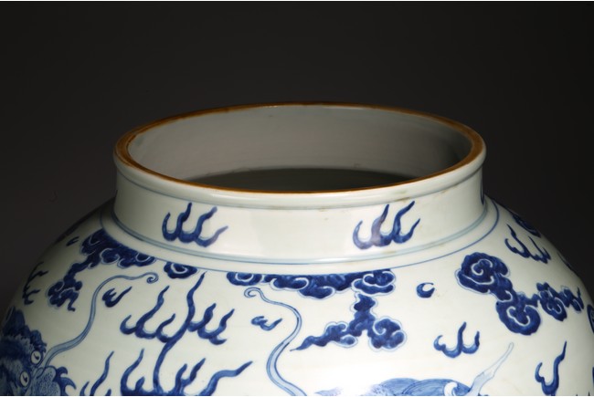 直口,鼓腹漸下收,圈足。器身青花滿繪“雲龍紋”,蒼龍於雲氣中騰躍,口齒怒張,鬚髮披散,氣勢磅礡,右前爪前伸追逐前方的火珠,肌肉鼓脹,皆鋒利尖銳,氣勢撼人。其身形於雲氣中時隱時現,將飛龍在天的靈動體現得淋漓盡致,極富藝術表現力。來源: 洛杉磯私人藏家收藏 Provenance: Private collection, Los Angeles