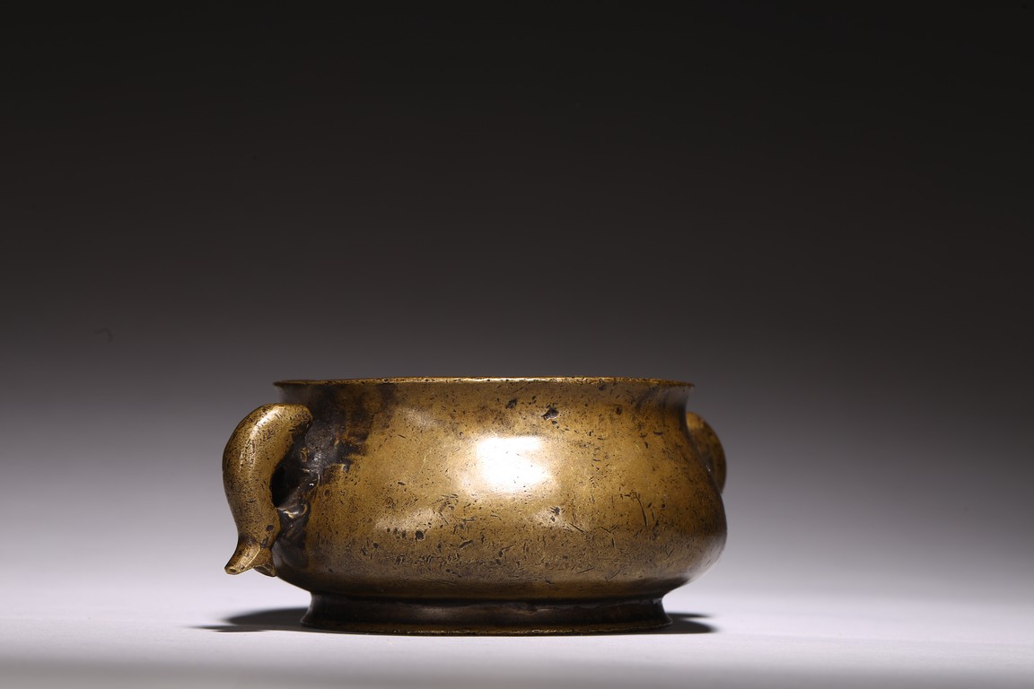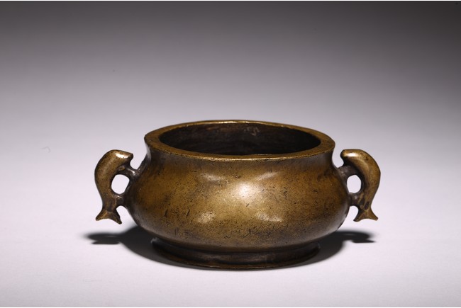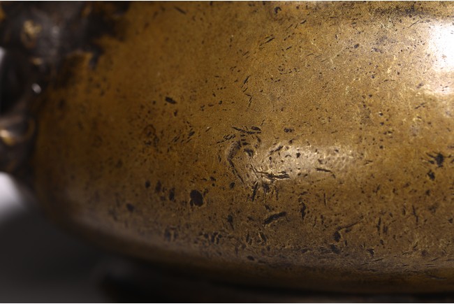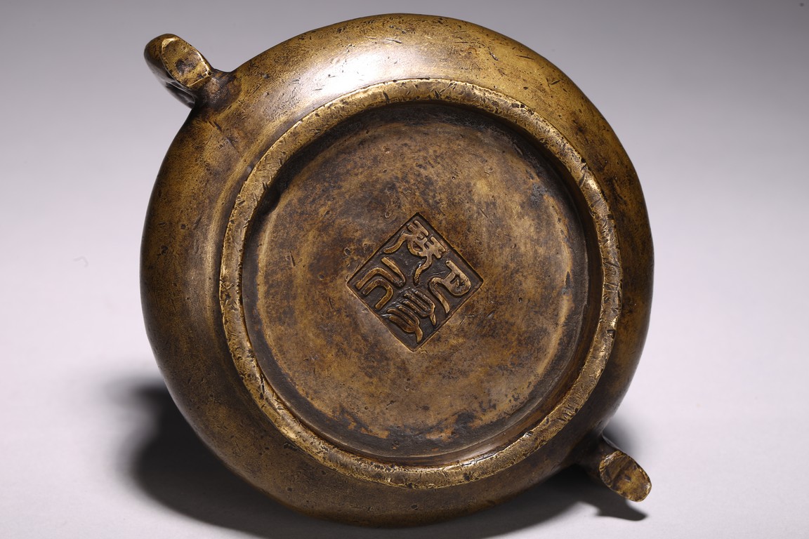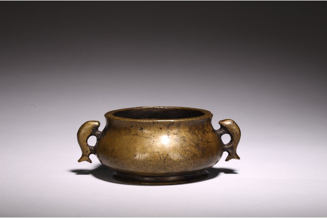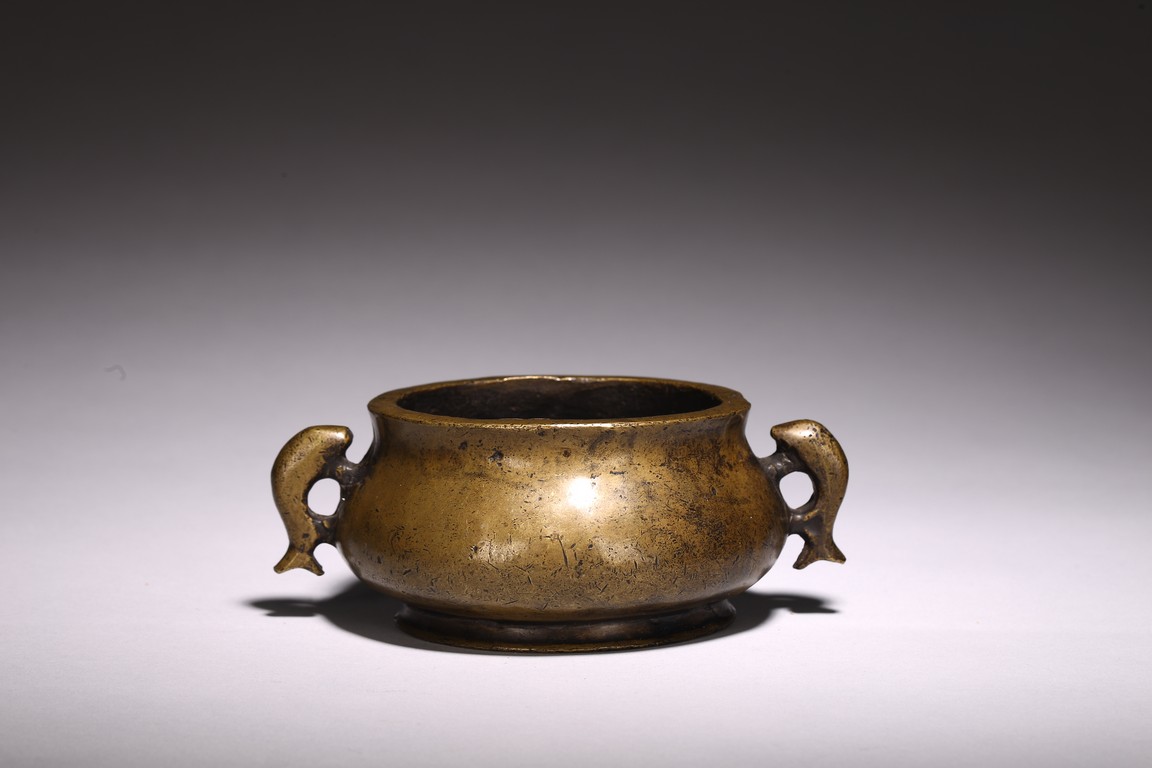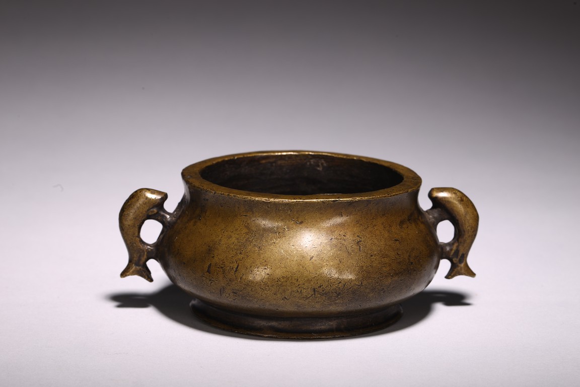 Chinese. of compressed globular form flanked by fish handles, the base cast with four character mark. Qing Dynasty period.