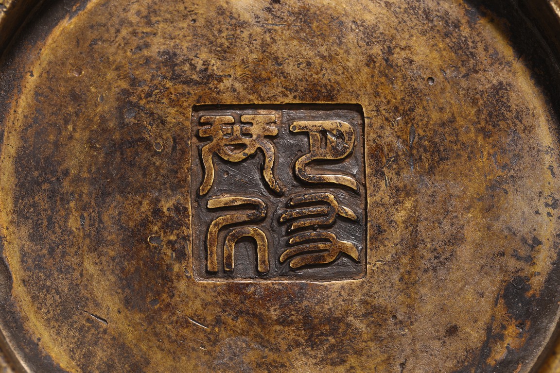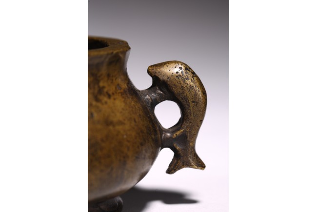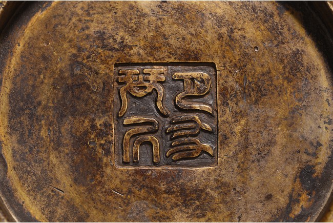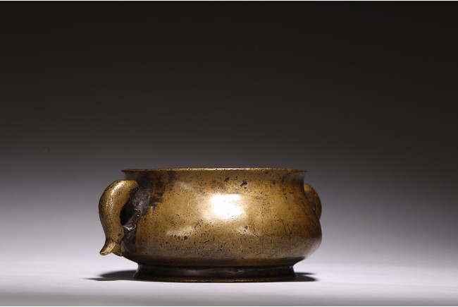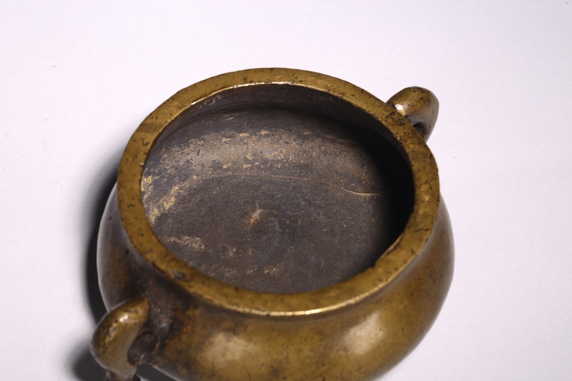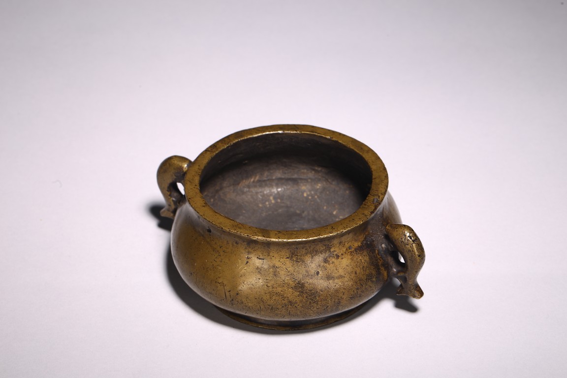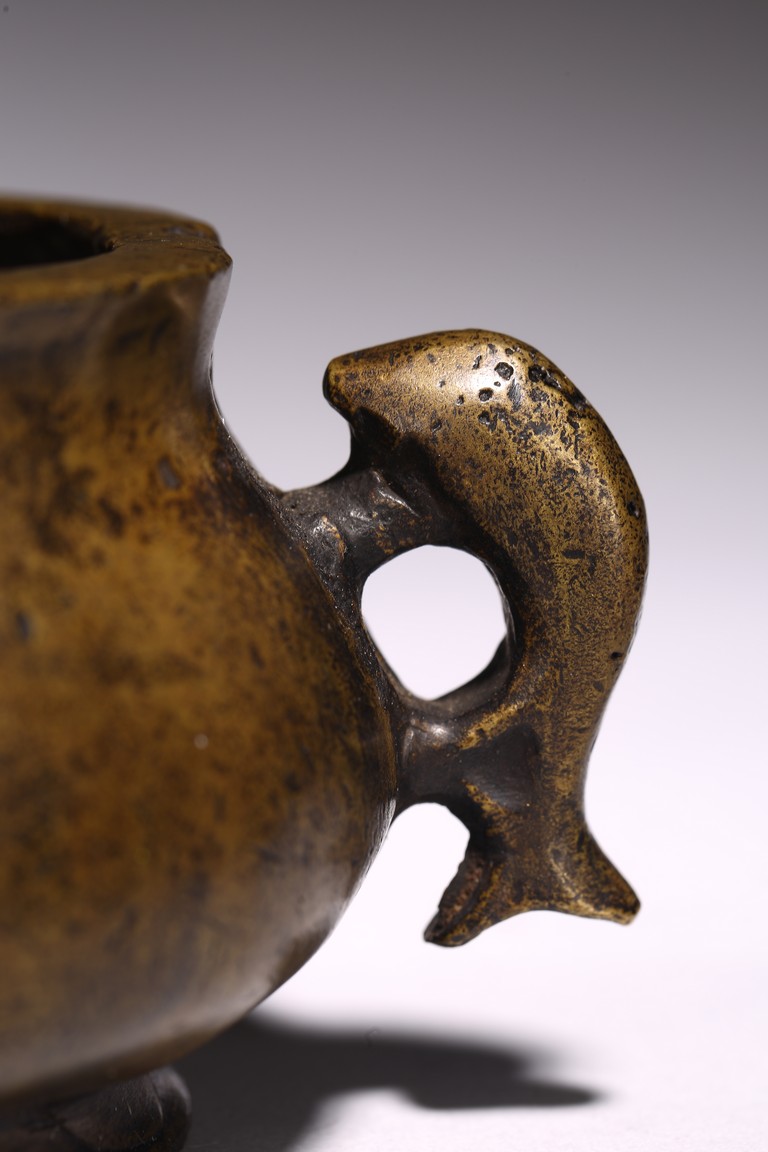 Chinese. of compressed globular form flanked by fish handles, the base cast with four character mark. Qing Dynasty period.