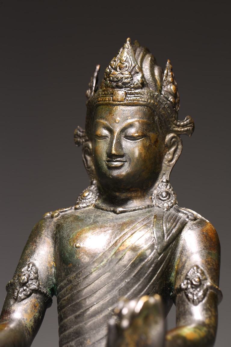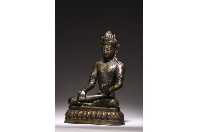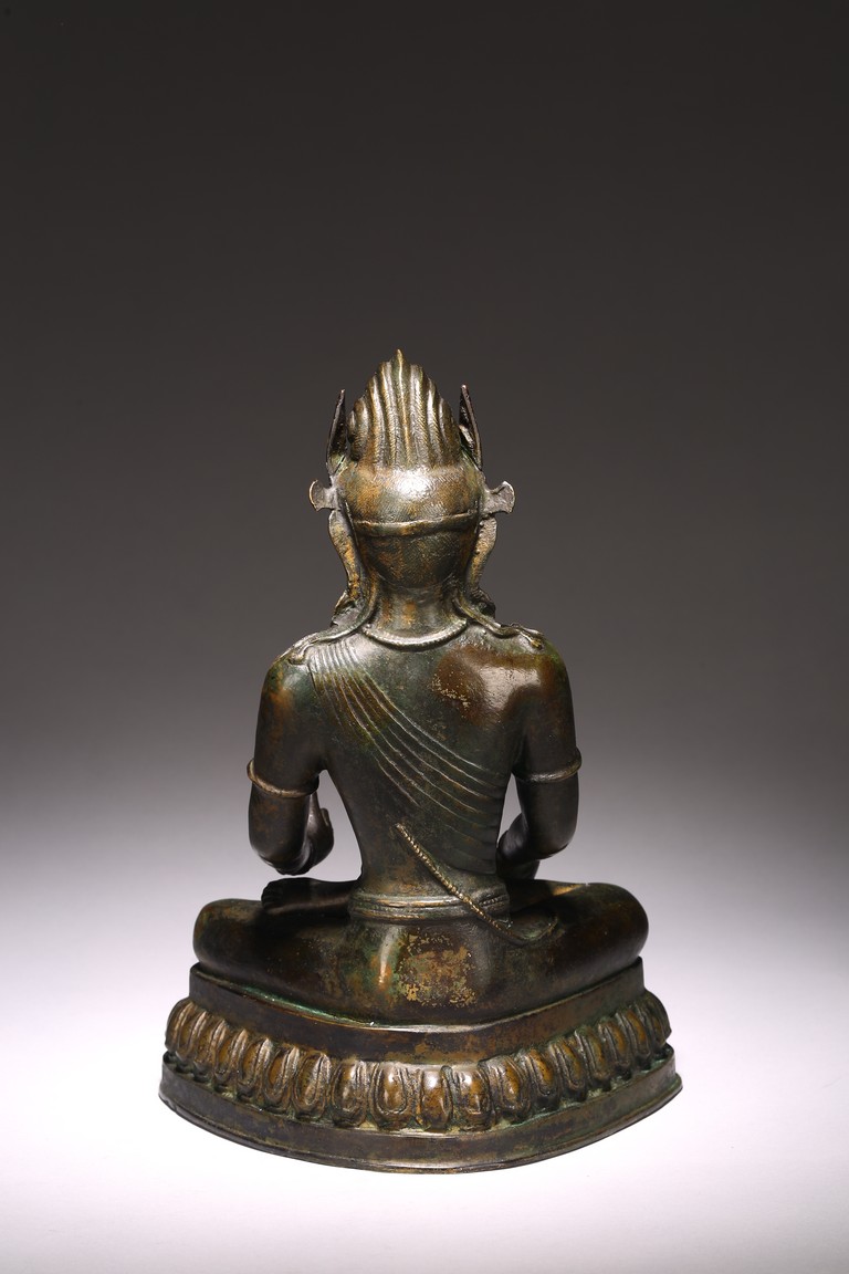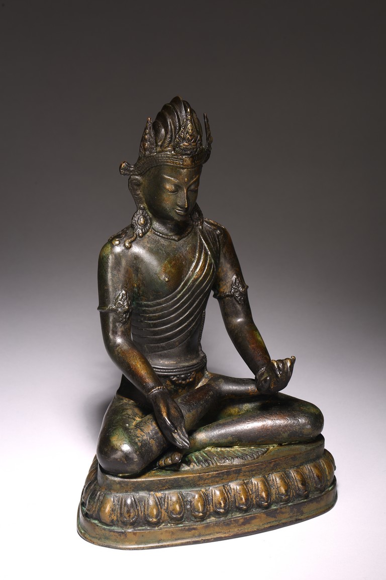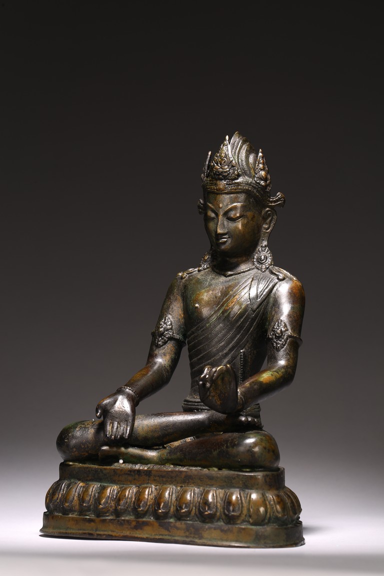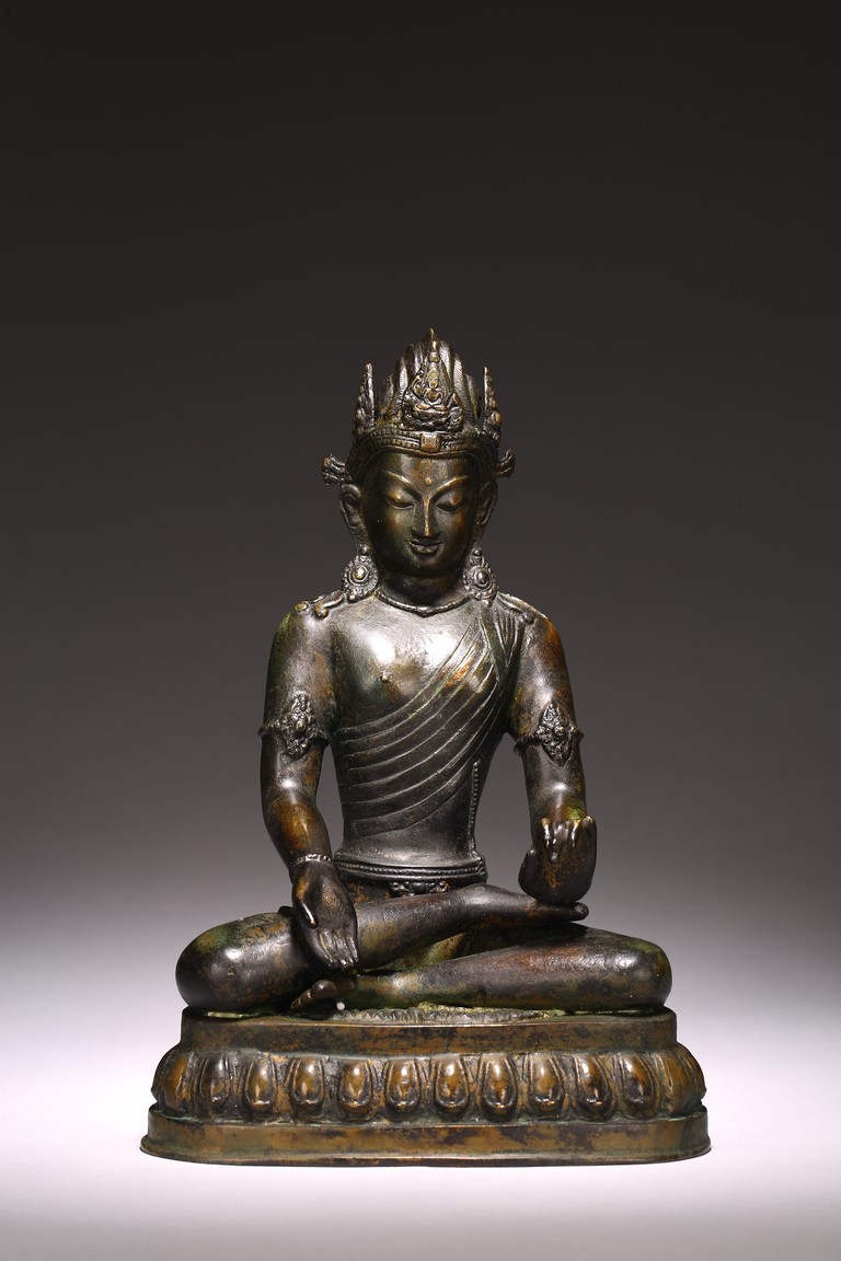 Probably Tibetan. The buddha is shown seated on a lotus throne in dhyanasana, both hands in mutra, dressed in loose robes draped over the left shoulder and leaving the right chest bare, the serene face depicted with downcast eyes, flanked by a pair of pierced pendulous earlobes, wearing pointed crown. 17th century or earlier.