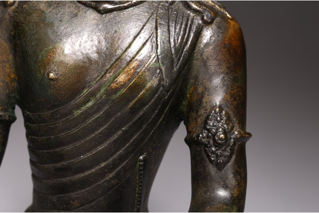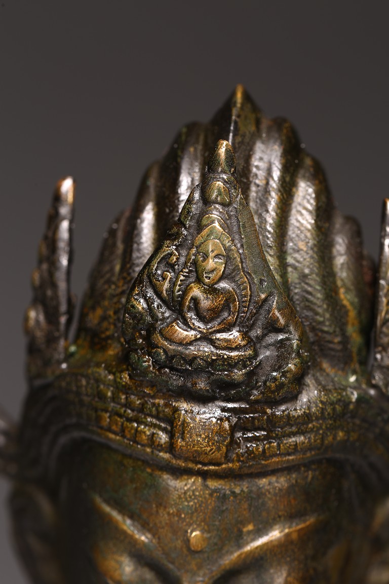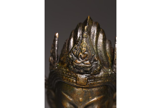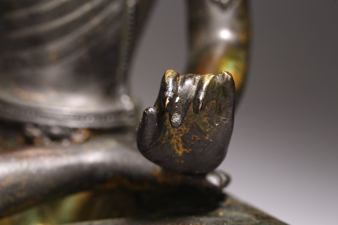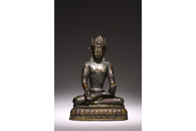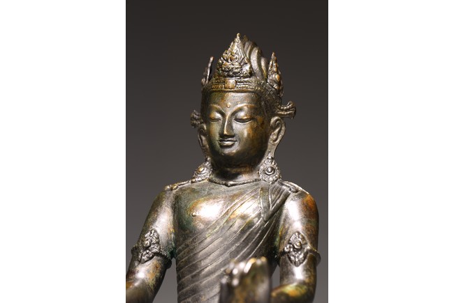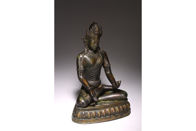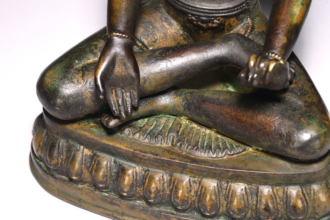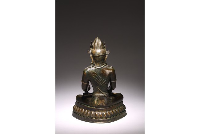 Probably Tibetan. The buddha is shown seated on a lotus throne in dhyanasana, both hands in mutra, dressed in loose robes draped over the left shoulder and leaving the right chest bare, the serene face depicted with downcast eyes, flanked by a pair of pierced pendulous earlobes, wearing pointed crown. 17th century or earlier.