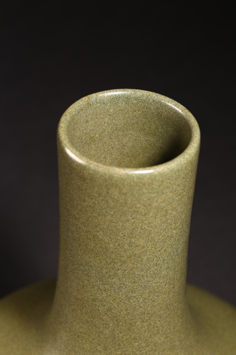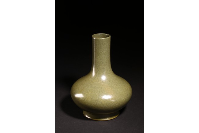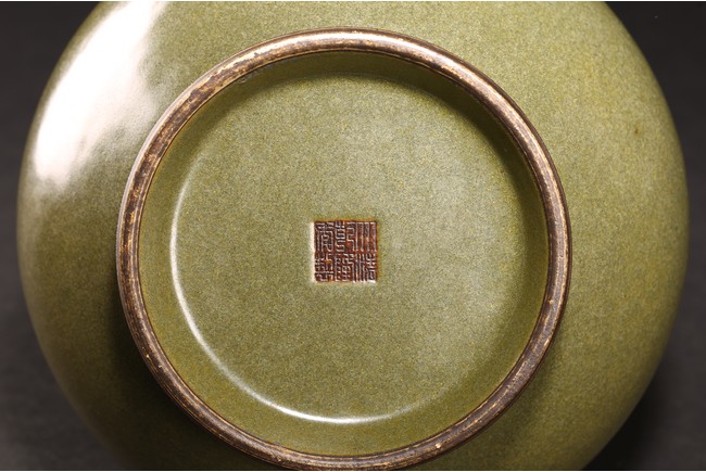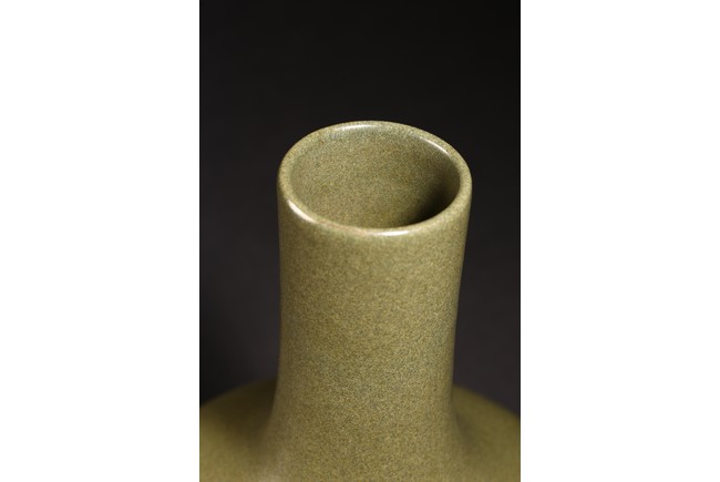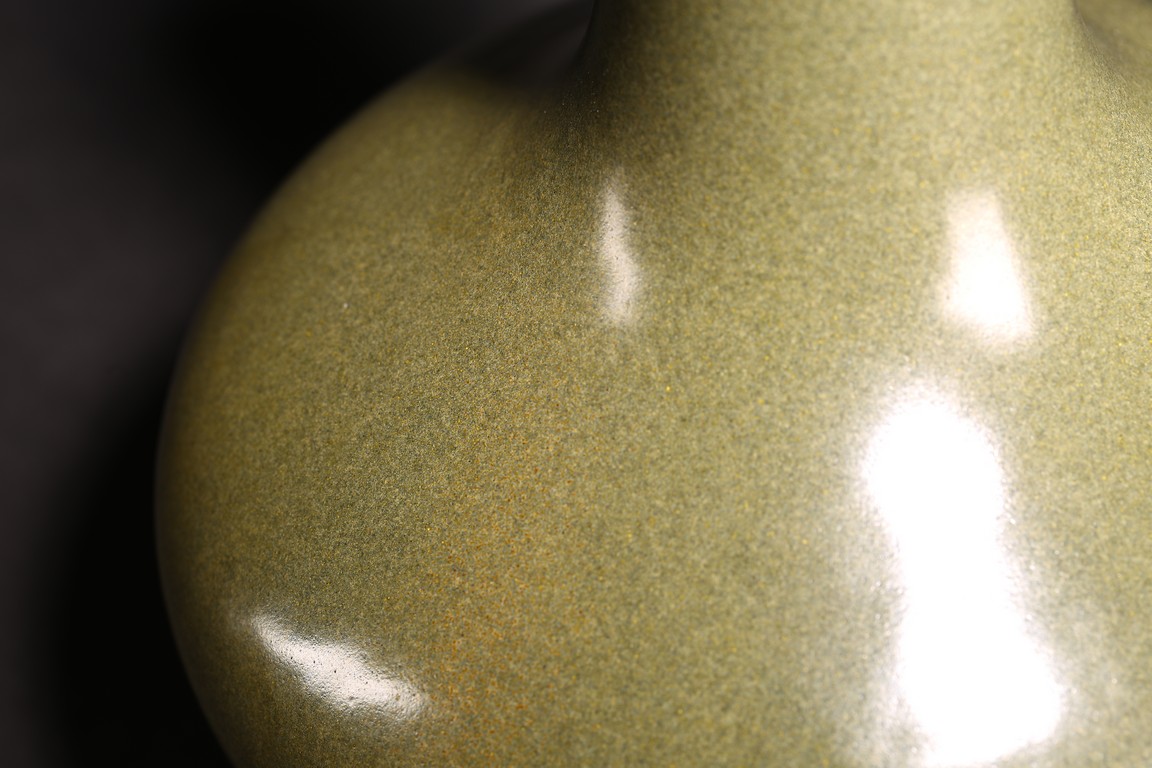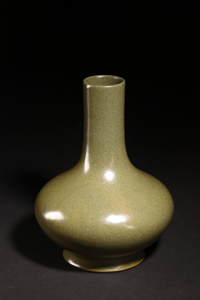 Chinese. of elegant pear shape, well potted with a compressed globular body rising from a short splayed foot to a tubular neck, covered overall in a yellow-speckled olive-green glaze, the base incised with a six-character 'Qianlong' reign seal mark dressed beneath a brown slip. Qing Dynasty Qianlong period. Compare with a similar Teadust glazed vase of Qianlong mark and period, sold in Sotheby's Hong Kong, Oct.2017, Lot 3665, for 1,687,500 HKD.