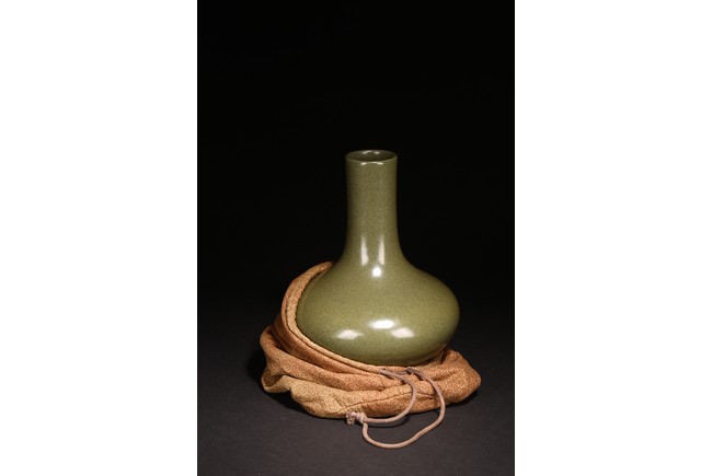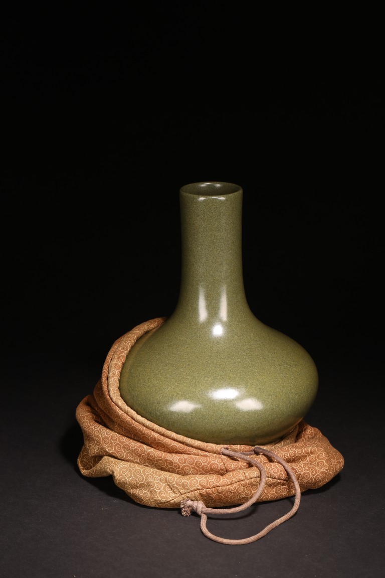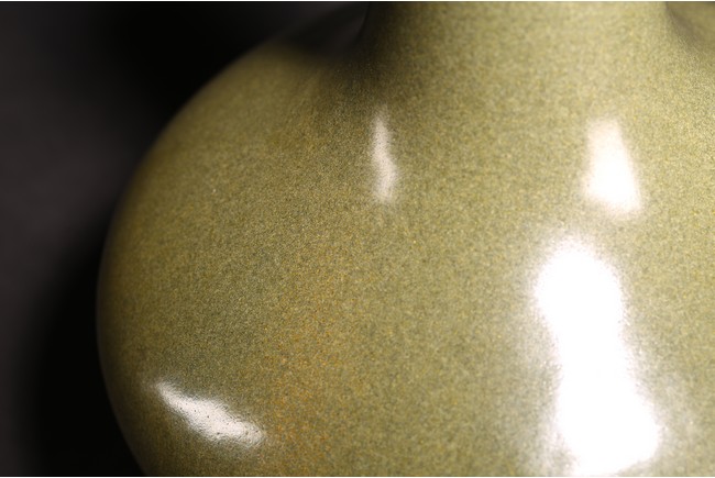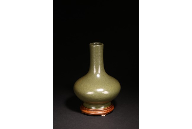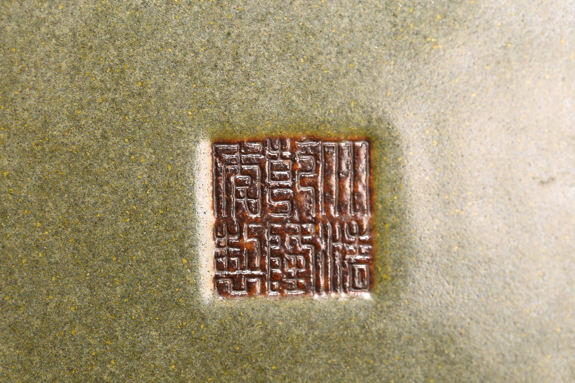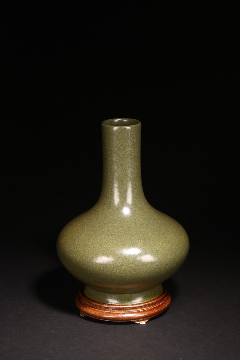 Chinese. of elegant pear shape, well potted with a compressed globular body rising from a short splayed foot to a tubular neck, covered overall in a yellow-speckled olive-green glaze, the base incised with a six-character 'Qianlong' reign seal mark dressed beneath a brown slip. Qing Dynasty Qianlong period. Compare with a similar Teadust glazed vase of Qianlong mark and period, sold in Sotheby's Hong Kong, Oct.2017, Lot 3665, for 1,687,500 HKD.