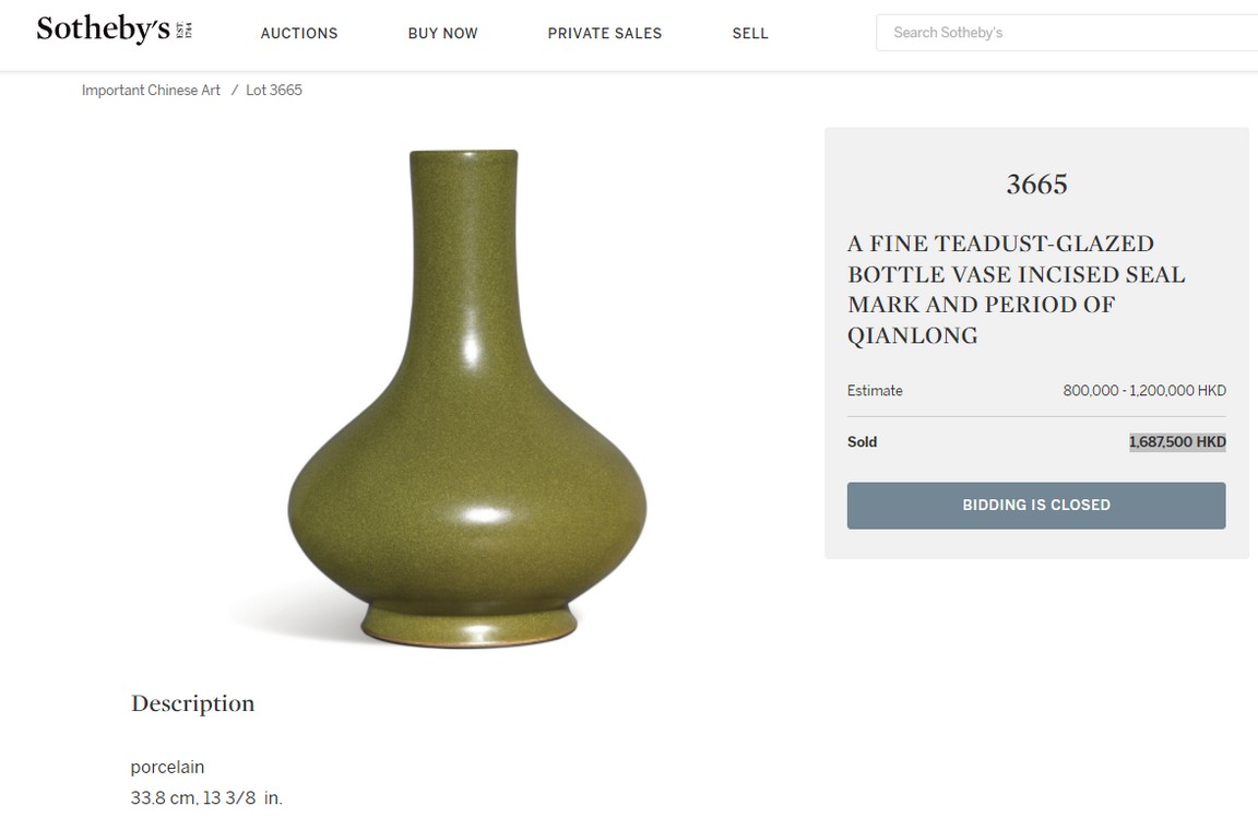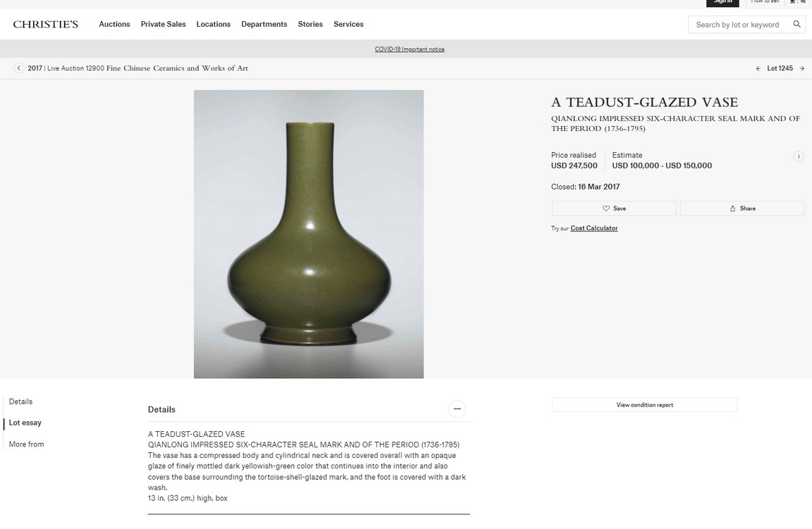 直頸長頎、溜肩、扁鼓腹,底承圈足,底部正中落“大清乾隆年制”六字篆書款。器形飽滿端正,重心下移,愈顯豐腴大方。整器通體施茶葉末釉,釉質潤澤,釉色勻凈而深沉。此器瓶為清宮瓷器燒造的傳統形制之一,始於康熙朝,而尤盛於乾隆。因器形似荸薺而得名。此瓶造型端莊規整,釉質釉色靜穆,盡顯大氣雅緻。清代茶葉末釉製品多為景德鎮官窯所燒,傳世品中,以雍正和乾隆時期最多見,並以乾隆時的燒製最為成功。可參考一尊大小一致的清乾隆茶葉末瓶,成交價$247,500, 拍品號1245,佳士得紐約2017年3月16日;另一尊成交價港幣1687500, 蘇富比香港2017年10月,拍品號3665。文獻記載類似乾隆款茶葉末瓶可參考R. Kerr著《Chinese Ceramics, Porcelain of the Qing Dynasty, 1644-1911》 London, 1986, 第25號來源: 洛杉磯私人收藏, 購於康州著名古董商Donald A. Rich Antiques Provenance: Private collection, Los Angeles, acquired from Donald A. Rich Antiques, Connecticut.