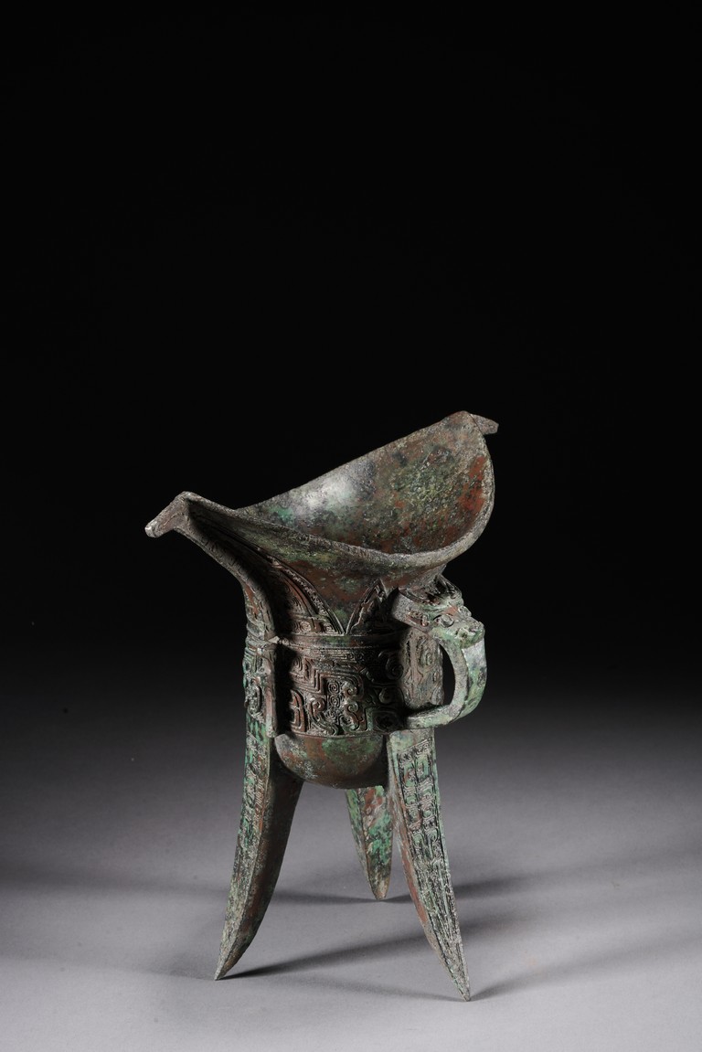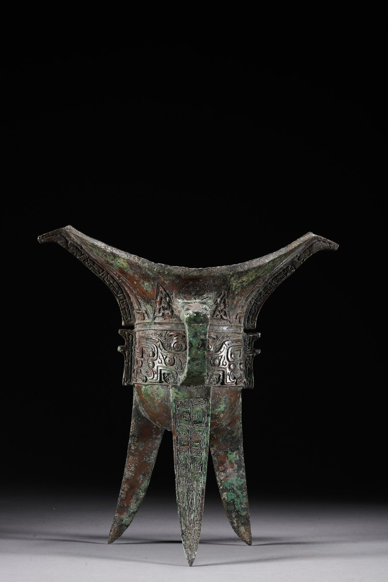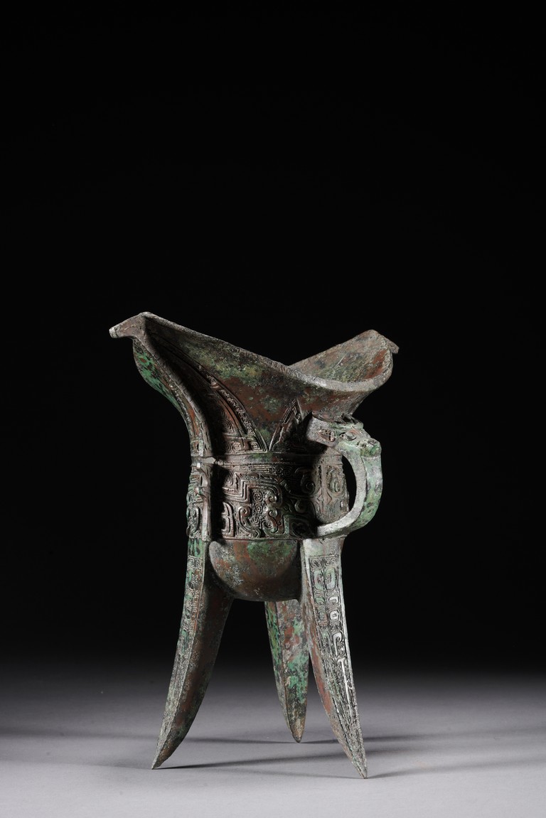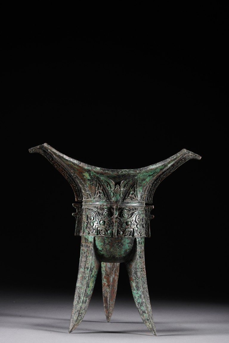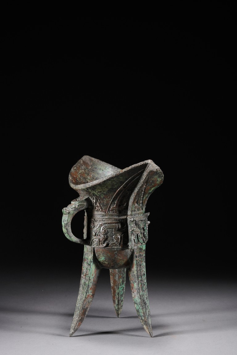 爵杯胎體厚重,色澤古樸,腹部獸面紋飾,紋理精細,線條犀利,製作精湛,大氣磅礴。
