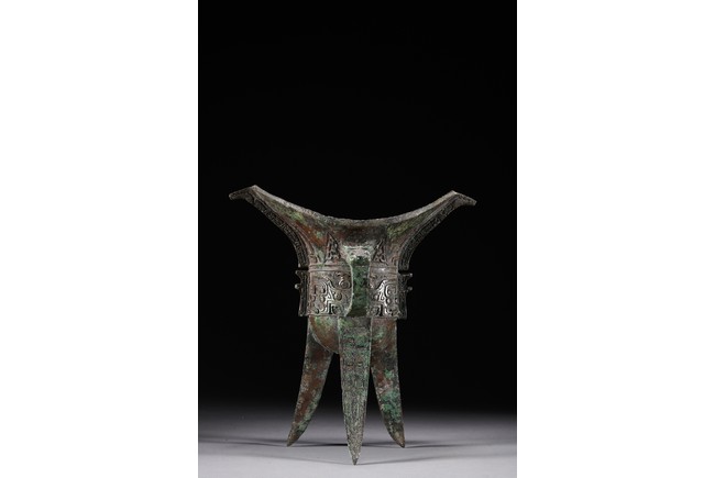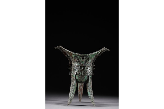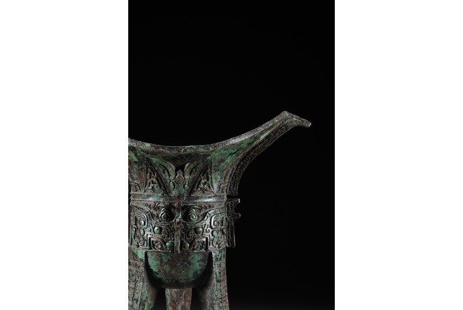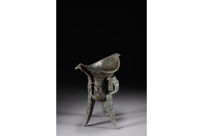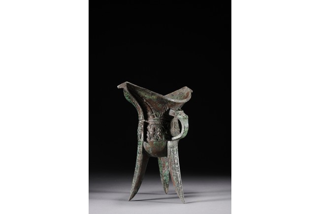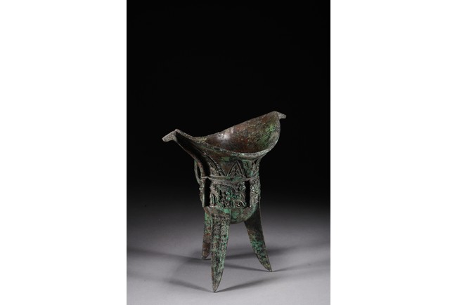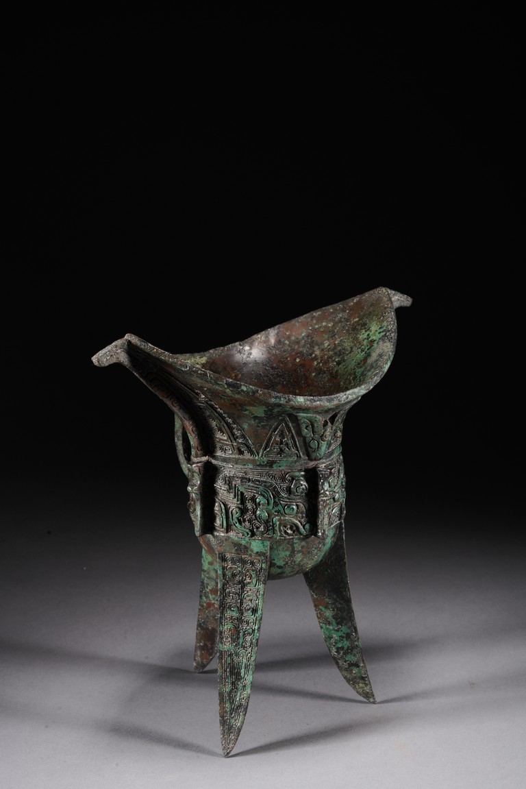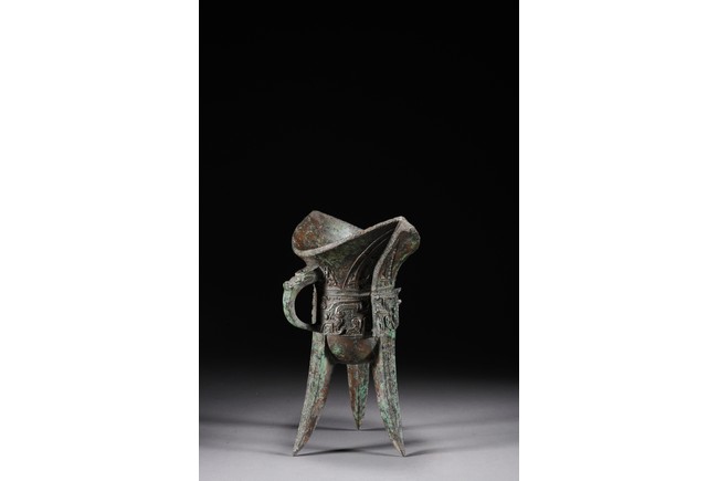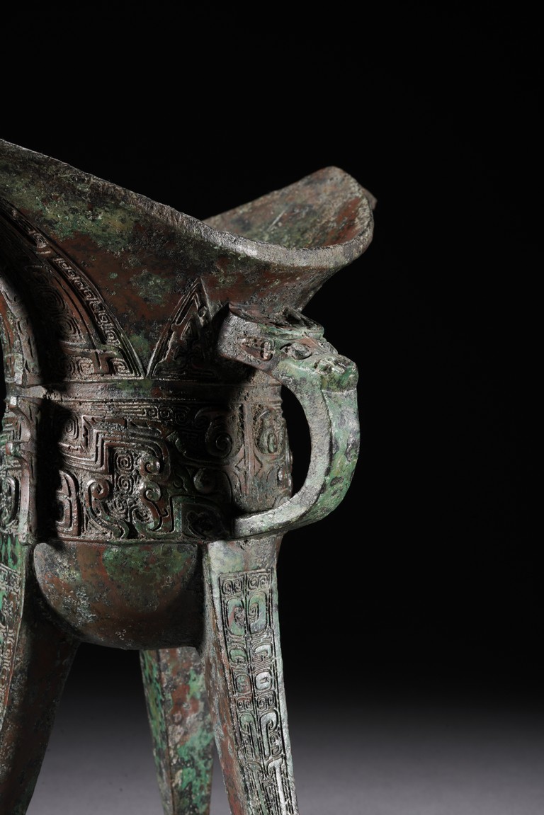 爵杯胎體厚重,色澤古樸,腹部獸面紋飾,紋理精細,線條犀利,製作精湛,大氣磅礴。