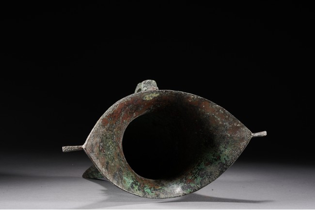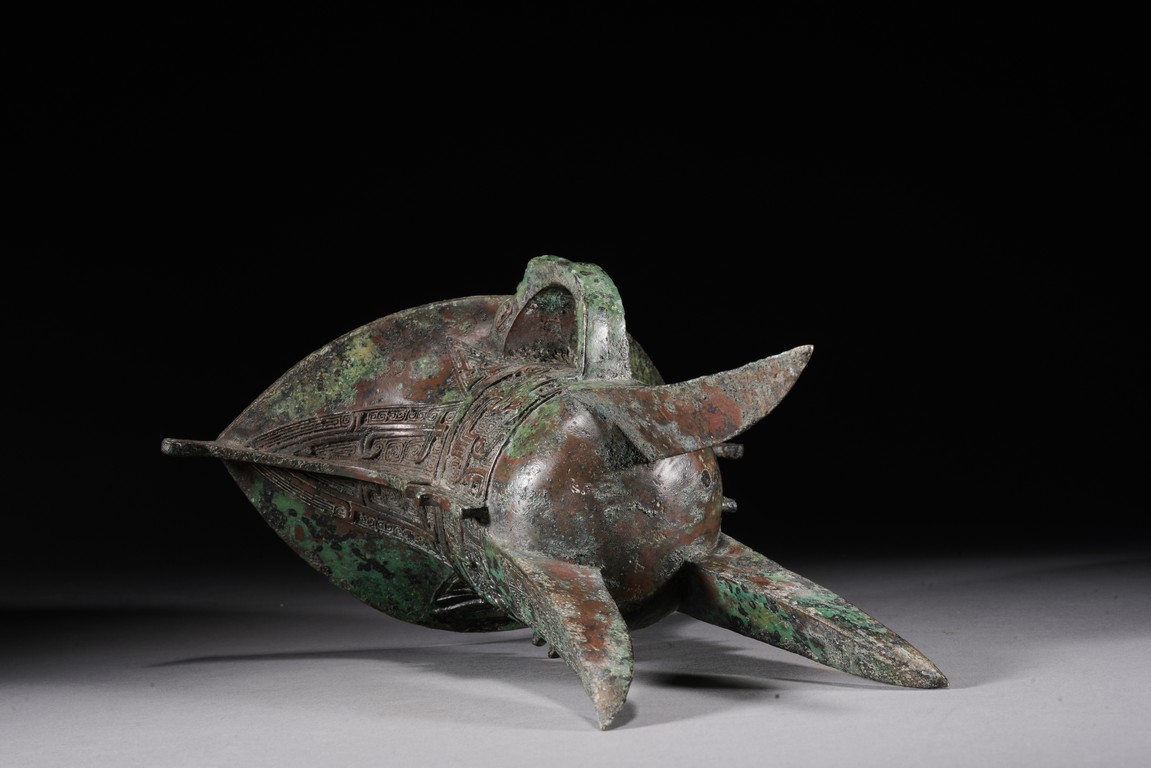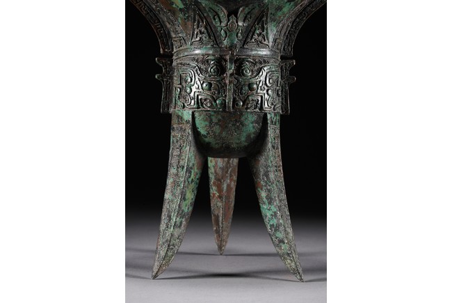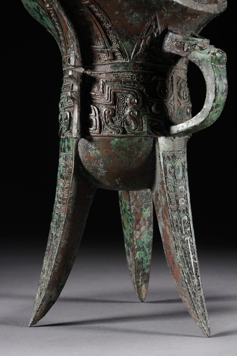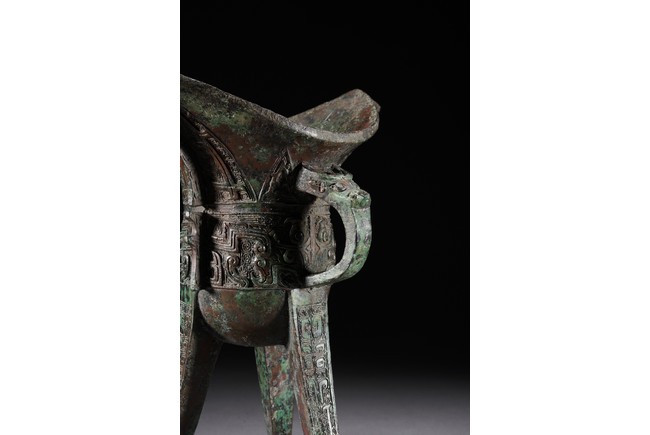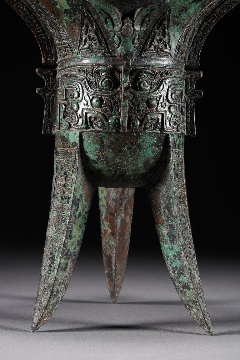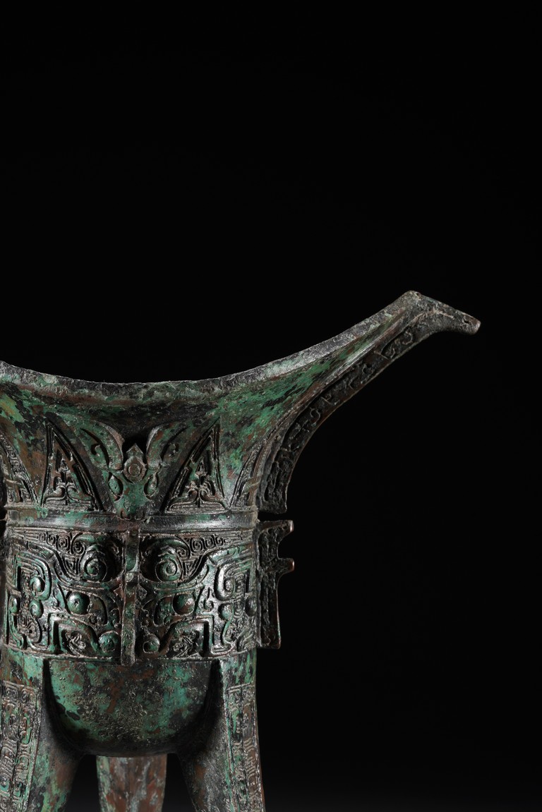 The vessel rests on three arched legs in the shape of triangular blades. The belly decorated with taotie masks on a leiwen background. Its handle is embellished with a bovine head.