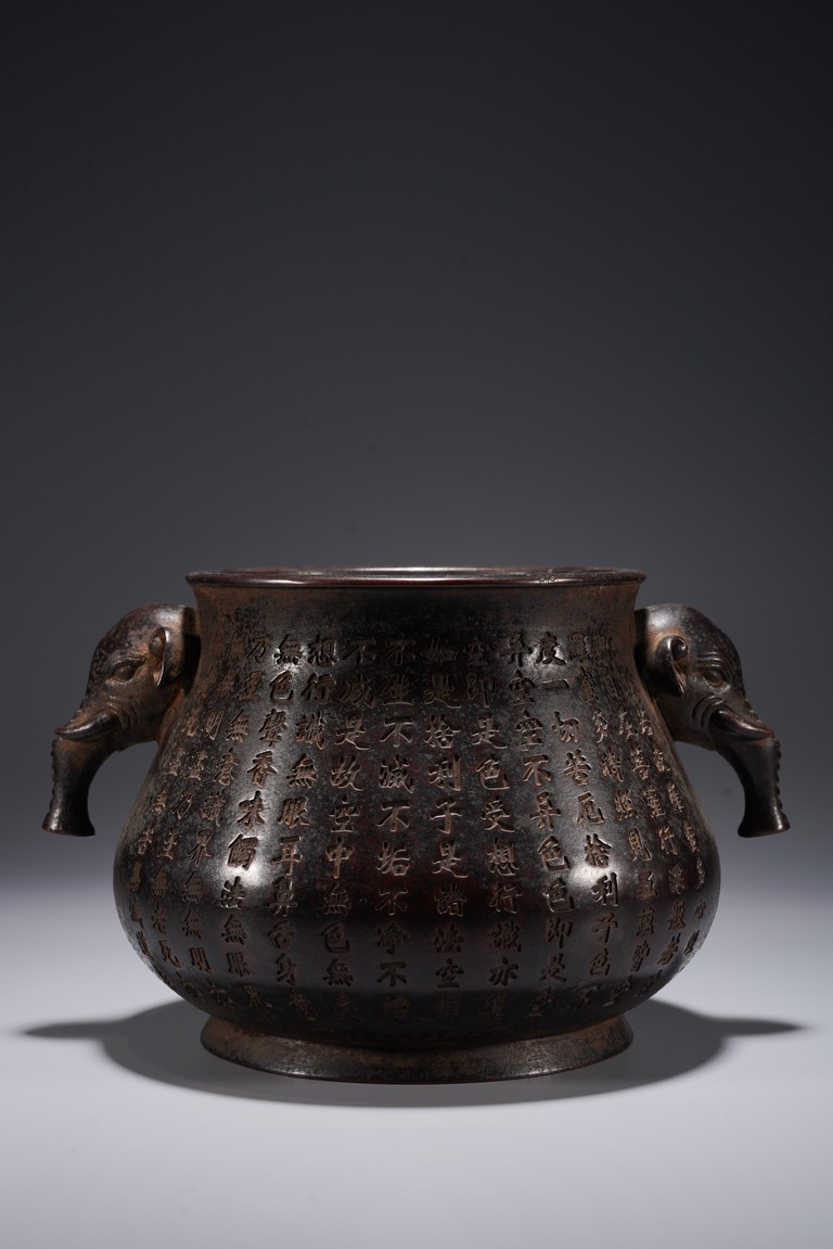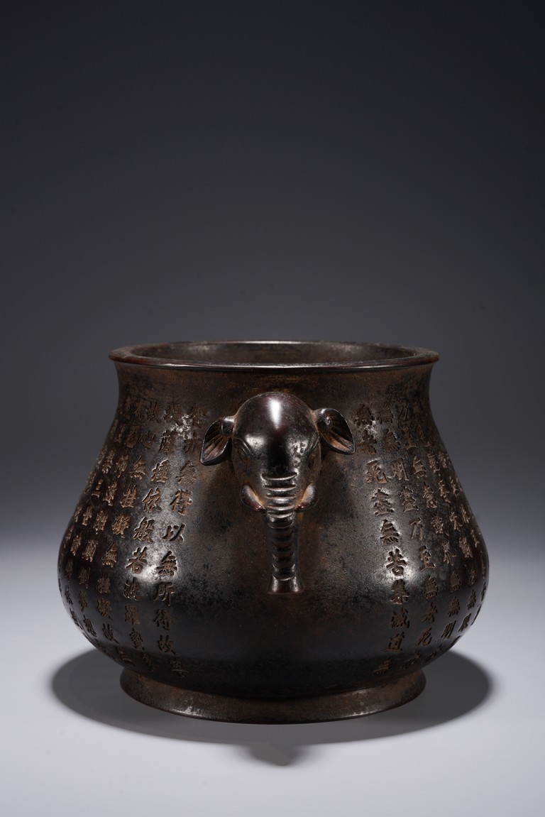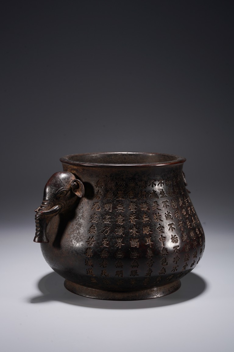 平沿,撇口,墩腹,圈沿撇足,肩部鏤塑象耳對耳。爐制飽圓端樸,包漿厚澤自然,周身攢刻經文。