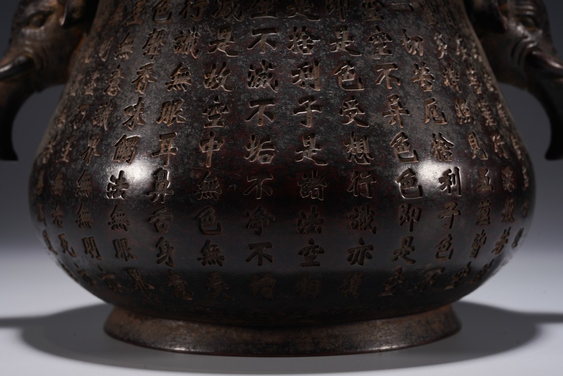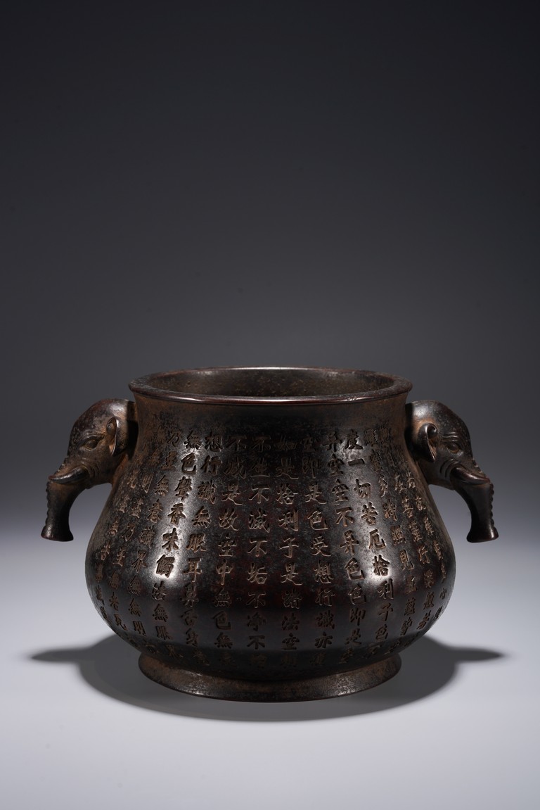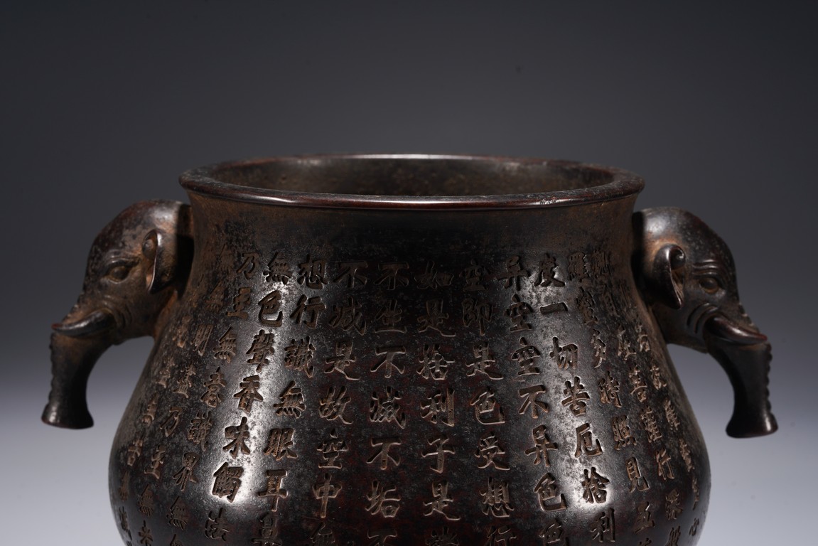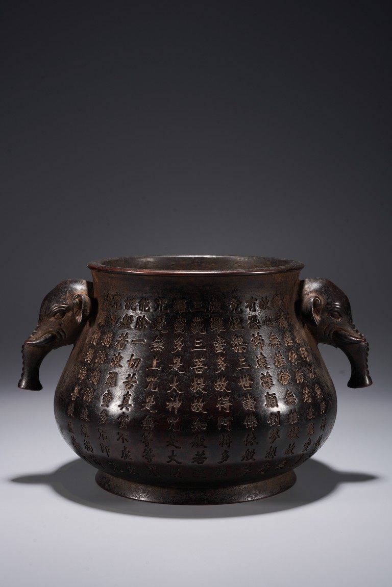 平沿,撇口,墩腹,圈沿撇足,肩部鏤塑象耳對耳。爐制飽圓端樸,包漿厚澤自然,周身攢刻經文。