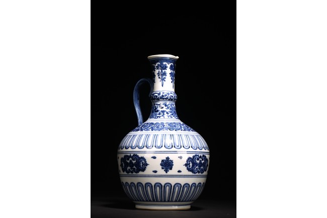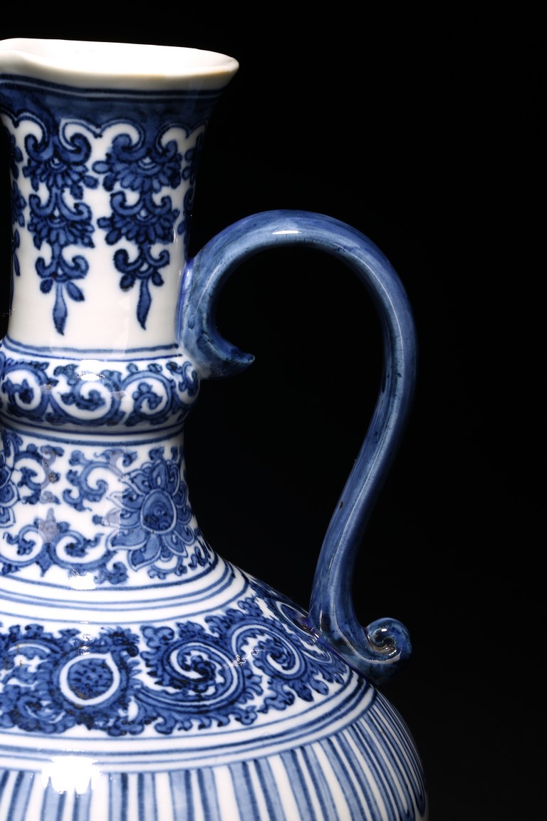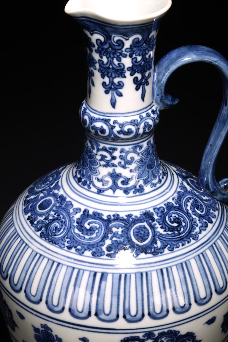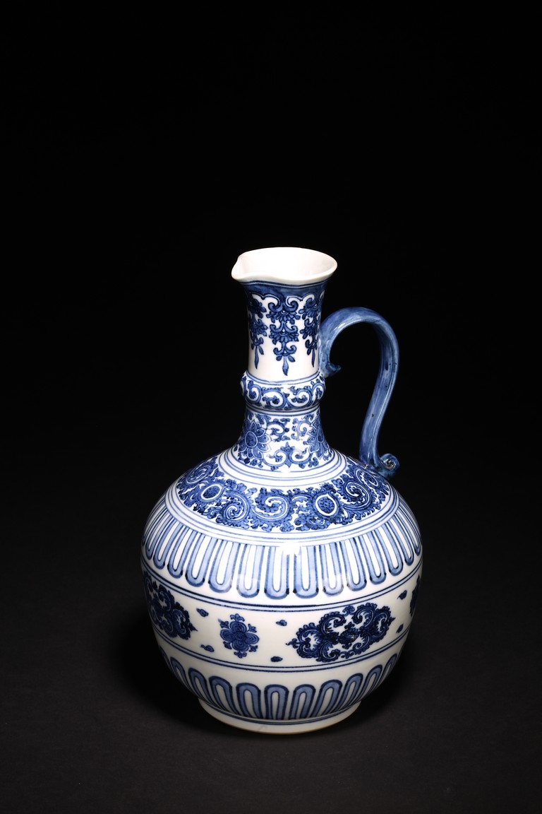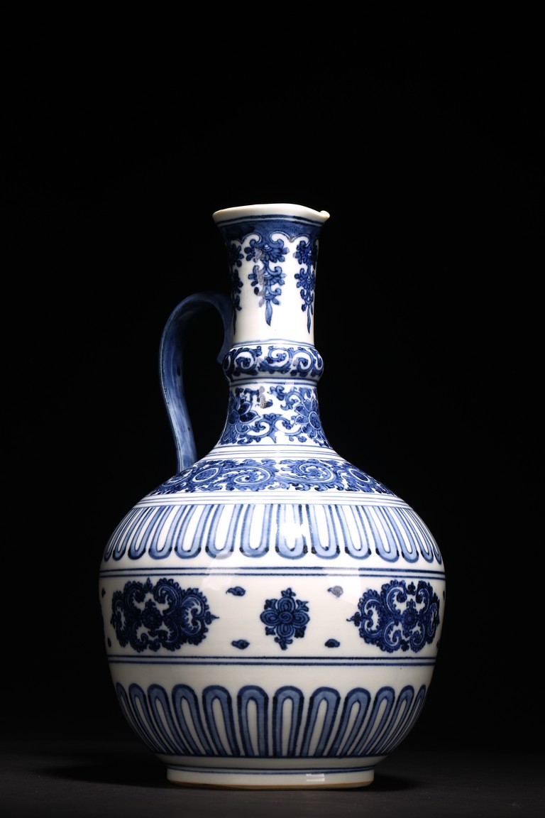 花澆形狀源於對西亞銅器的慕仿,流行於明代永樂宣德時期,清代雍正時期的花澆造型雖有追慕永宣之意,但比例更顯得穩重大方,和諧優雅。花澆敞口有流,細長頸,斜肩,鼓腹,圈足,頸、肩之間連有曲柄,曲柄線條流暢。通體青花裝飾,口沿下繪‘變形雲頭紋’,頸部中央繪‘卷草紋’,下段繪‘纏枝蓮紋’和‘弦紋’。肩部繪‘捲葉紋’和‘菊瓣紋’,腹部繪‘花卉紋’,近足處繪‘菊瓣紋’。整體造型規整,胎骨堅質細膩,釉質光潤,青花髮色均勻亮麗。 ”大清雍正年制”款識。來源: 洛杉磯私人收藏,早年購於歐洲 Provenance: Private collection, Los Angeles, acquired from a European private colelction