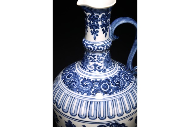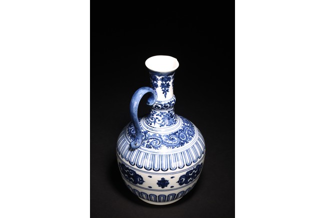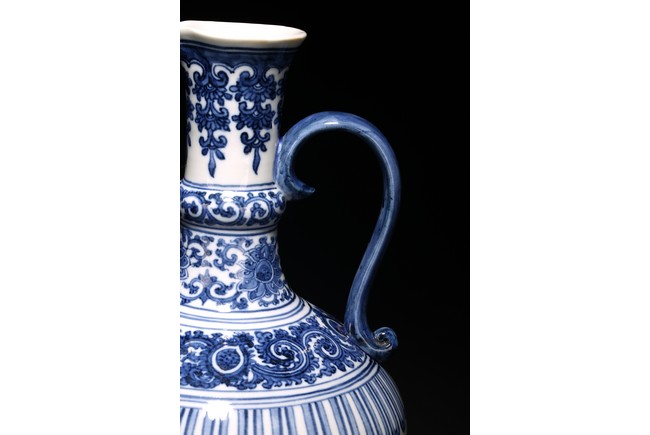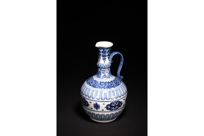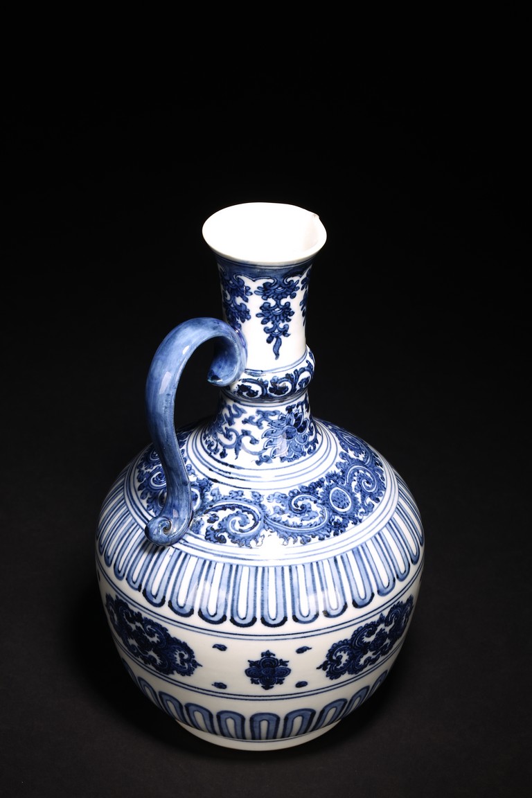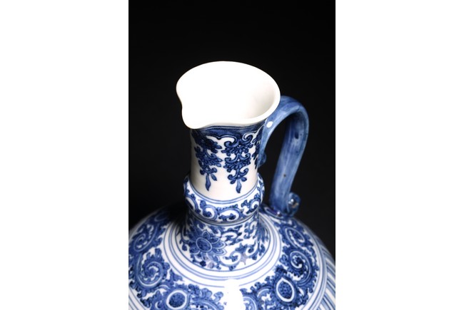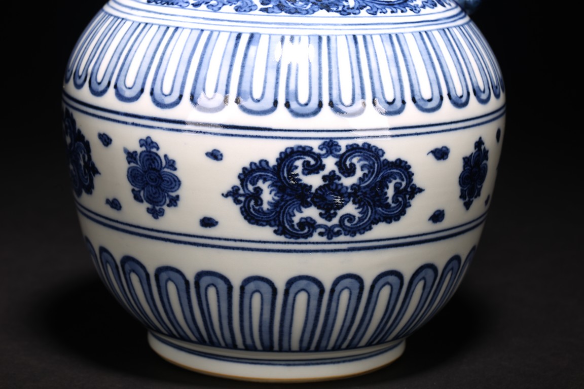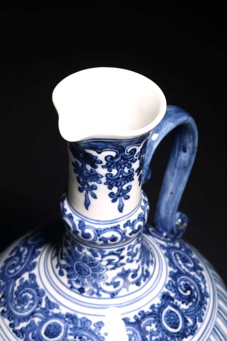 花澆形狀源於對西亞銅器的慕仿,流行於明代永樂宣德時期,清代雍正時期的花澆造型雖有追慕永宣之意,但比例更顯得穩重大方,和諧優雅。花澆敞口有流,細長頸,斜肩,鼓腹,圈足,頸、肩之間連有曲柄,曲柄線條流暢。通體青花裝飾,口沿下繪‘變形雲頭紋’,頸部中央繪‘卷草紋’,下段繪‘纏枝蓮紋’和‘弦紋’。肩部繪‘捲葉紋’和‘菊瓣紋’,腹部繪‘花卉紋’,近足處繪‘菊瓣紋’。整體造型規整,胎骨堅質細膩,釉質光潤,青花髮色均勻亮麗。 ”大清雍正年制”款識。來源: 洛杉磯私人收藏,早年購於歐洲 Provenance: Private collection, Los Angeles, acquired from a European private colelction