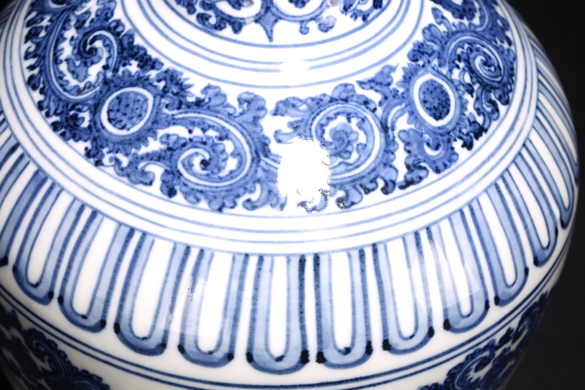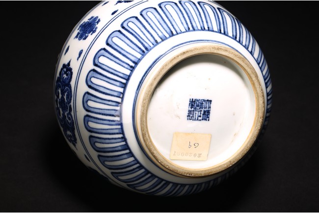 Chinese. The bulbous body applied with a slender shoulder, the body decorated with a band of foliate panels and sprays between two registers of molded chrysanthemum petals, the neck with bands of varying stylized florets, the rim with floral tassels suspending from ruyi heads, the base with a six-character seal mark in underglaze blue. Qing Dynasty period.