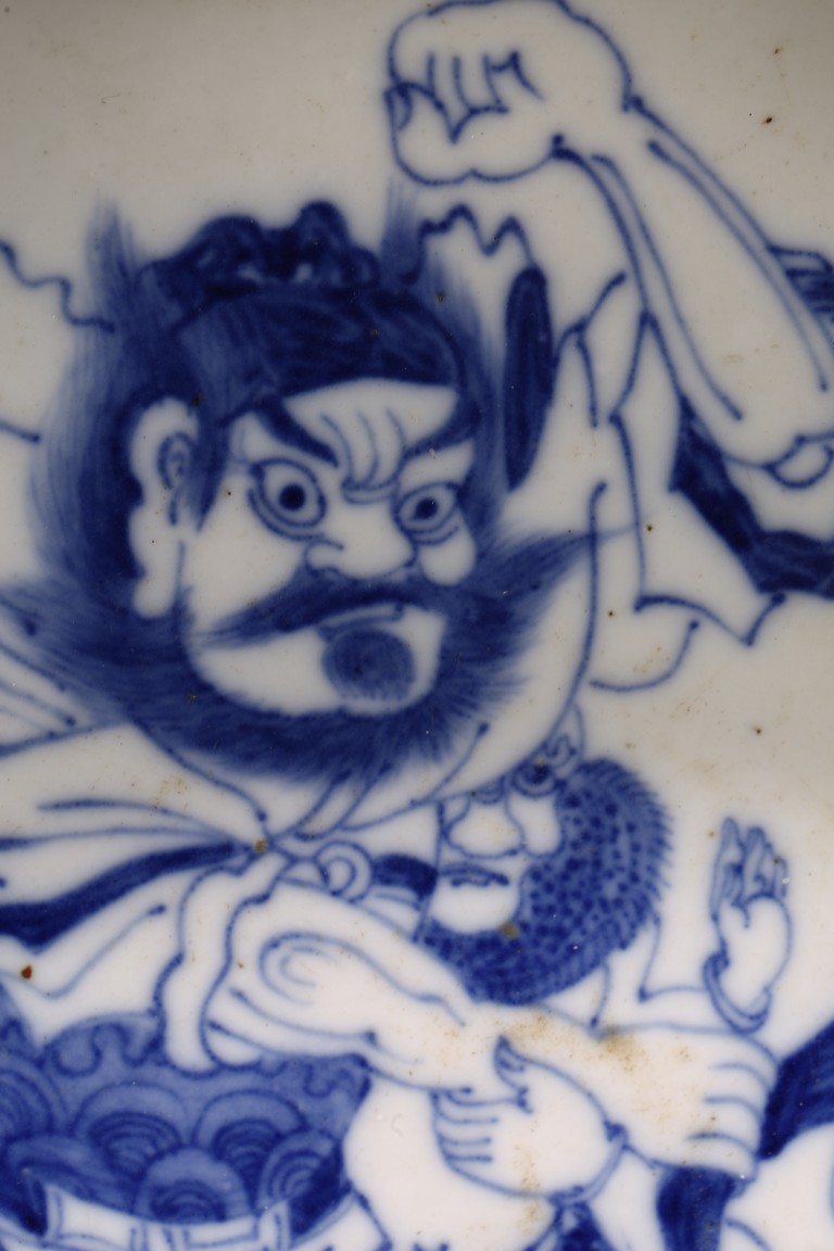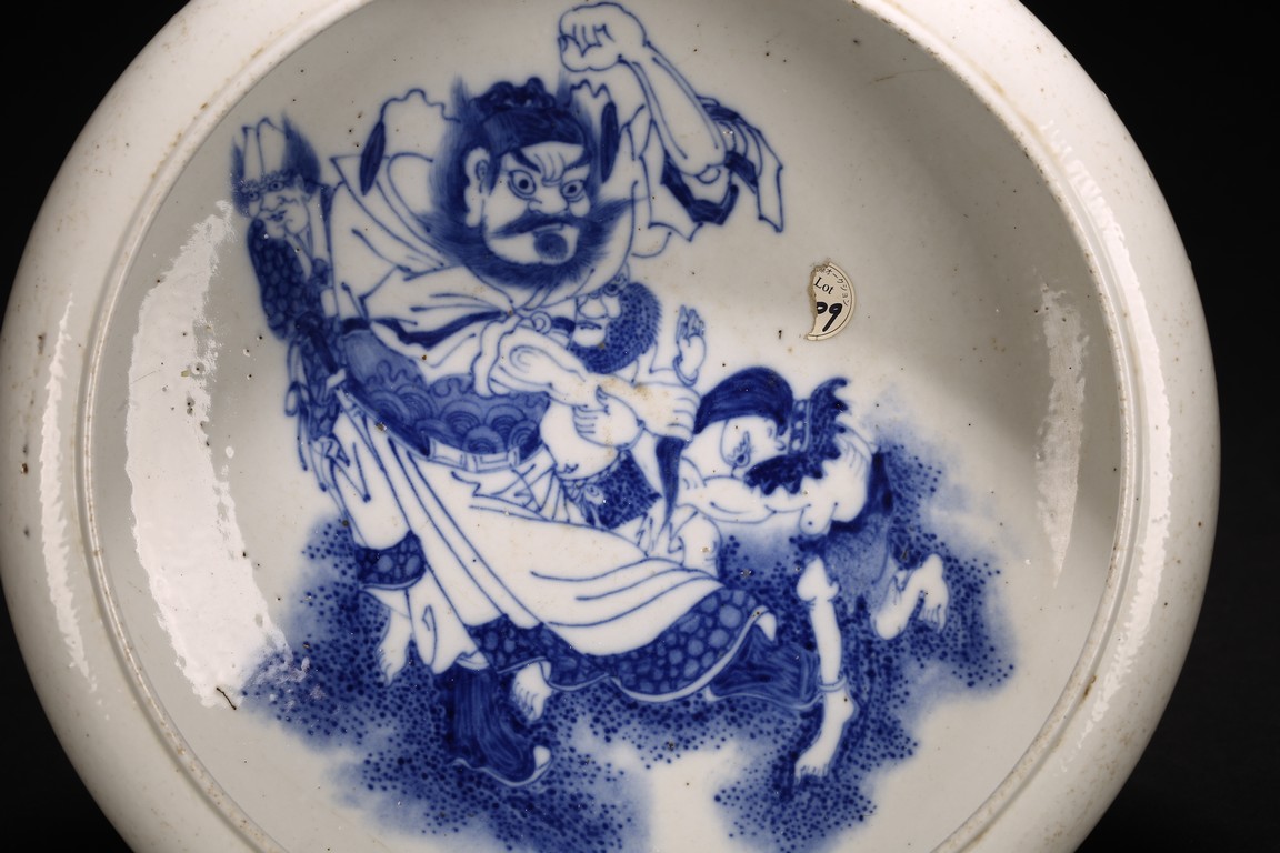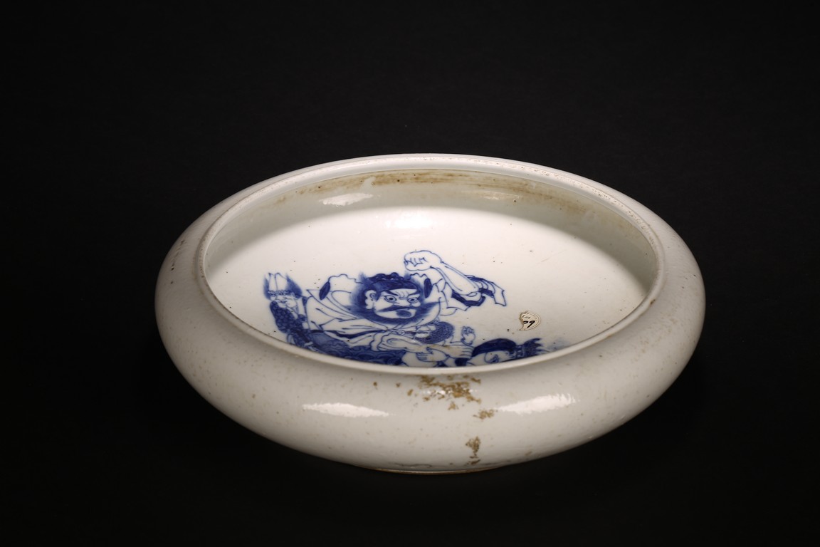 Chinese. The shallow rounded sides rising from short straight foot to a incurved rim, the interior finely painted with the 'Demon Queller' Zhong Kui, the base painted with a double ring. Qing Dynasty period.