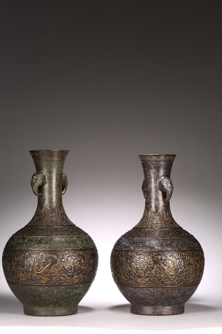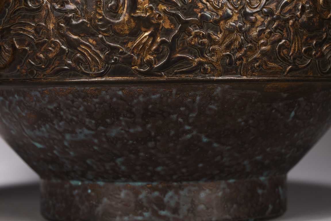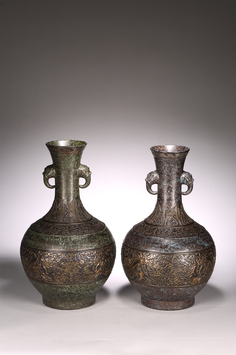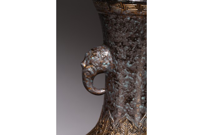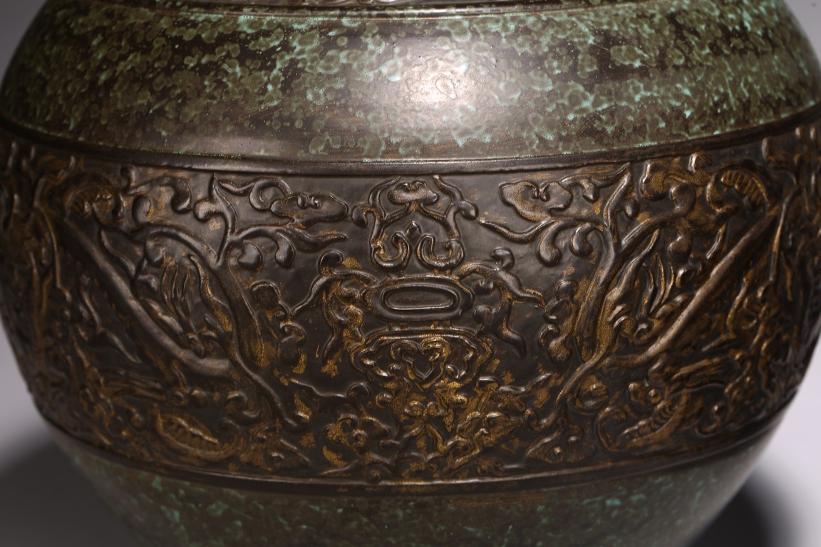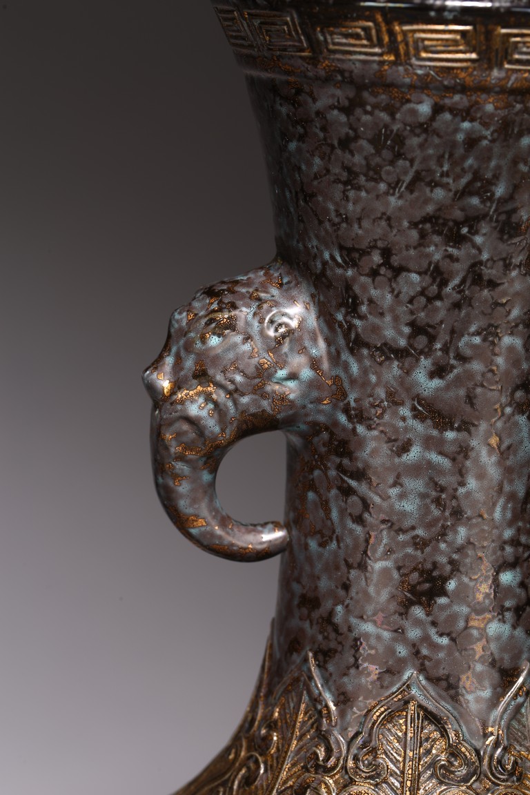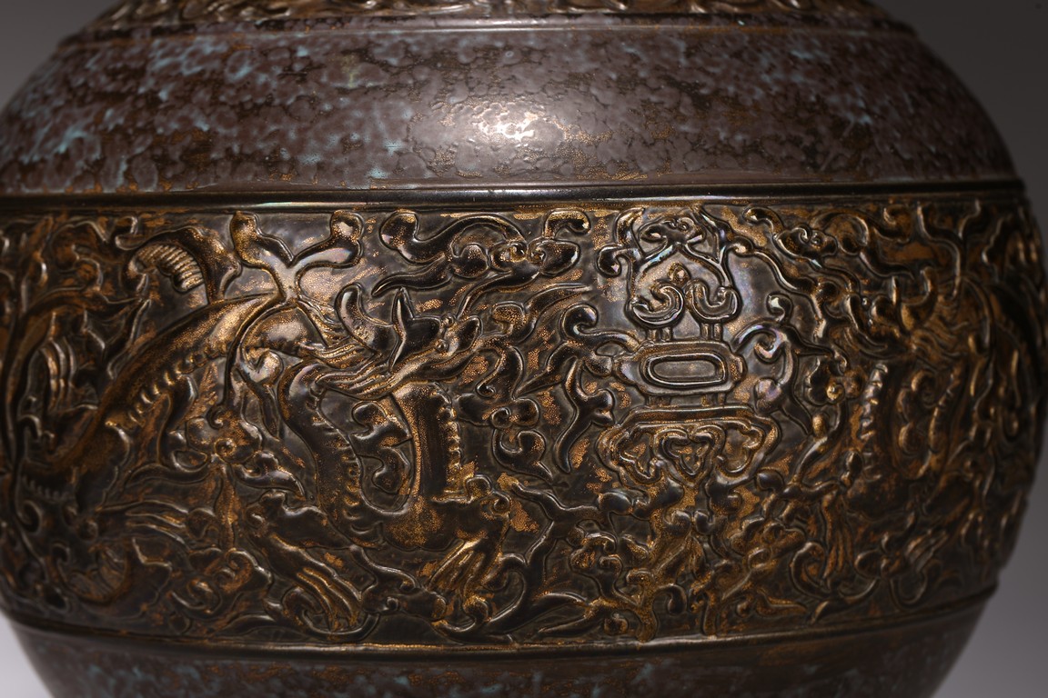 Chinese. The globular body rising from a short straight foot to a tall trumpet neck flanked by pair of beast head handles, the body carved with band of dragons chasing flaming pearl, covered overall in a teadust glaze of brown tone to simulate the patina of bronze, splashed with robin's-egg turquoise and green enamels to mimic encrustation, the base bears reign mark. Qing Dynasty period.