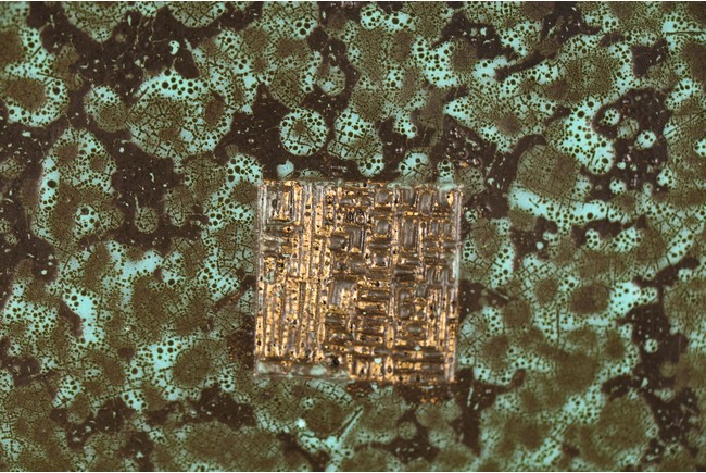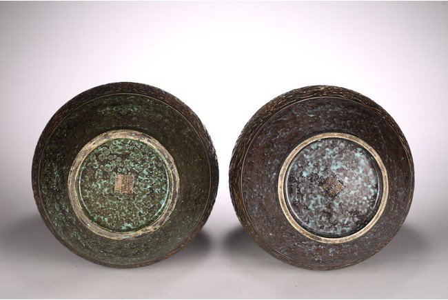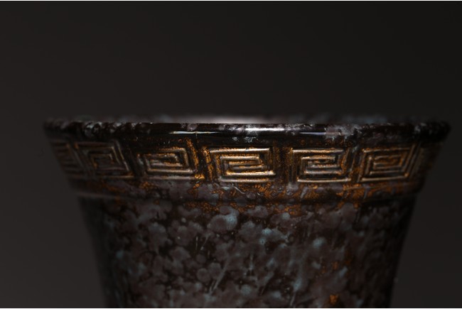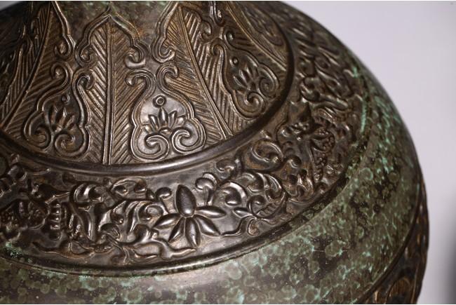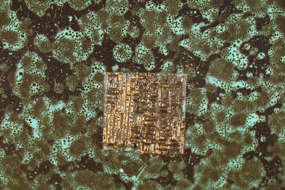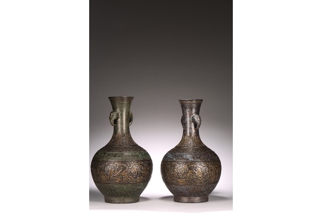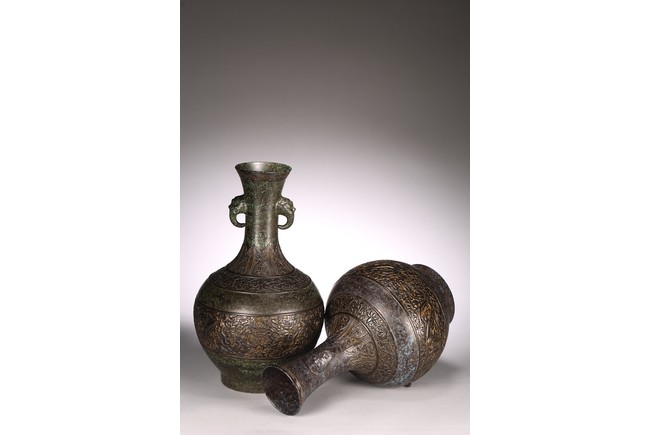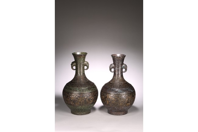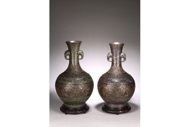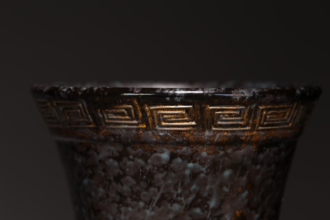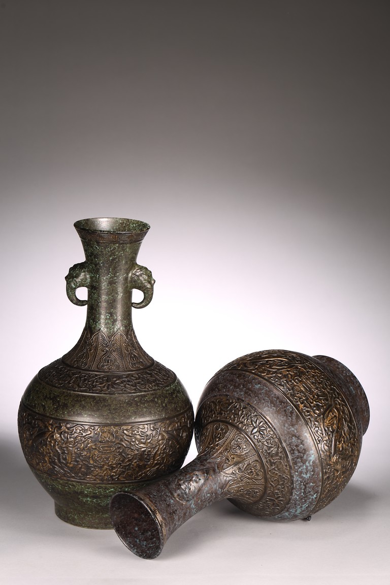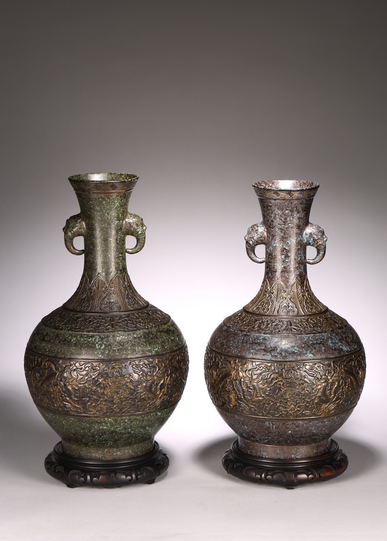 Chinese. The globular body rising from a short straight foot to a tall trumpet neck flanked by pair of beast head handles, the body carved with band of dragons chasing flaming pearl, covered overall in a teadust glaze of brown tone to simulate the patina of bronze, splashed with robin's-egg turquoise and green enamels to mimic encrustation, the base bears reign mark. Qing Dynasty period.
