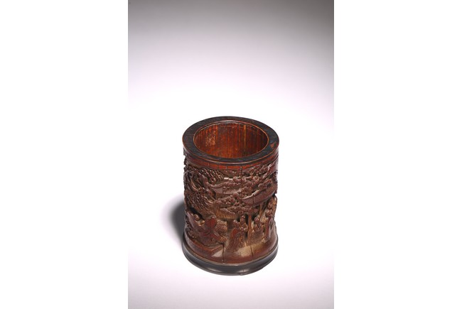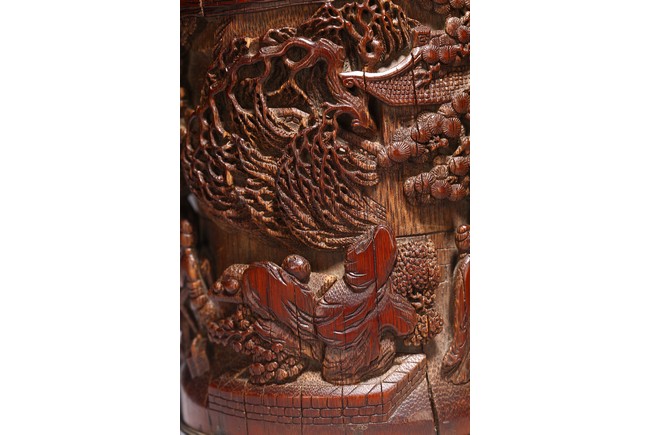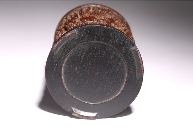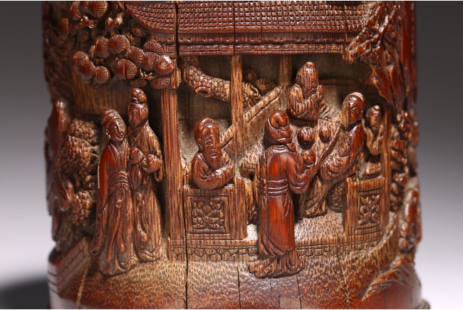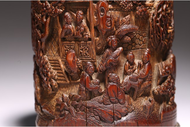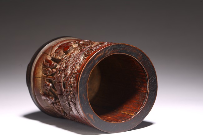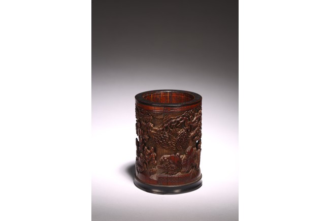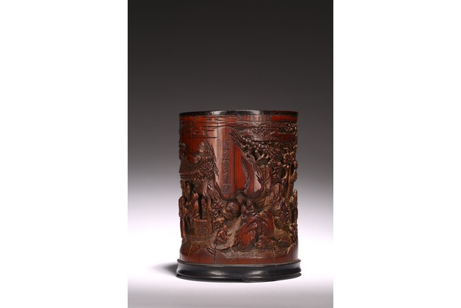 Chinese. The exterior finely carved in high relief with the various scholar figures and their attendants enjoying the dense shade of the bamboos and engaged in scholarly leisures, signed Cheng Tinglu on one of the rock overhangs. set with zitan base and rim mount. Mid-Qing Dynasty period.