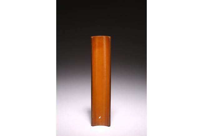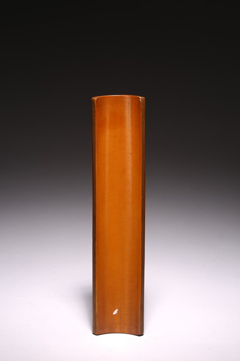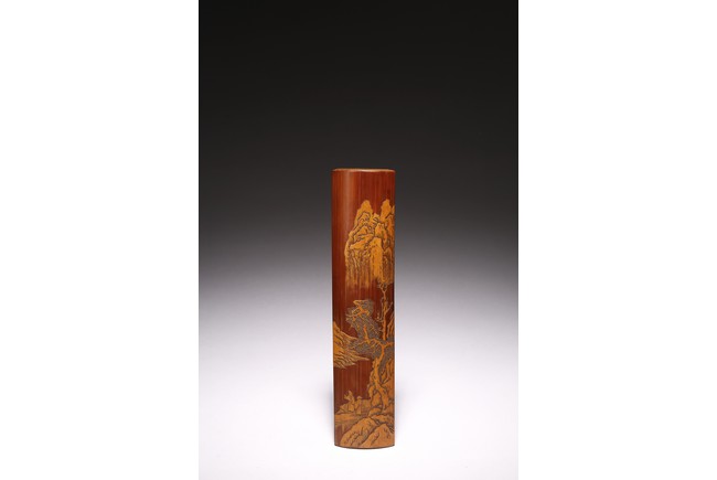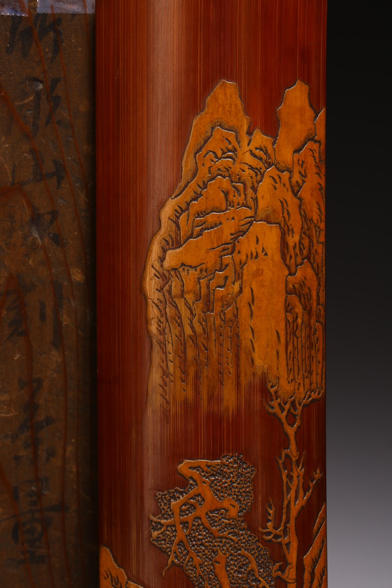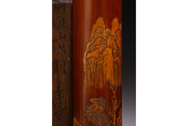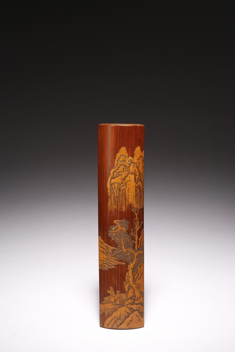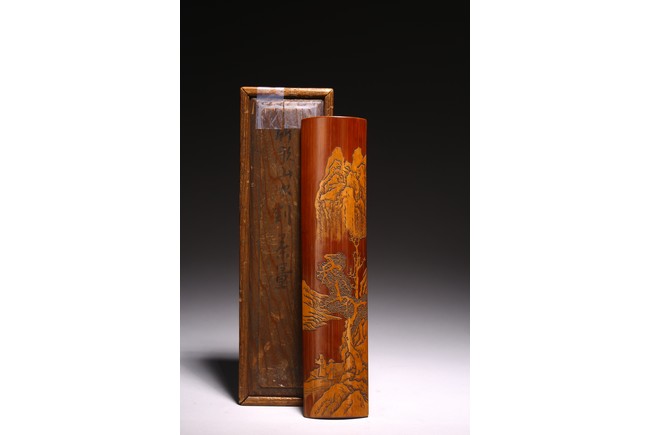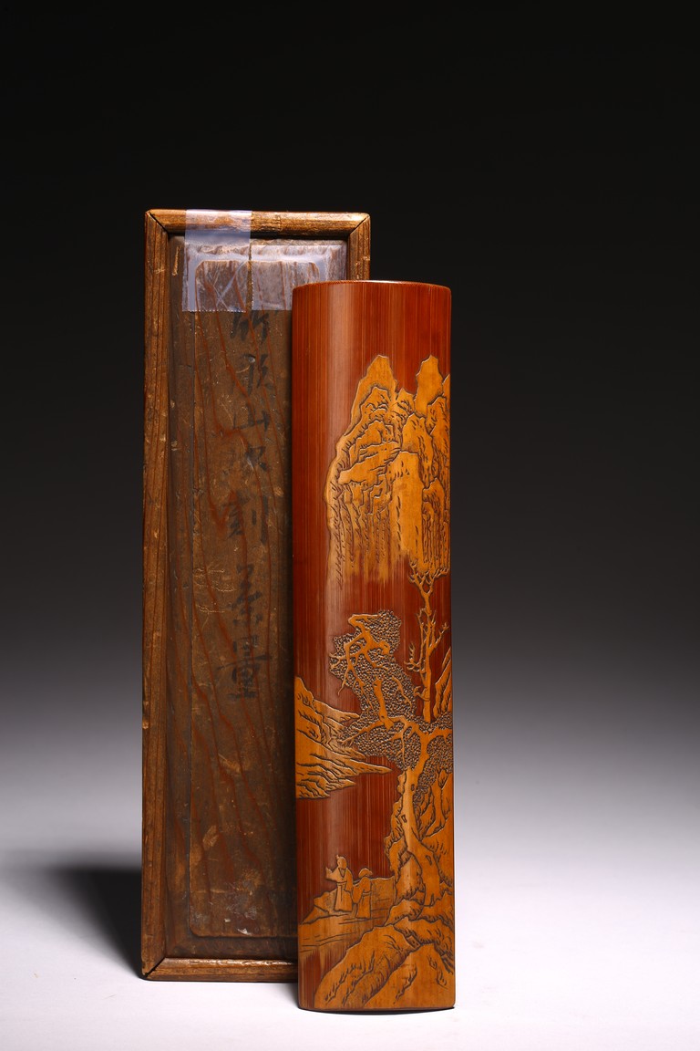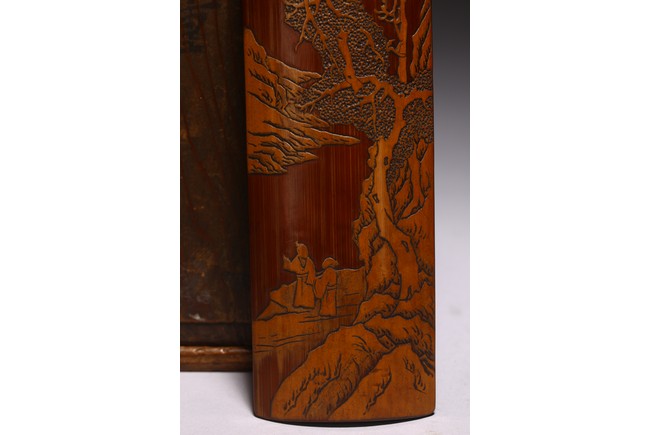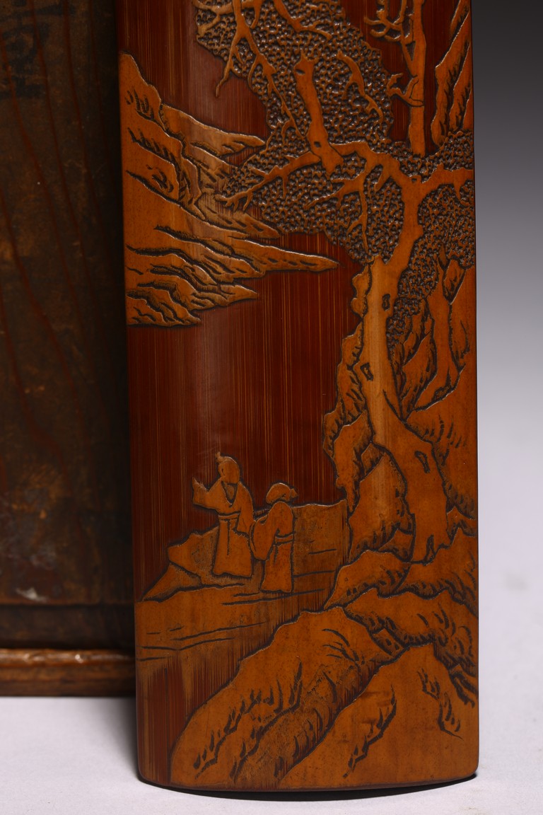Chinese. Of rectangular convex form, finely carved with a mountainous landscape with two scholar figures in a conversation below a large wutong tree. Accompanied with a softwood box. Qing Dynasty period.