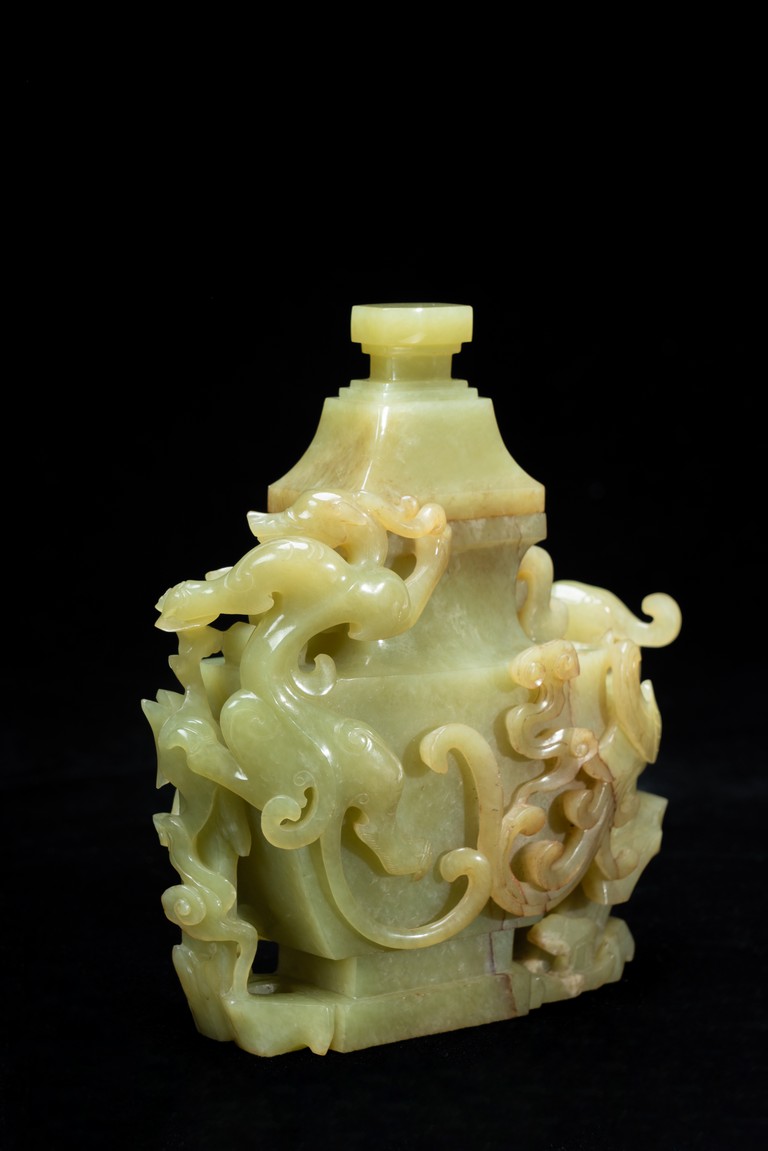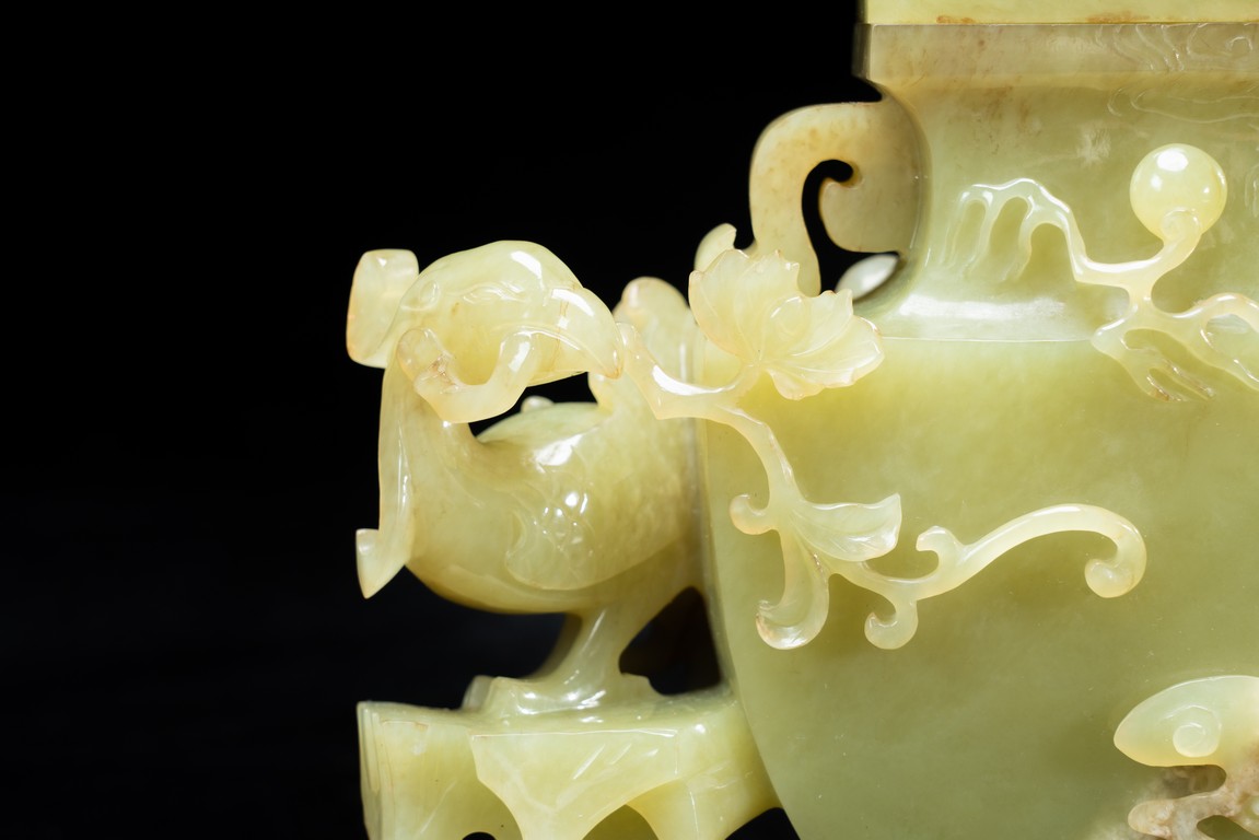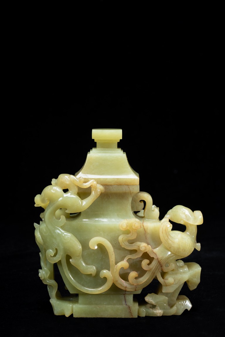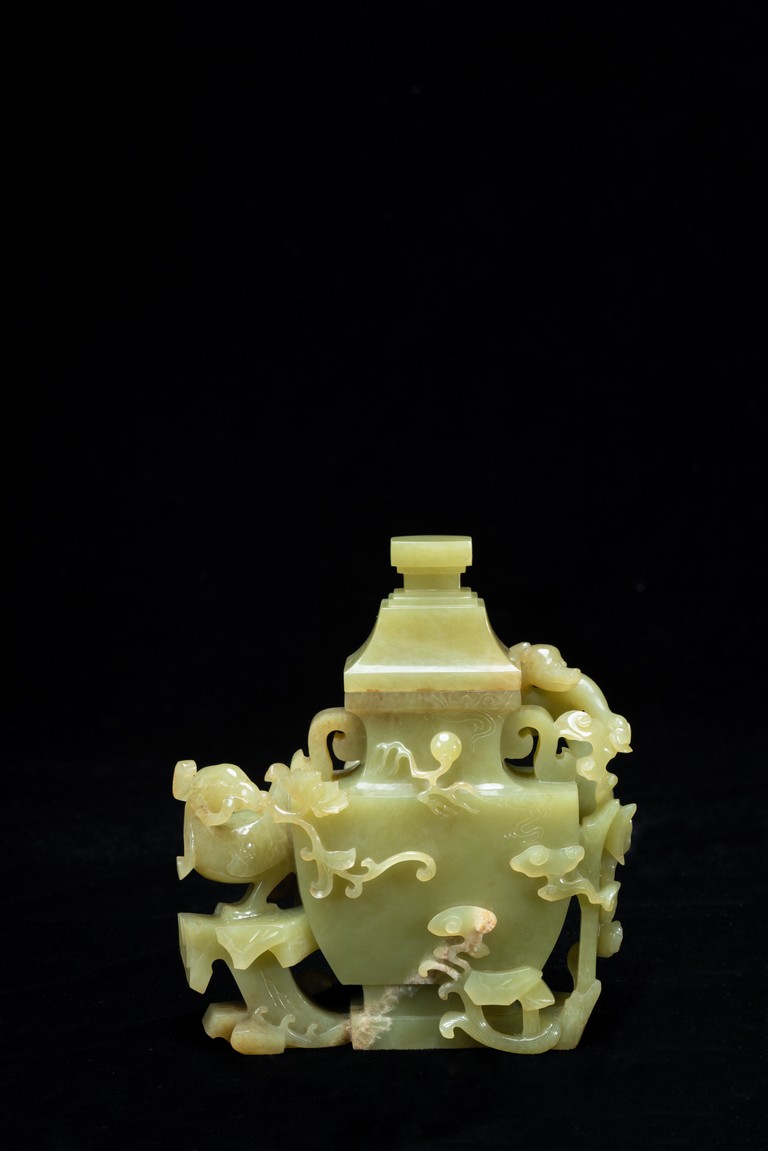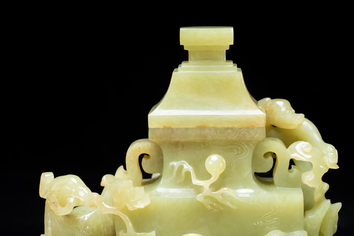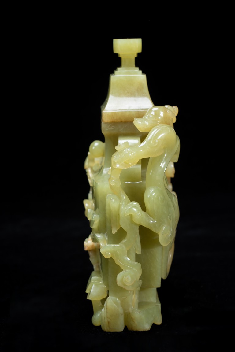 明代曹昭《格古要論》說,“黃玉如粟者為貴,謂之甘黃”;明末學者高濂在《遵生八箋·燕閒清賞箋上·論古玉器》提到:“玉以甘黃為上,羊脂次之。以黃為中色,且不易得,以白為偏色,時以有之故耳。今人賤黃而貴白,以見少也。”古代五行以中為黃:黃色在中央,也是大地之色,故稱“中色”;因此其認為:“蒸栗色佳,焦黃為下,甘青色如新柳,近亦無之。”由此可知,黃玉有過傲視羊脂玉之歷史典故。本品取材珍罕,使用比羊脂玉更為稀少的黃玉為之,,色澤甘黃純美,玉質溫潤如脂,瑩潔細膩,色澤均勻濃鬱。圓雕而成,掏膛工藝精湛,膛腔光滑平整,蓋子母口嚴絲合縫,造型規整端莊。瓶身左側圓雕鳳鳥,鳳尾修長,作回首狀,口銜牡丹花傲然站立於山石之上,牡丹飽滿碩大,葉蔓靈動柔美。右側圓雕螭龍,螭龍被視為是帶有無窮權利的神獸,也是驅邪解難的吉祥物,龍身細長盤曲,輾轉騰挪,頭型尖圓,四肢矯健,花尾分叉,極具動感。整器造型特殊,於細節之處彰顯工匠技藝之高超,紋飾極其華麗繁複,盡顯高貴古雅之氣,即體現上古紋飾之氣韻,又流露天朝盛世之雄姿,雕琢細緻入微,如雕似畫,極盡裝飾之妙,其設計真可謂巧奪天工。 (參閱香港蘇富比拍賣公司2021年春季拍賣會中國藝術珍品專場3625號拍品,成交價:HKD 2,016,000)來源:加拿大溫哥華私人藏家收藏 Provenance: Private collection, Vancouver, Canada