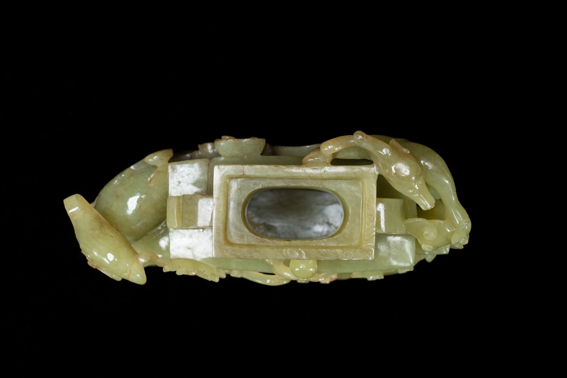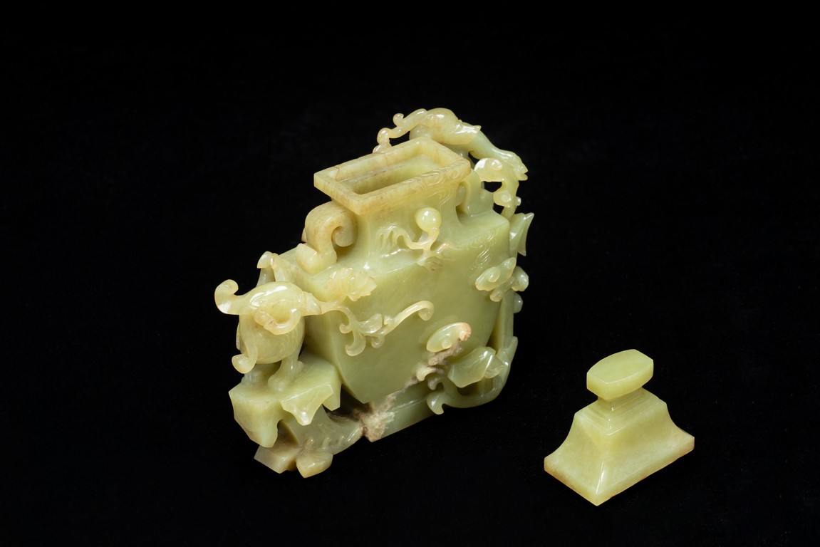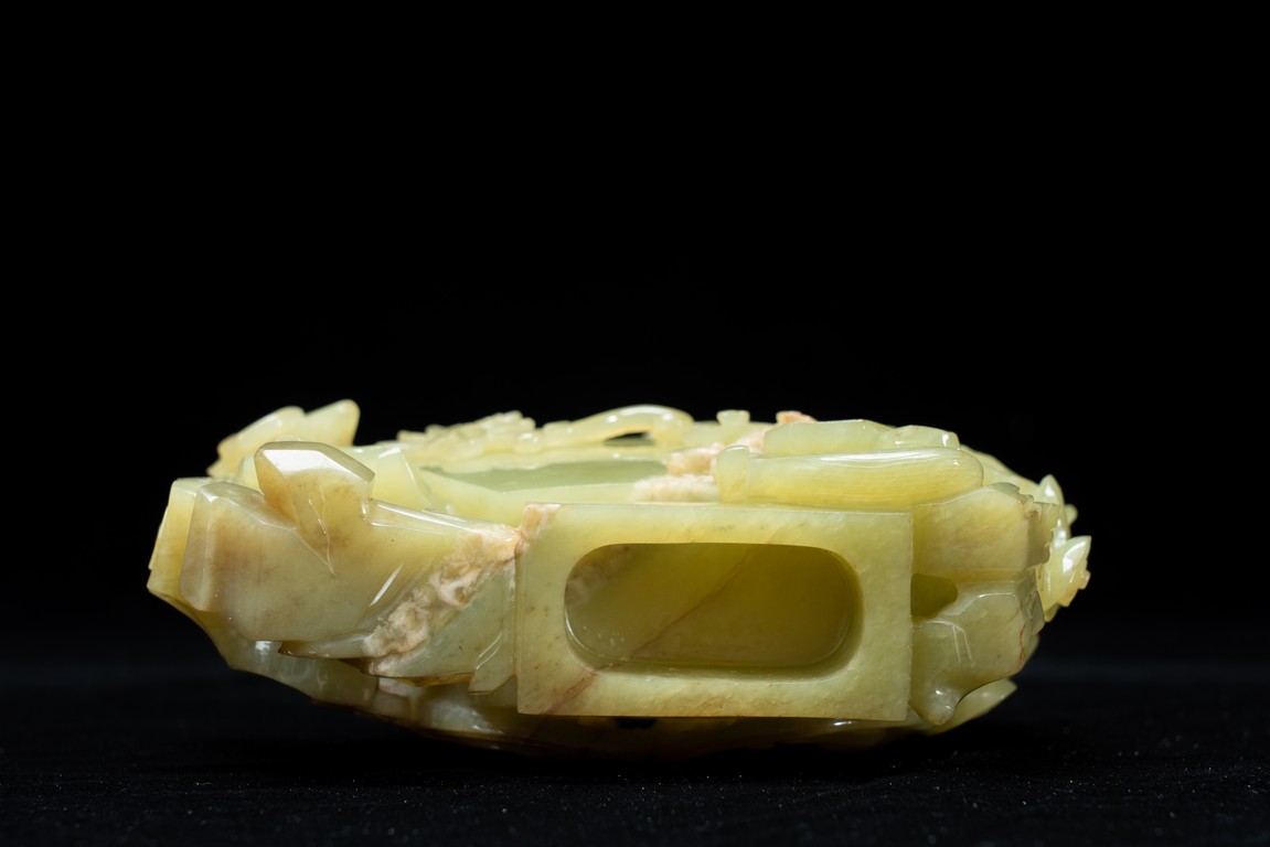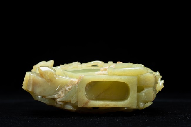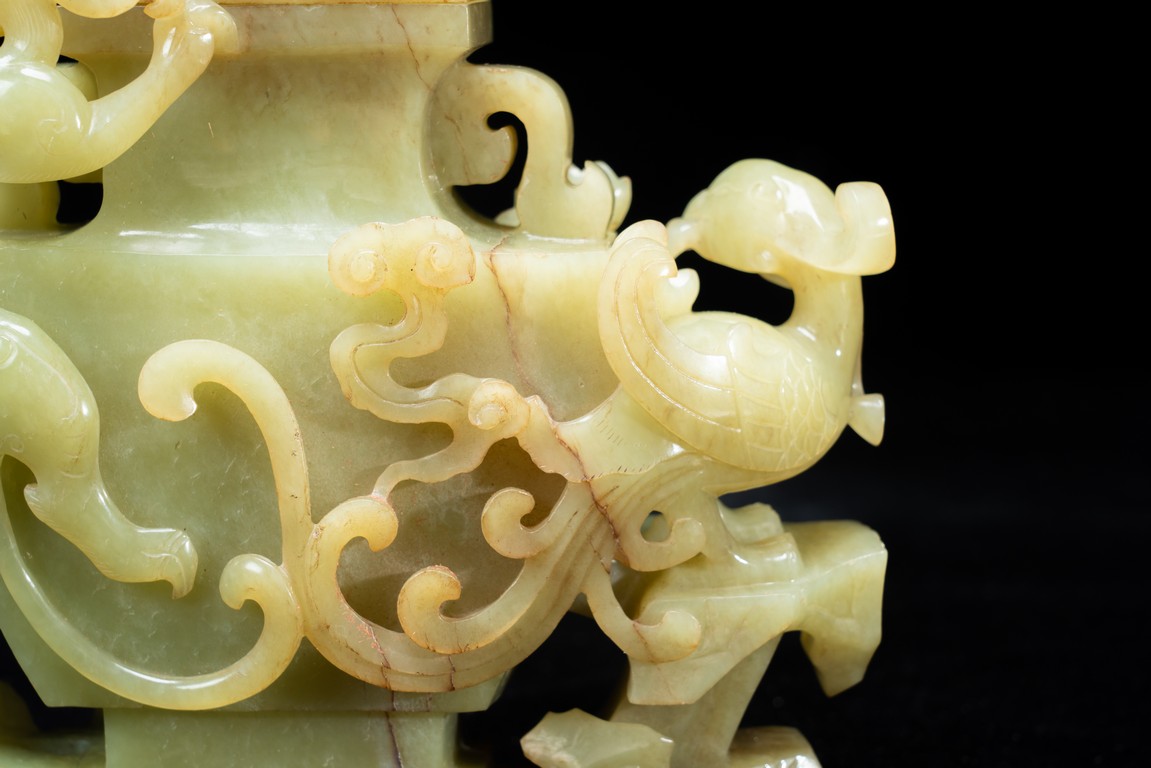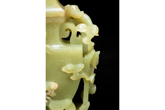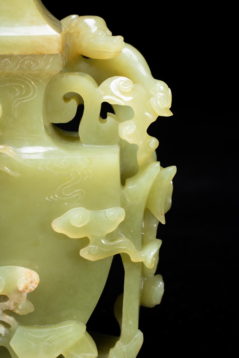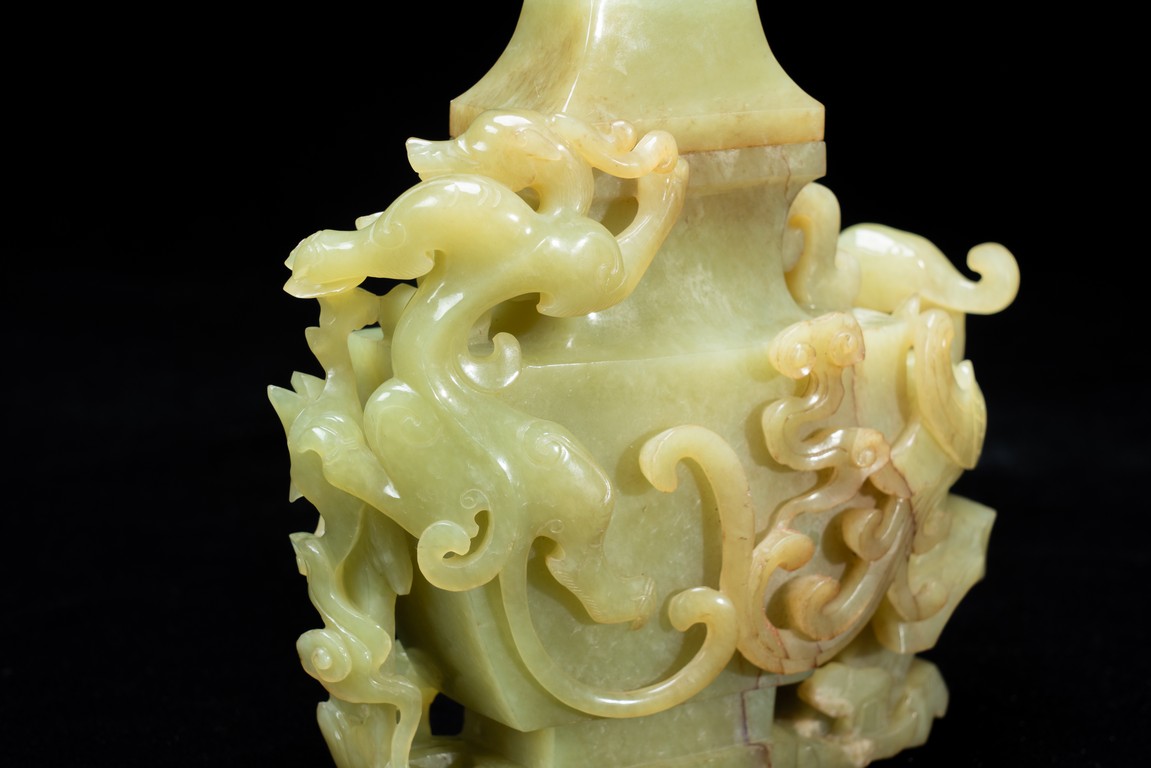 明代曹昭《格古要論》說,“黃玉如粟者為貴,謂之甘黃”;明末學者高濂在《遵生八箋·燕閒清賞箋上·論古玉器》提到:“玉以甘黃為上,羊脂次之。以黃為中色,且不易得,以白為偏色,時以有之故耳。今人賤黃而貴白,以見少也。”古代五行以中為黃:黃色在中央,也是大地之色,故稱“中色”;因此其認為:“蒸栗色佳,焦黃為下,甘青色如新柳,近亦無之。”由此可知,黃玉有過傲視羊脂玉之歷史典故。本品取材珍罕,使用比羊脂玉更為稀少的黃玉為之,,色澤甘黃純美,玉質溫潤如脂,瑩潔細膩,色澤均勻濃鬱。圓雕而成,掏膛工藝精湛,膛腔光滑平整,蓋子母口嚴絲合縫,造型規整端莊。瓶身左側圓雕鳳鳥,鳳尾修長,作回首狀,口銜牡丹花傲然站立於山石之上,牡丹飽滿碩大,葉蔓靈動柔美。右側圓雕螭龍,螭龍被視為是帶有無窮權利的神獸,也是驅邪解難的吉祥物,龍身細長盤曲,輾轉騰挪,頭型尖圓,四肢矯健,花尾分叉,極具動感。整器造型特殊,於細節之處彰顯工匠技藝之高超,紋飾極其華麗繁複,盡顯高貴古雅之氣,即體現上古紋飾之氣韻,又流露天朝盛世之雄姿,雕琢細緻入微,如雕似畫,極盡裝飾之妙,其設計真可謂巧奪天工。 (參閱香港蘇富比拍賣公司2021年春季拍賣會中國藝術珍品專場3625號拍品,成交價:HKD 2,016,000)來源:加拿大溫哥華私人藏家收藏 Provenance: Private collection, Vancouver, Canada