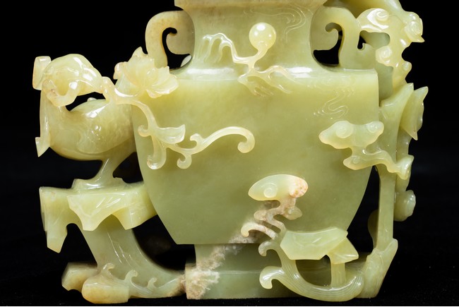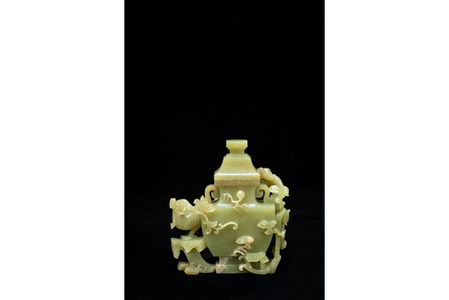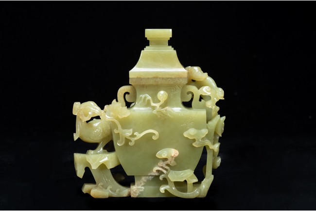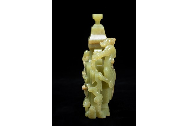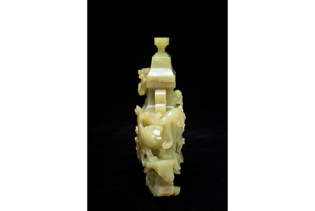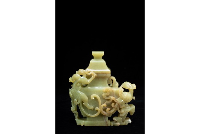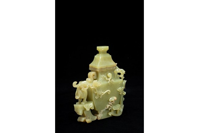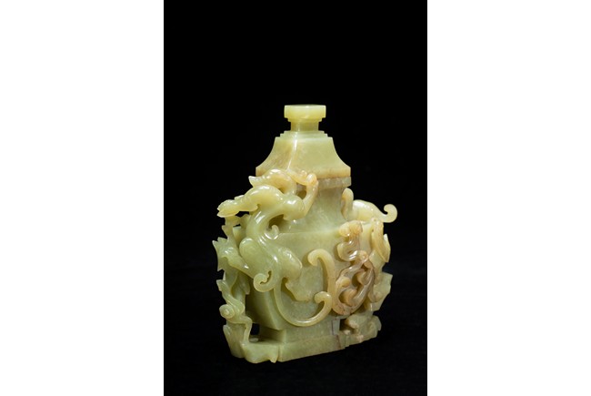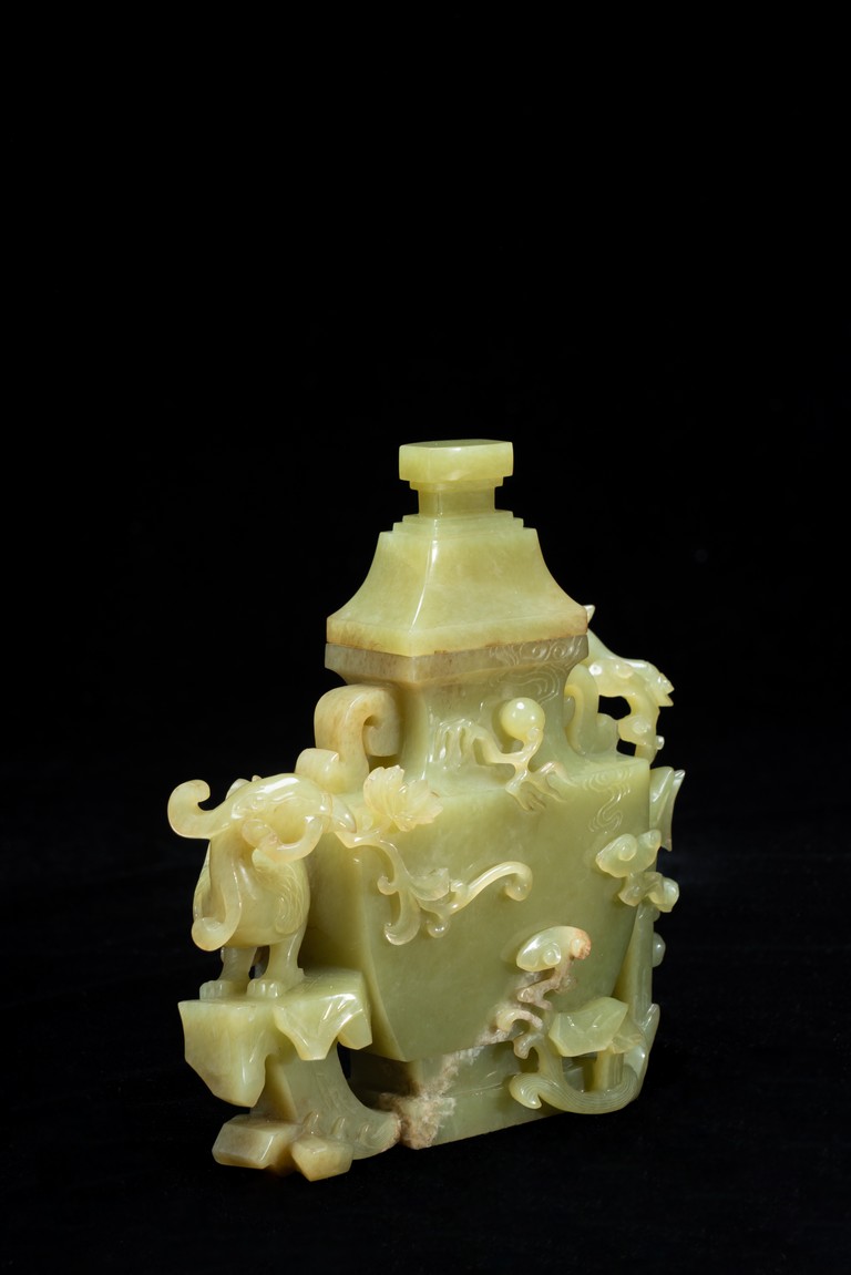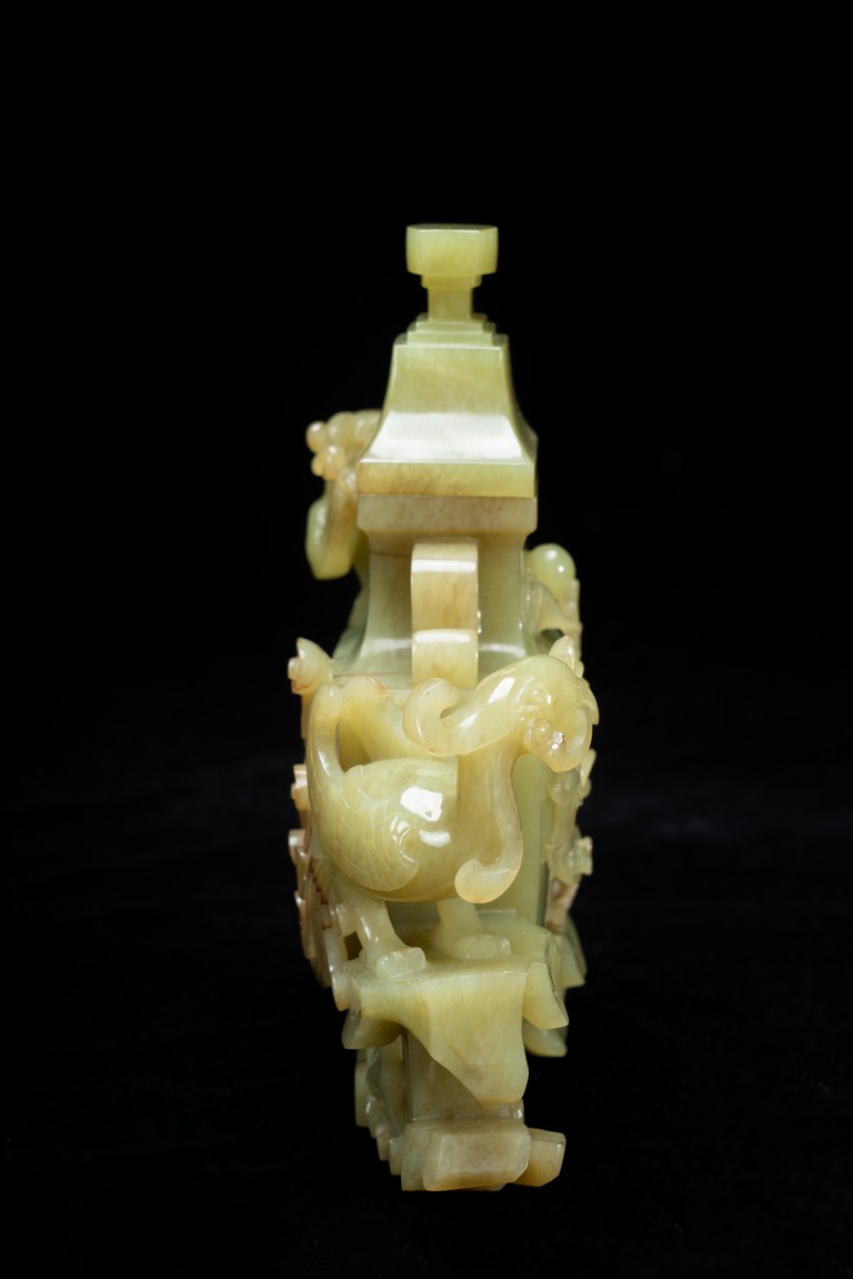 Chinese. Carved in the form of a flattened vase flanked on both sides with a phoenix standing on a rock base on one side and a sinuous chilong on the opposite side, the vase cover of conforming shape surmounted by an oval knop, the stone of a yellow tone with russet inclusions and finished with a smooth polish. Qing Dynasty period.