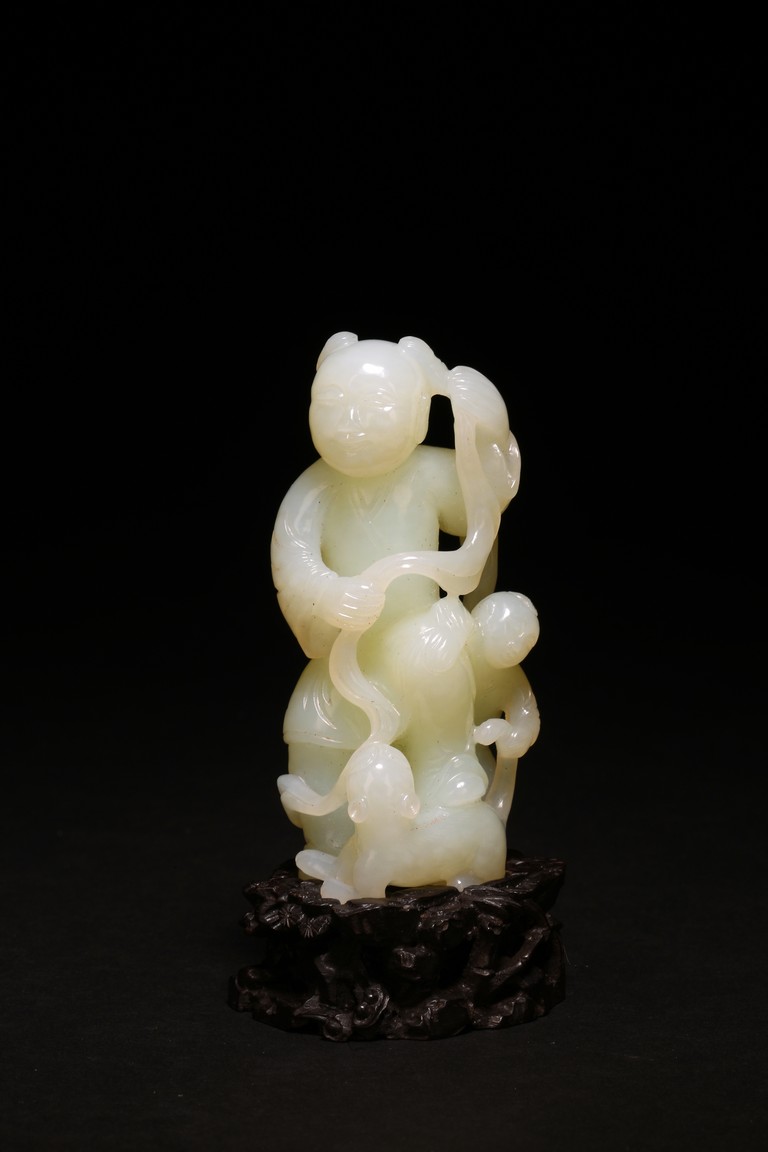 Chinese. The white translucent stone carved in the form of a boy holding a ribbon with one foot playfully stepping on the back of a mythical cat, while another smaller boy hiding on the back holding the tail, all supported on a carved zitan stand. Qing Dynasty period.