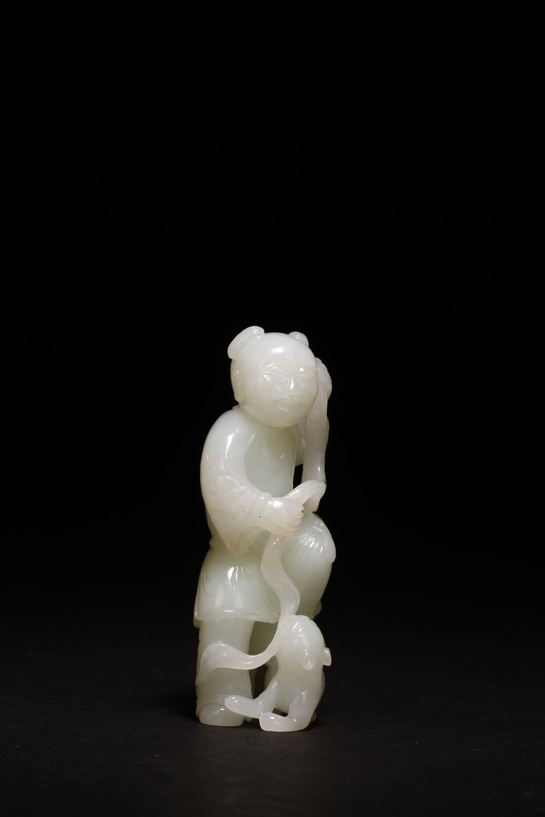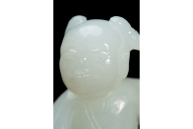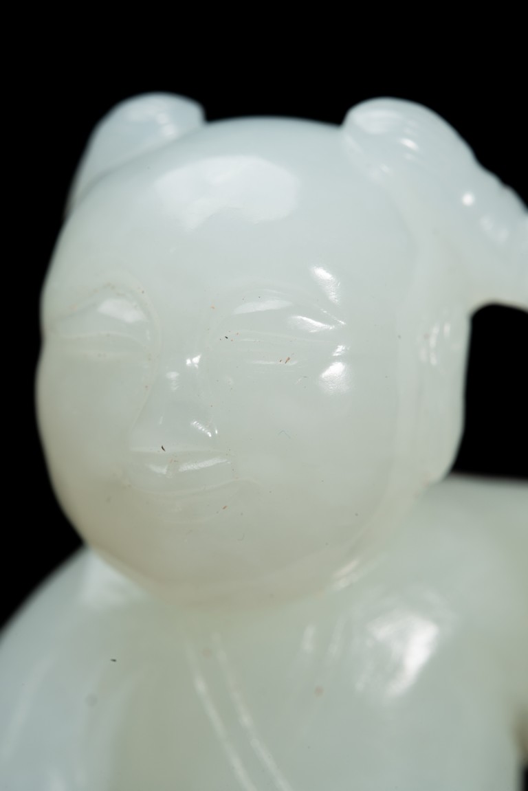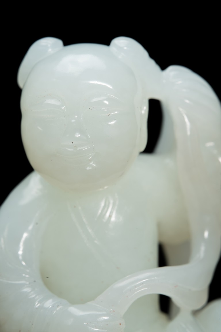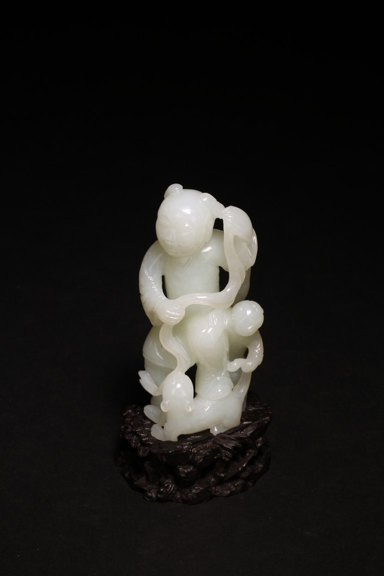 以上等和田白玉圓雕而成,潔白瑩潤,如膏如脂,其質溫潤潔淨、白皙通透。圓雕二童子,寓意人上人,童子頭顱飽滿,頭頂梳雙髻,面頰渾厚飽滿,鼻寬口方,眉眼清晰,盡顯童子之純真稚趣。整器琢工技藝高超,線條精準流暢,衣裙飄逸,衣褶舒展自如,刀法簡約洗練,琢磨精細入微。帶木座。