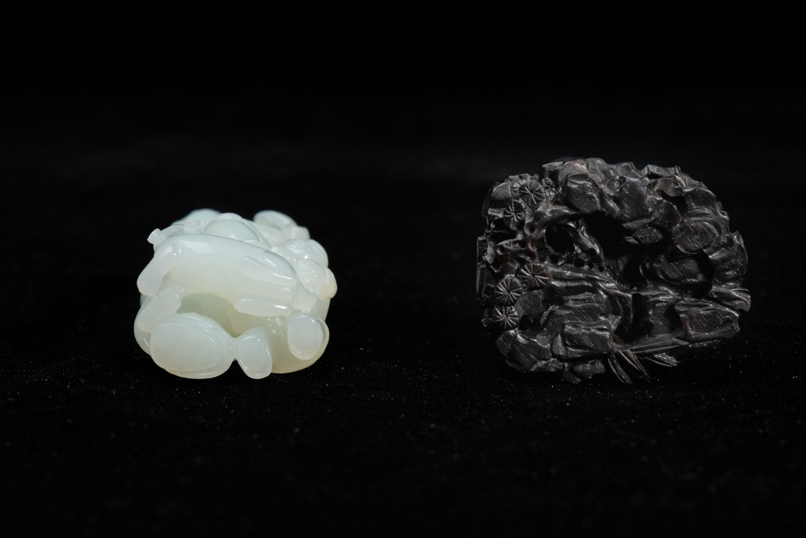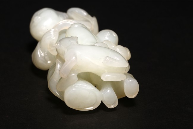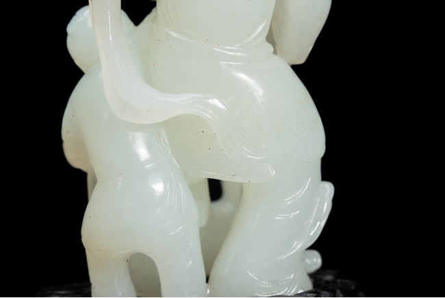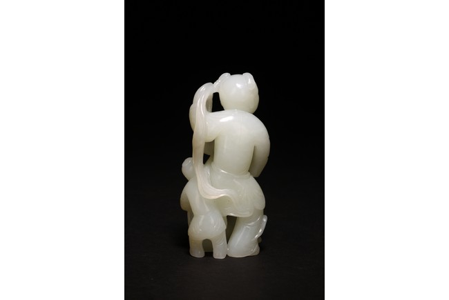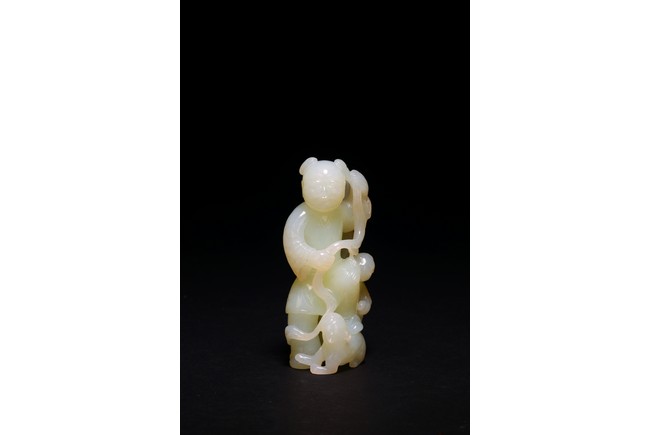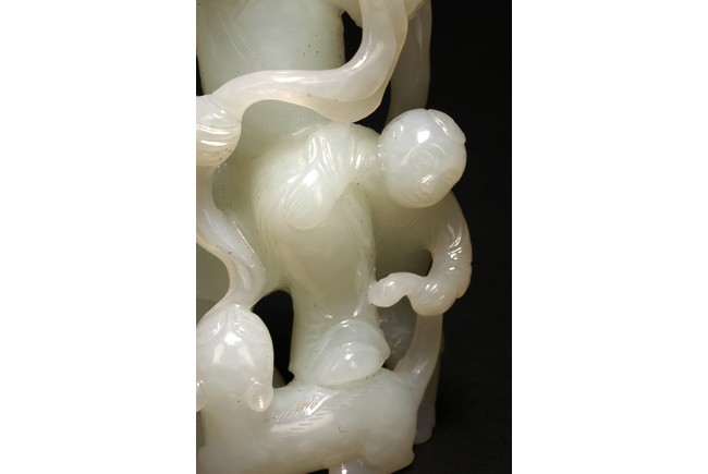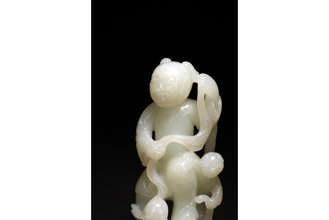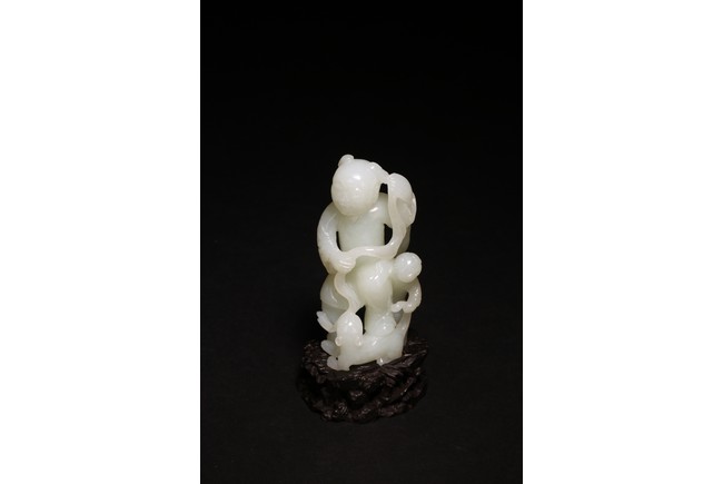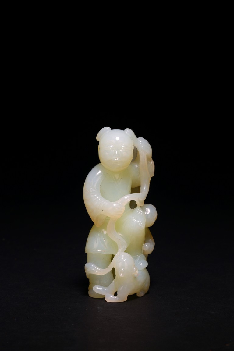 以上等和田白玉圓雕而成,潔白瑩潤,如膏如脂,其質溫潤潔淨、白皙通透。圓雕二童子,寓意人上人,童子頭顱飽滿,頭頂梳雙髻,面頰渾厚飽滿,鼻寬口方,眉眼清晰,盡顯童子之純真稚趣。整器琢工技藝高超,線條精準流暢,衣裙飄逸,衣褶舒展自如,刀法簡約洗練,琢磨精細入微。帶木座。