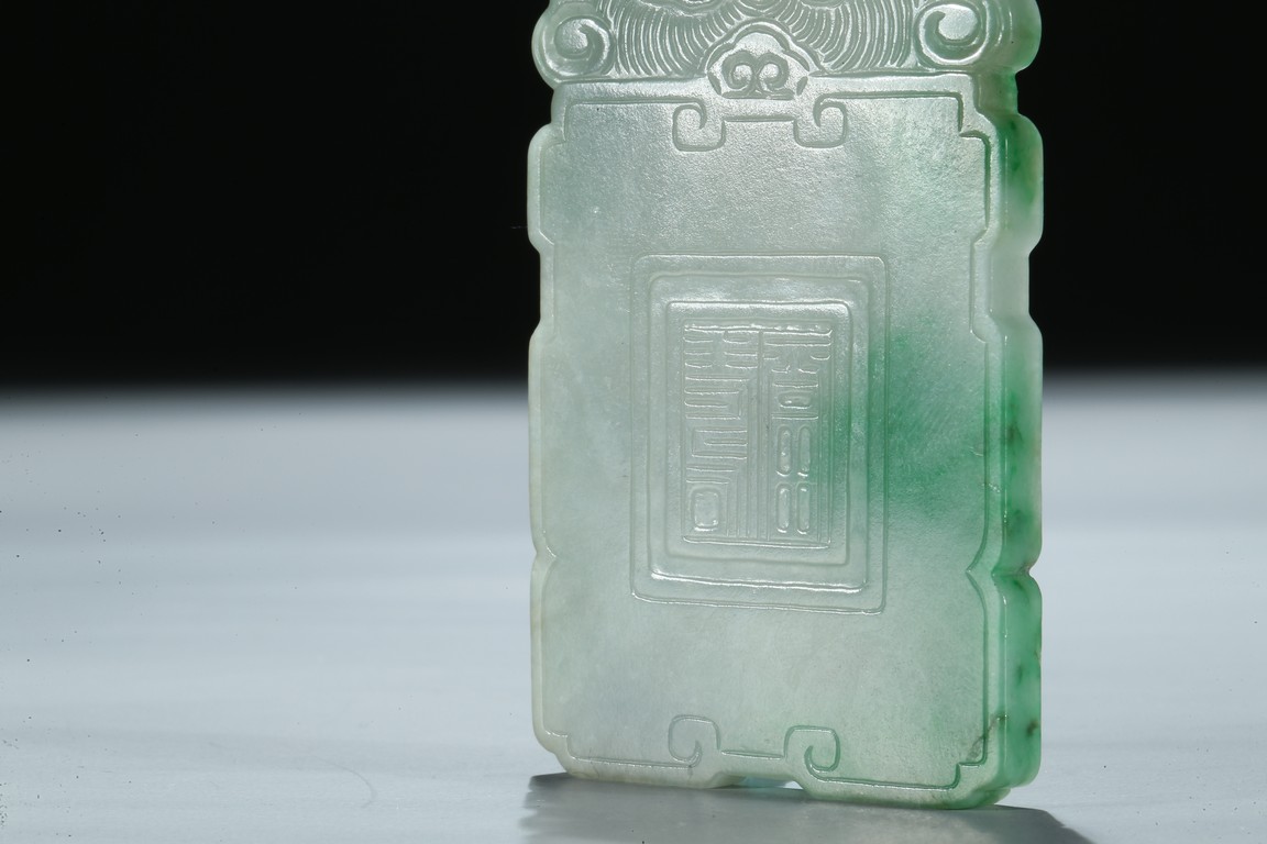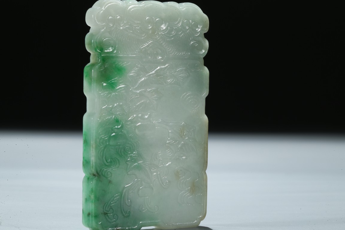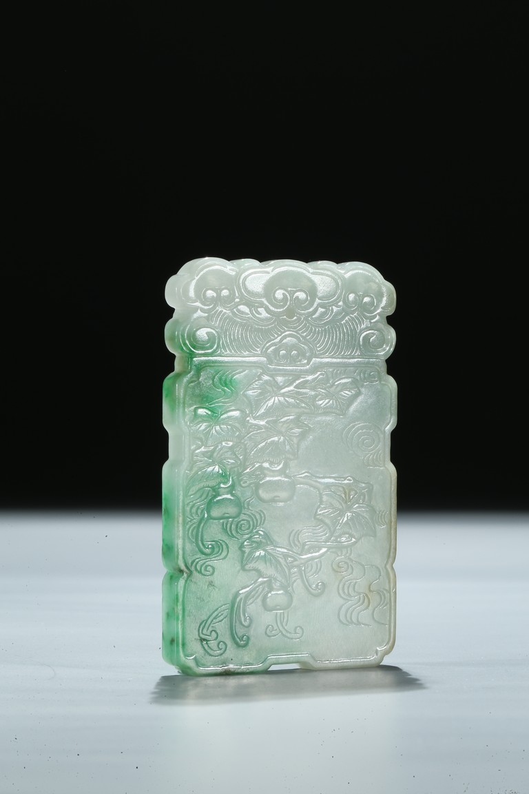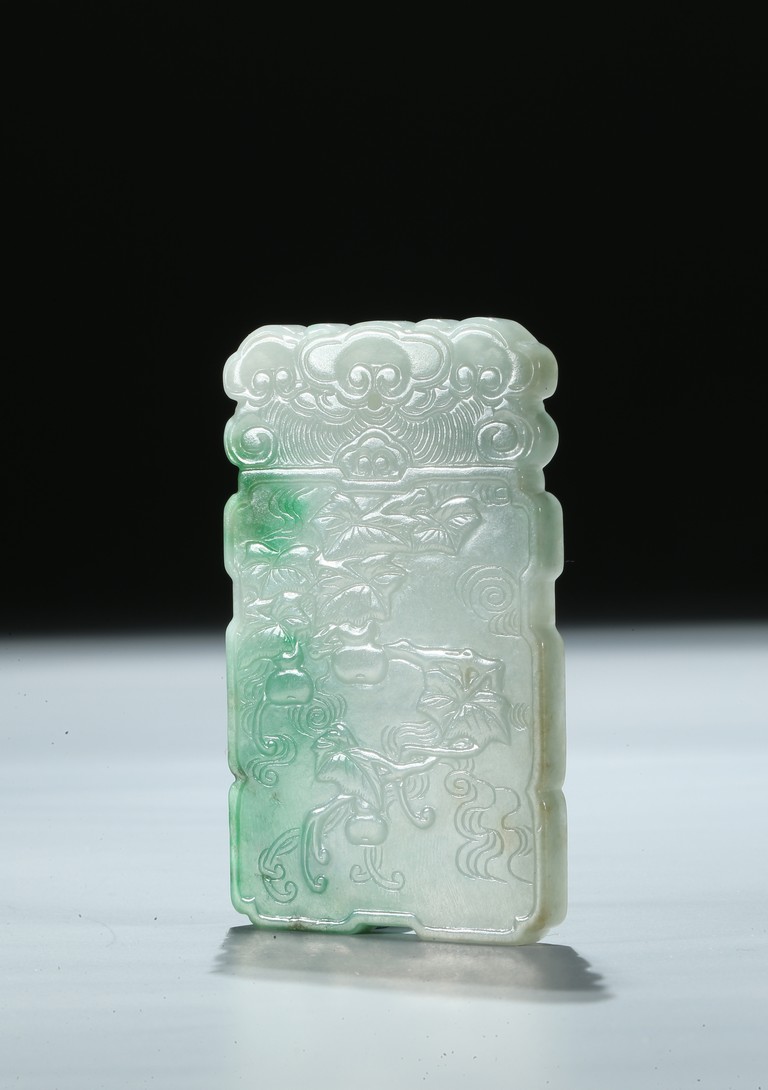 The plaque is delicately worked in low relief with double gourds borne on leafy branches, the reverse inscribed four characters enclosed within a rectangular border, all below lingzhi scrolls, the stone is of high translucent light greenish white tone with green inclusions.