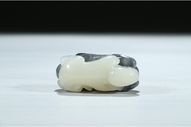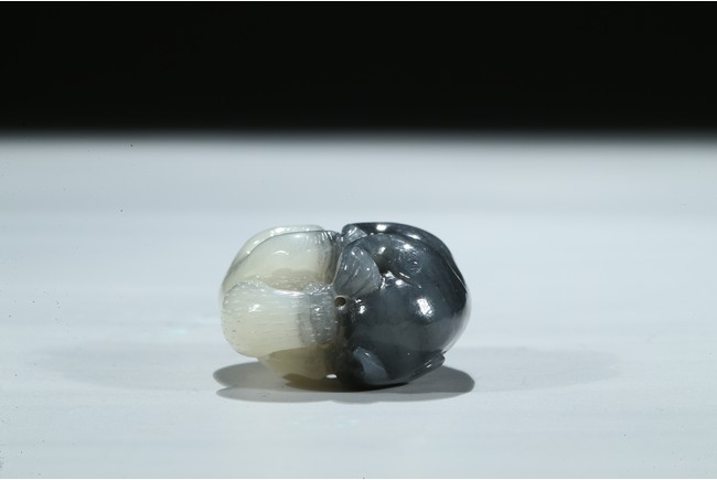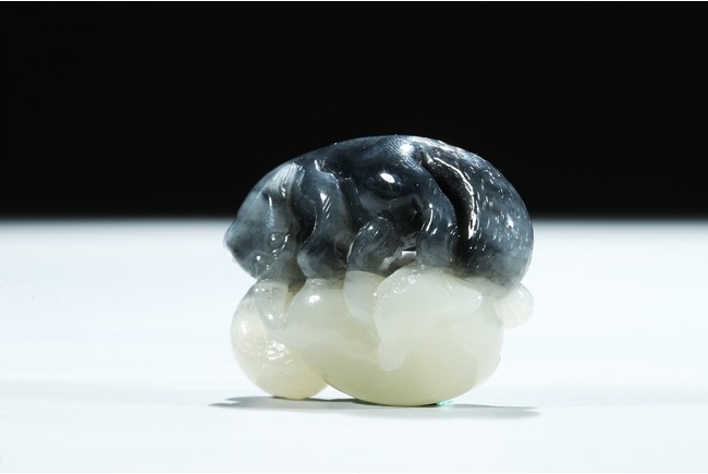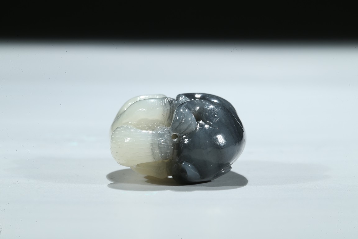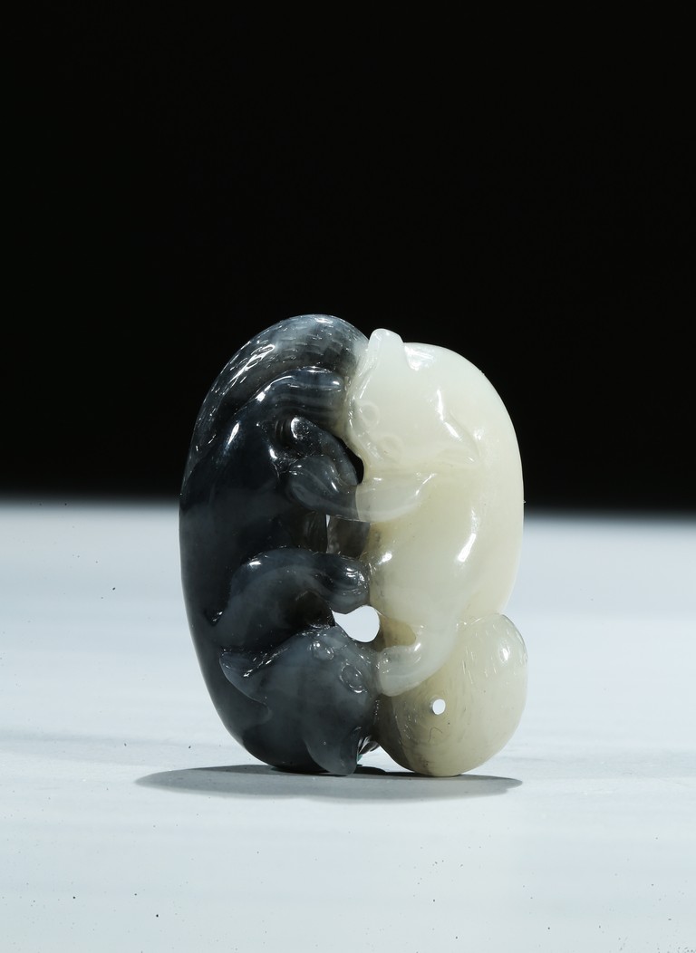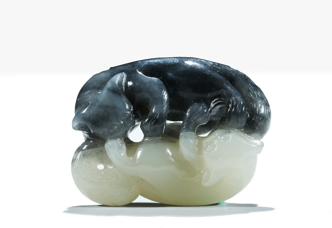The group carved and pierced in the form of two cats, each with the other's back right leg in its mouth, the facial details and tail incised, the stone is of a mottled white and black tone. Qing Dynasty period.