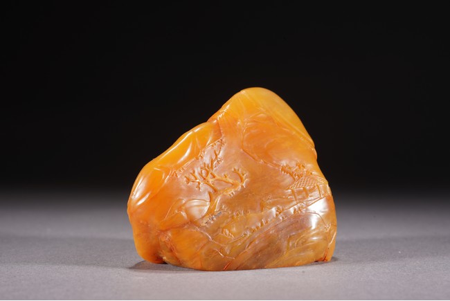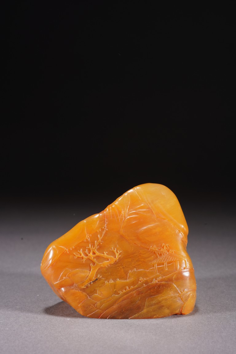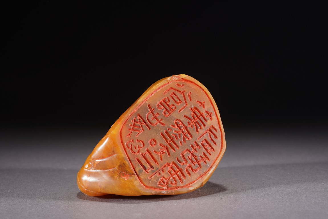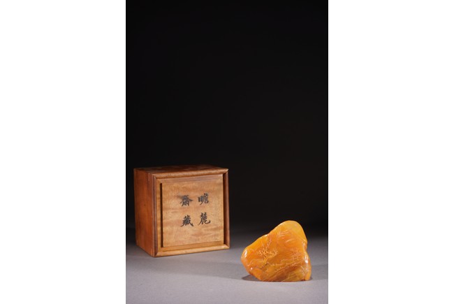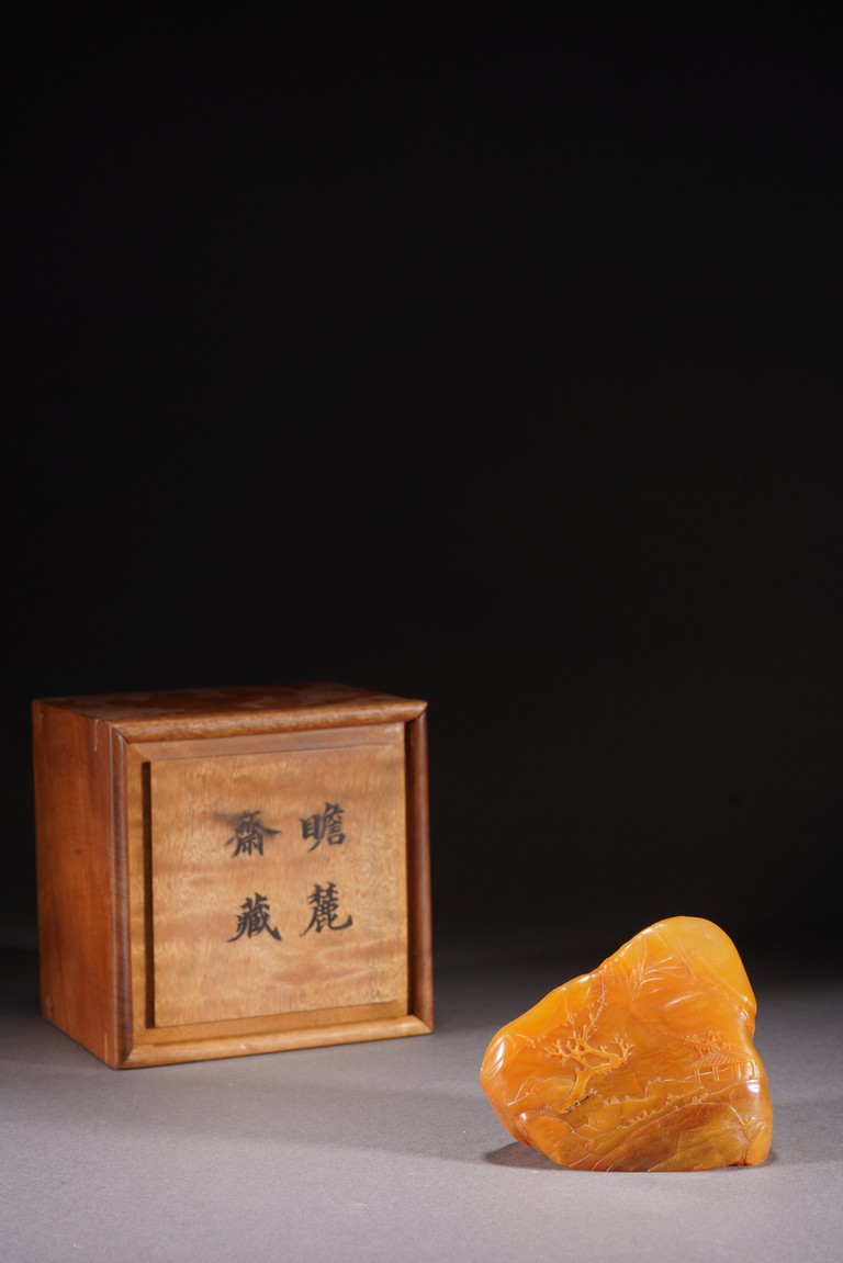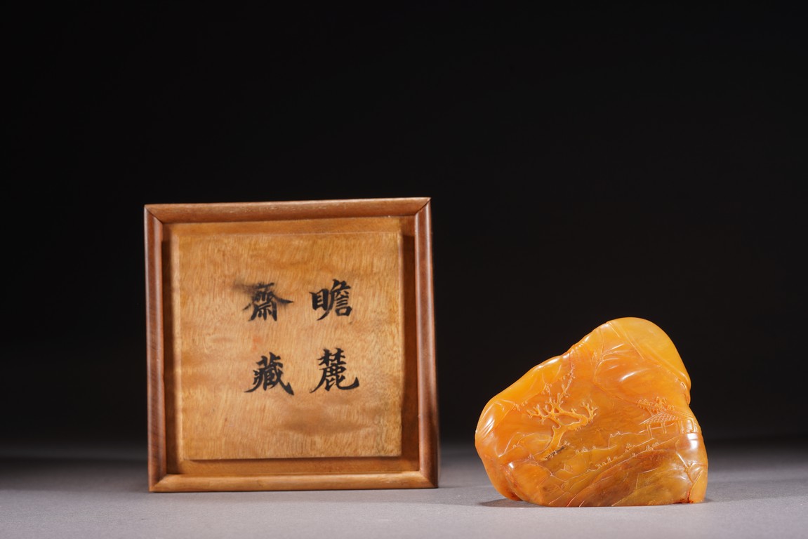 "Chinese. Naturalistically carved, the seal with shallow relief landscape scene, the seal face carved with nine characters, accompanied with a wood box written with four characters 'The collection of Zhan Lu Studio". Qing Dynasty period."