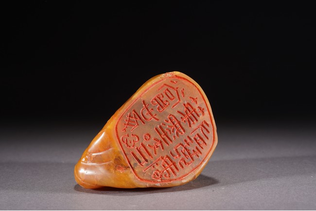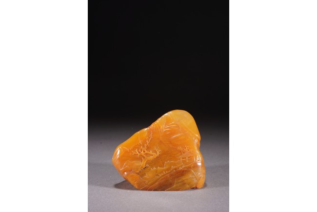 田黃石料質細膩油亮,蘿蔔絲紋明顯,隨型之料,匠人珍惜材料故採用淺刻工藝,雕琢山水,亭台樓閣,工藝精湛,造型脫俗,印文“賞心惟筆墨,知己有琴書”