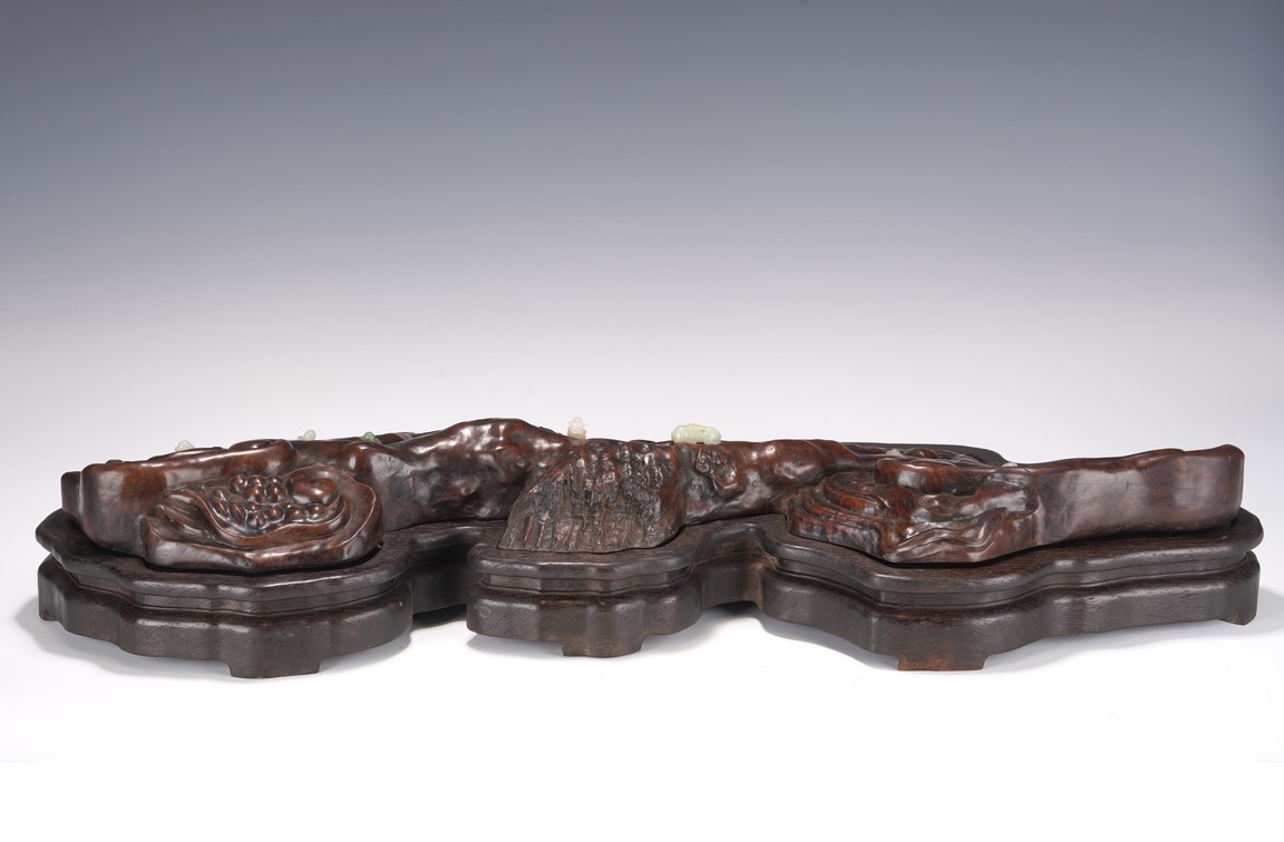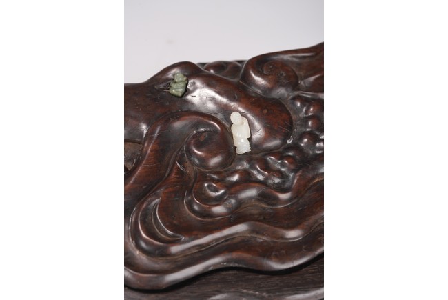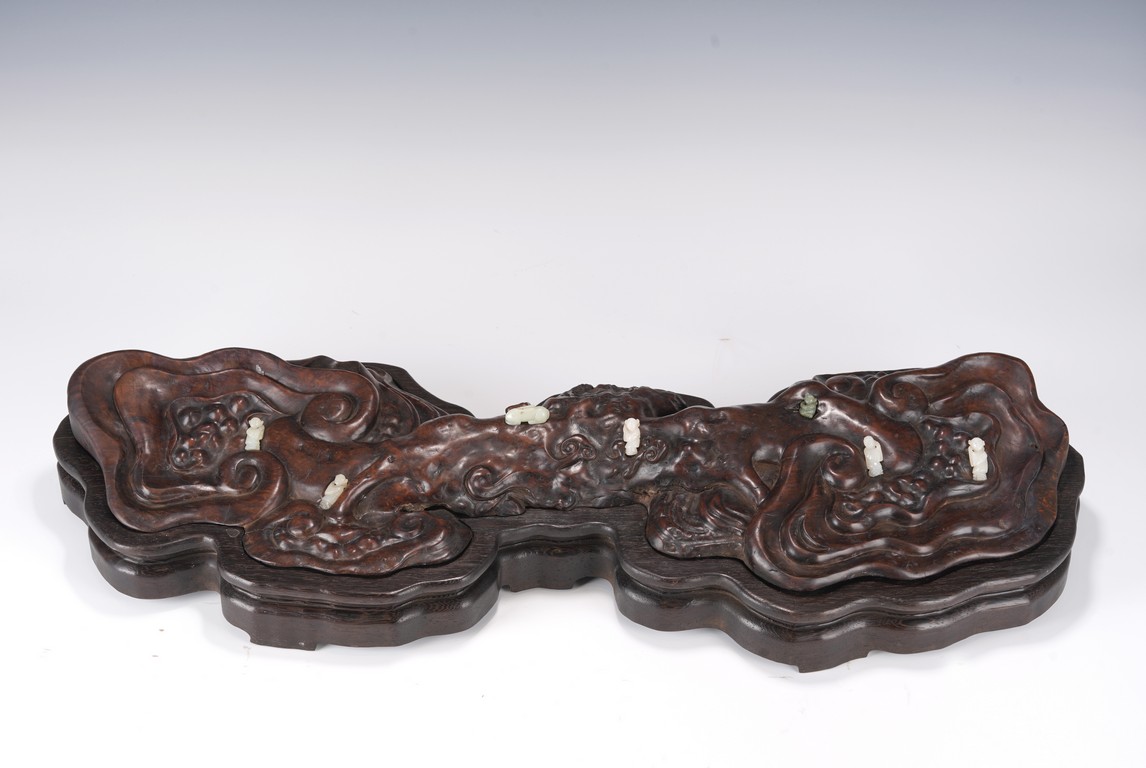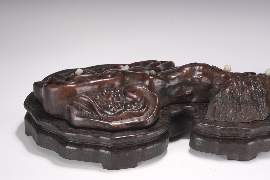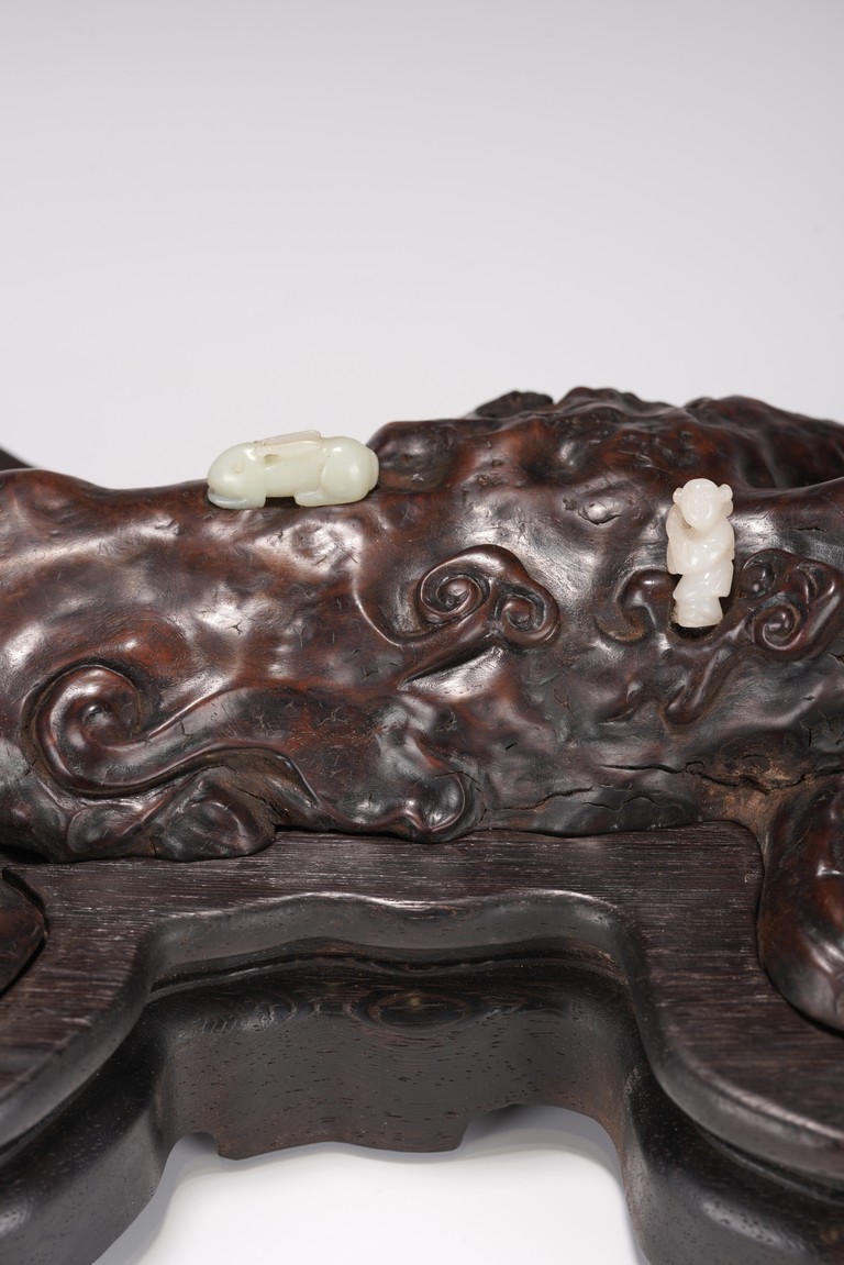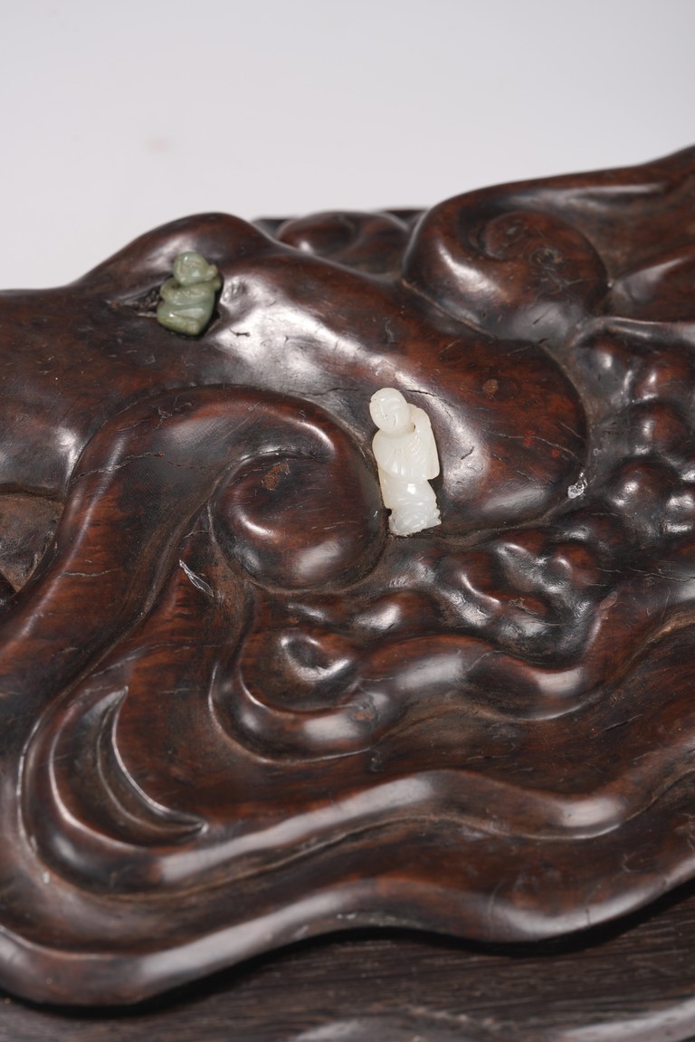 Chinese. Naturalistically carved and rendered, the horizontal burlwood 'shanzi' boulder inlaid with jade carved 'figures' and 'animals', all supported on a fitted rosewood stand. Republic period.