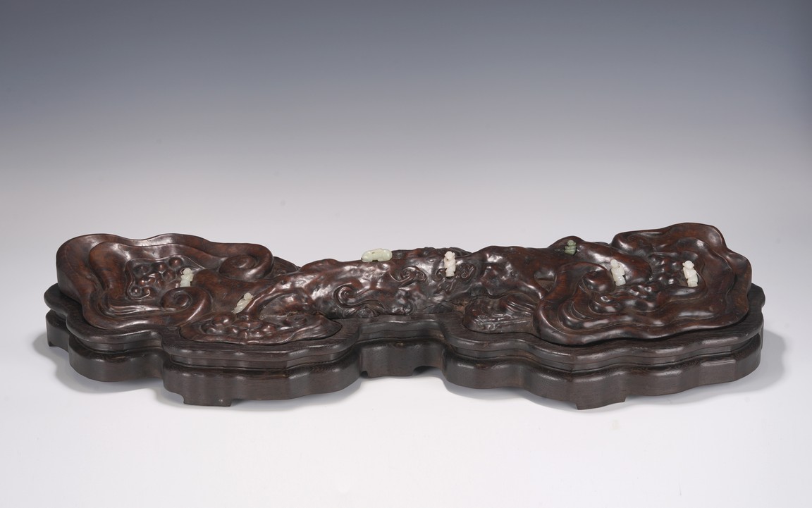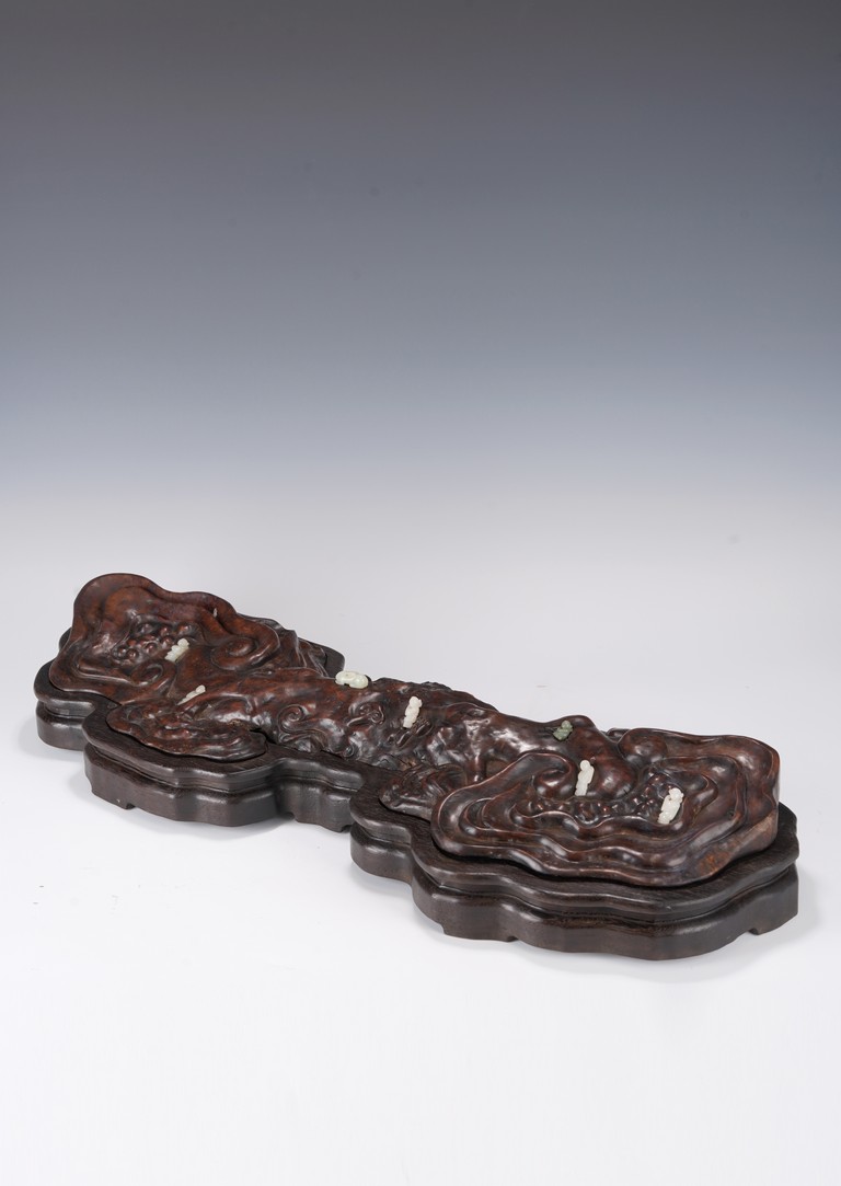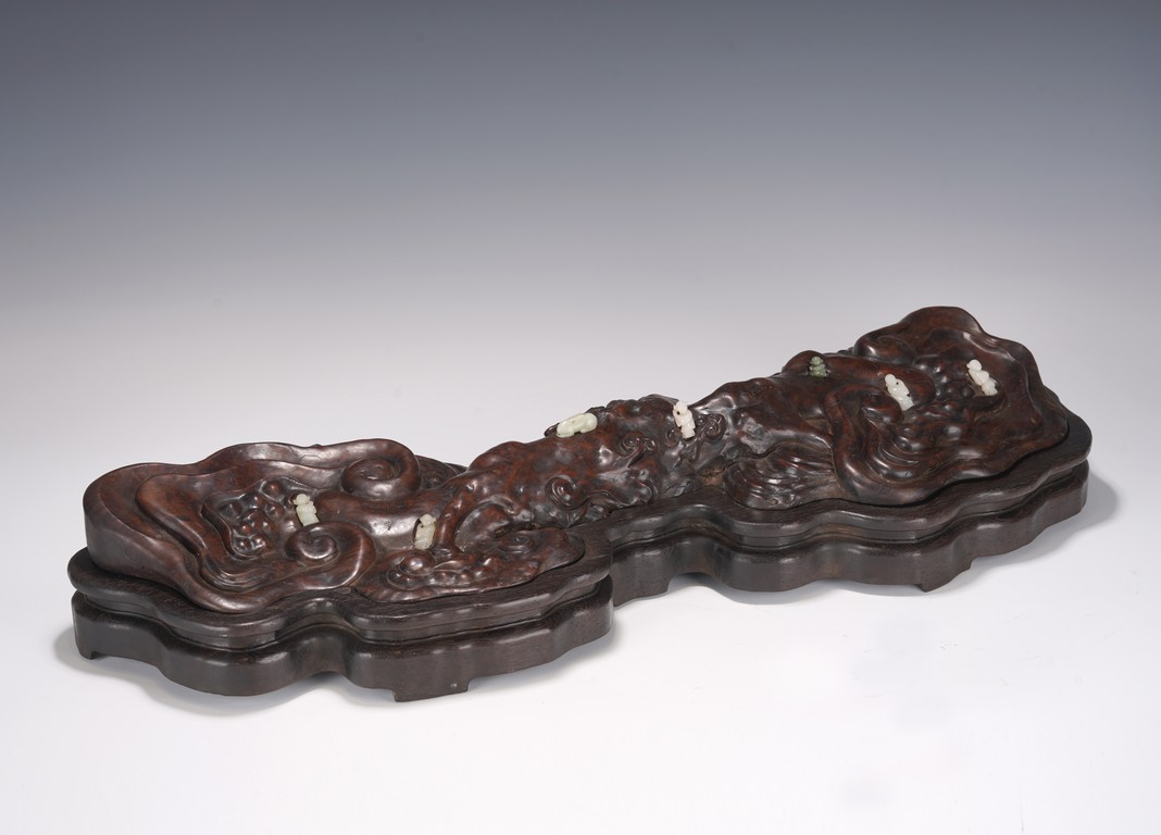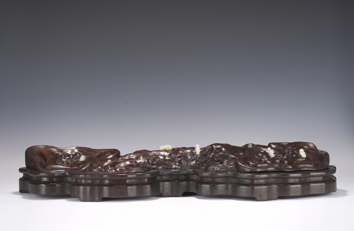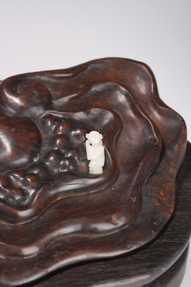 Chinese. Naturalistically carved and rendered, the horizontal burlwood 'shanzi' boulder inlaid with jade carved 'figures' and 'animals', all supported on a fitted rosewood stand. Republic period.