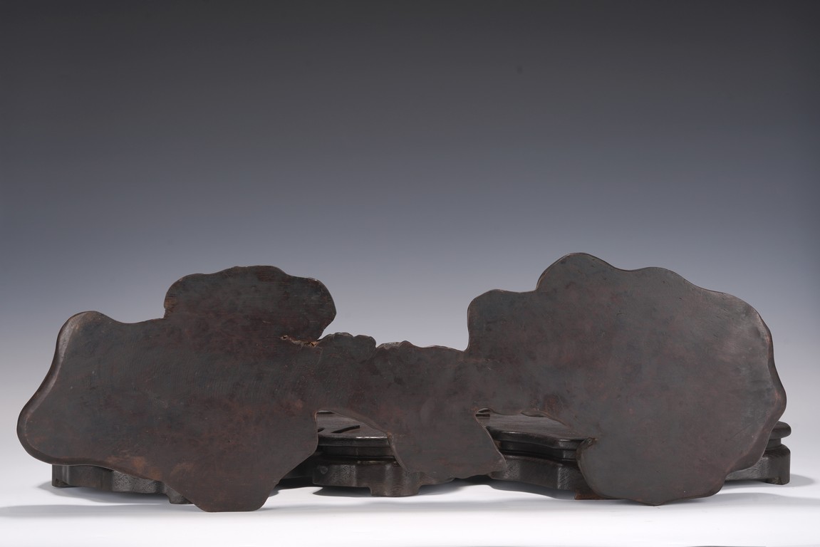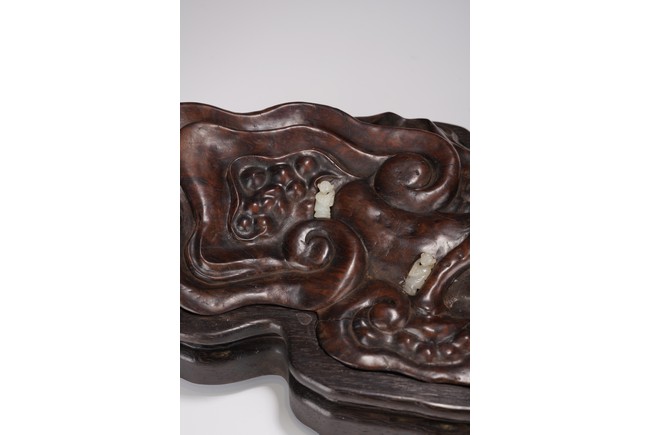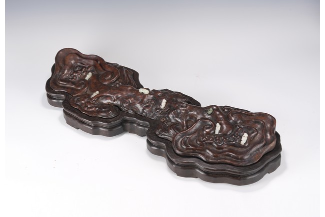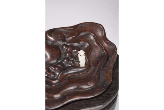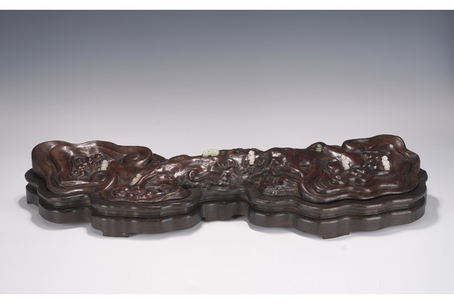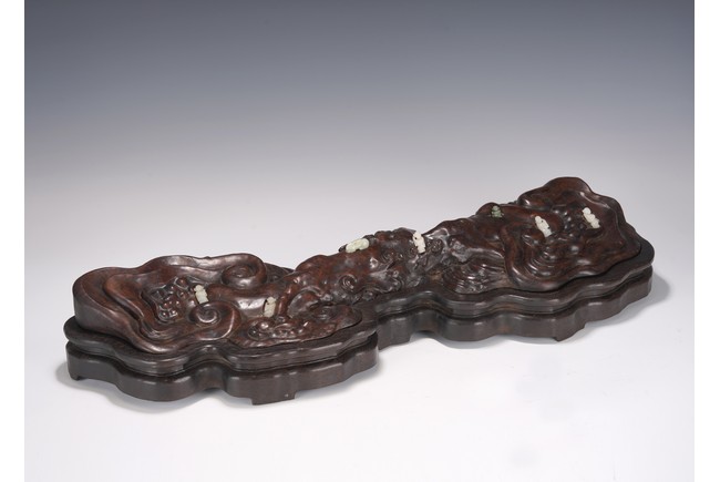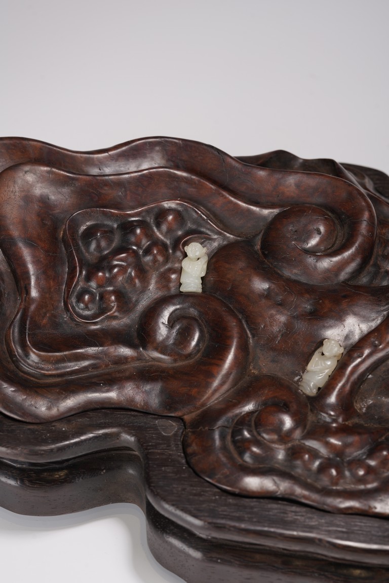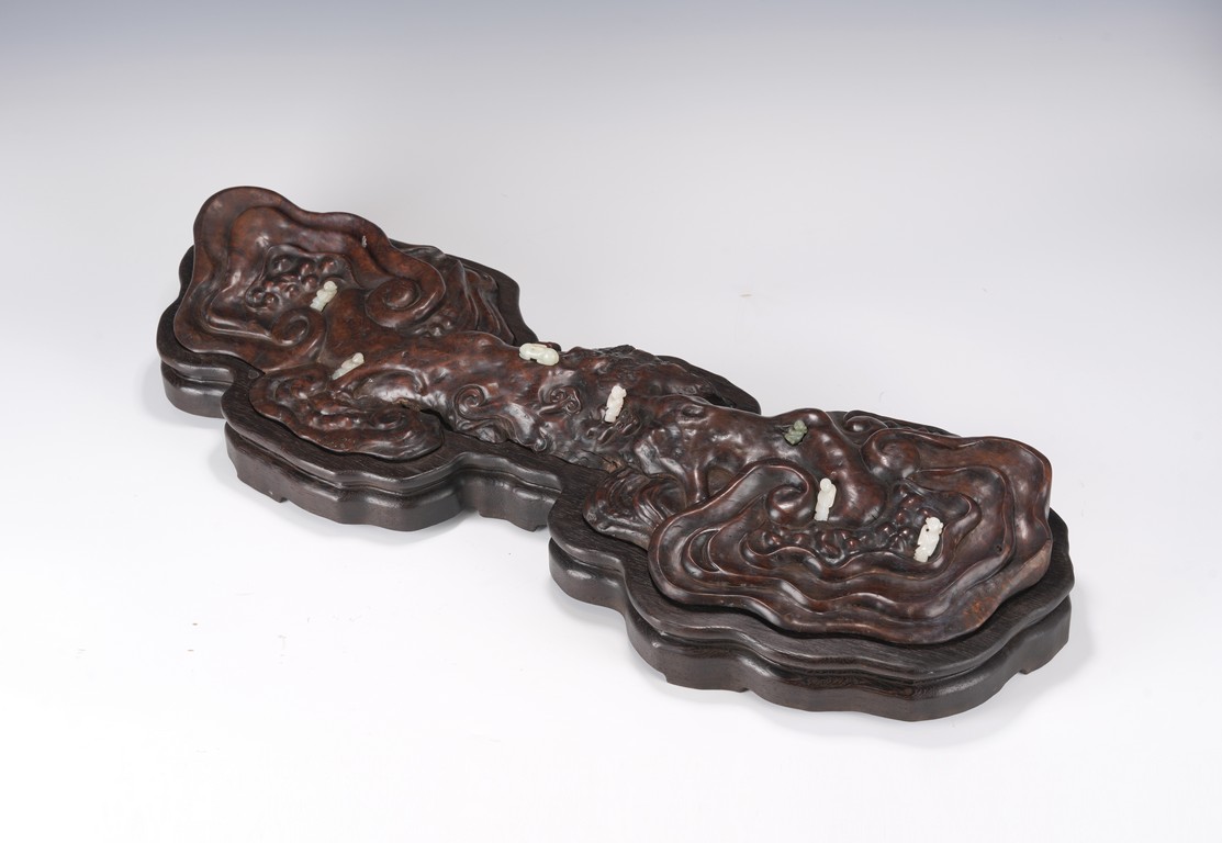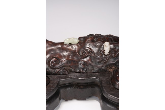 Chinese. Naturalistically carved and rendered, the horizontal burlwood 'shanzi' boulder inlaid with jade carved 'figures' and 'animals', all supported on a fitted rosewood stand. Republic period.
