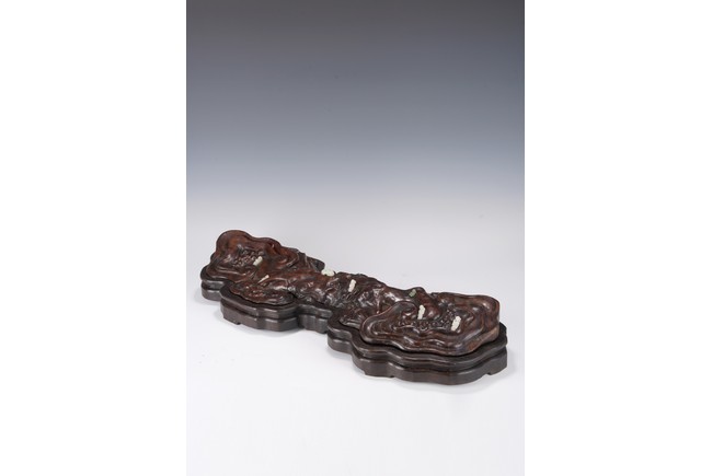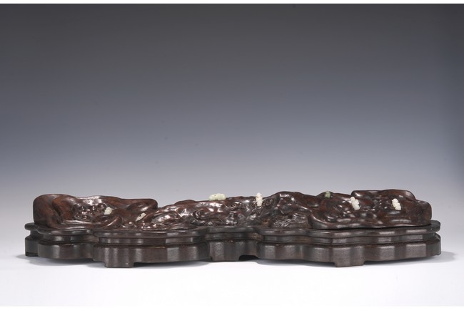 此件山子呈如意造型,體量碩大,一木整做,多年摩挲後包漿溫潤紅亮,山子點綴鑲嵌多件白玉人物、童子、瑞獸,給山石增添生機與氣氛,整觀山子器宇軒昂,宮廷氣息顯著。