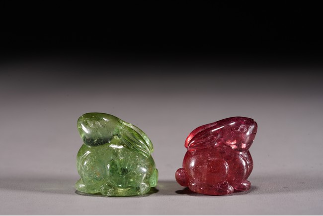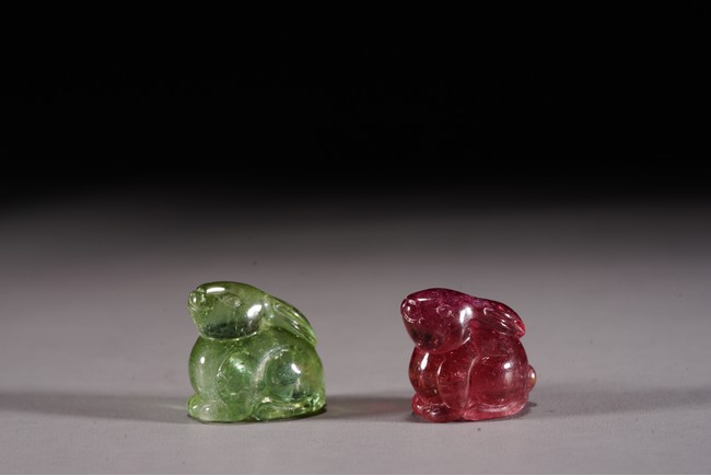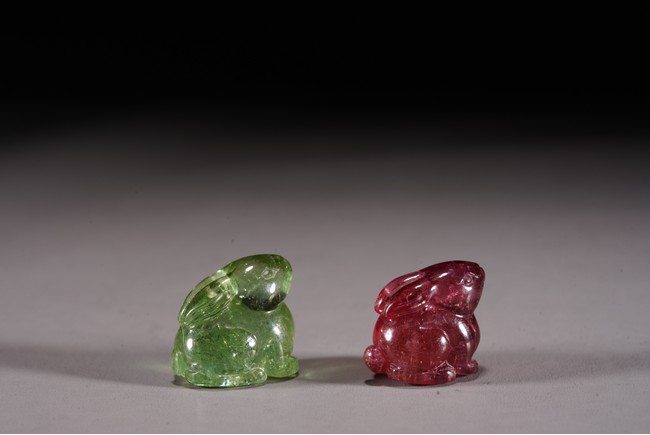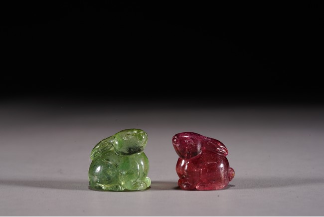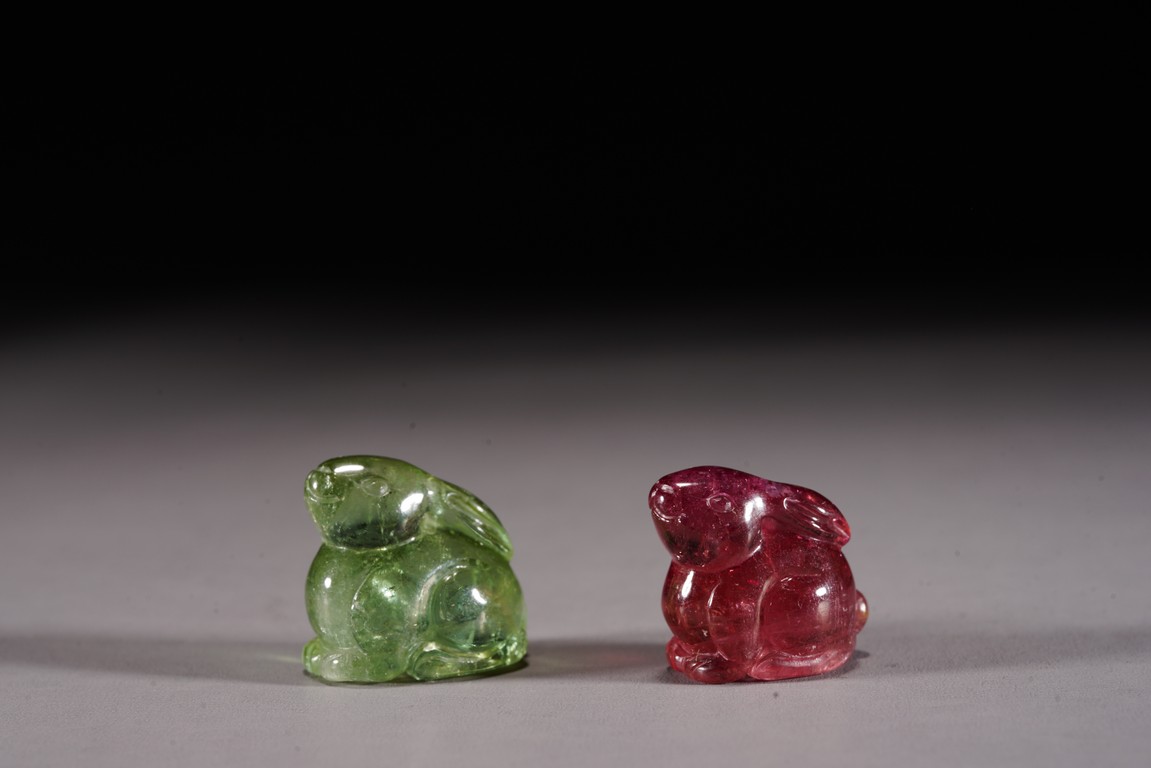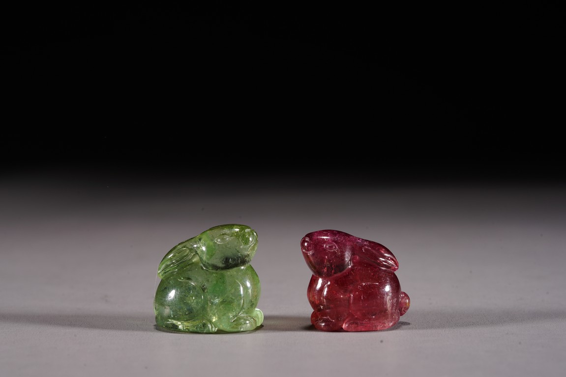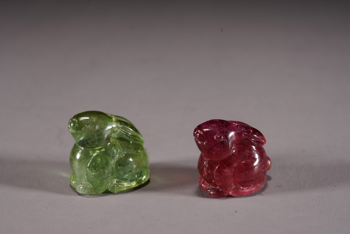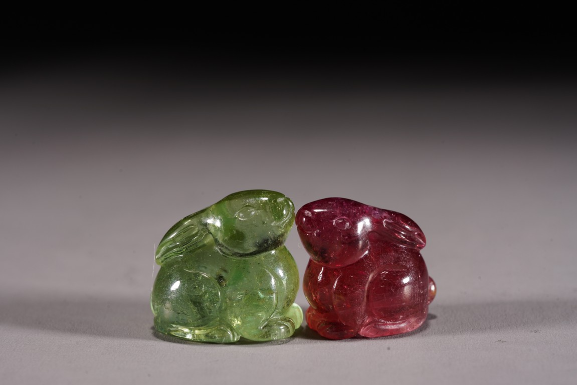 Chinese. Carved in the form of recumbent rabbits in highly translucent pink and green tourmaline. Qing Dynasty period.