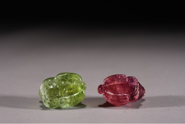 天然碧璽材質,晶瑩剔透,雕工精湛細膩,成對保存完整。