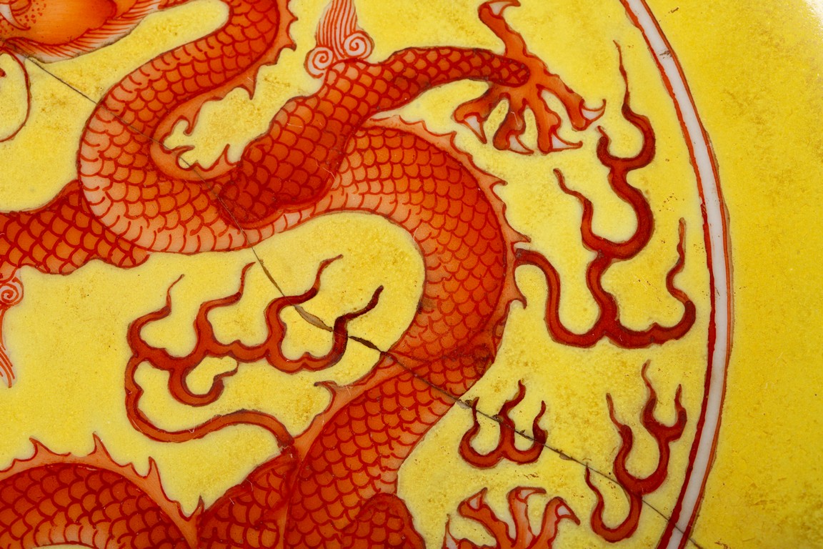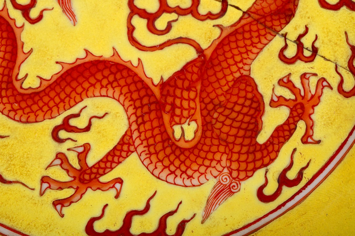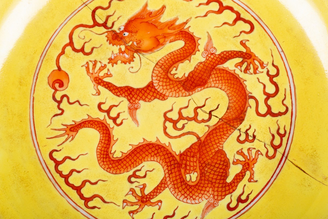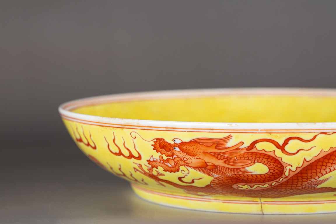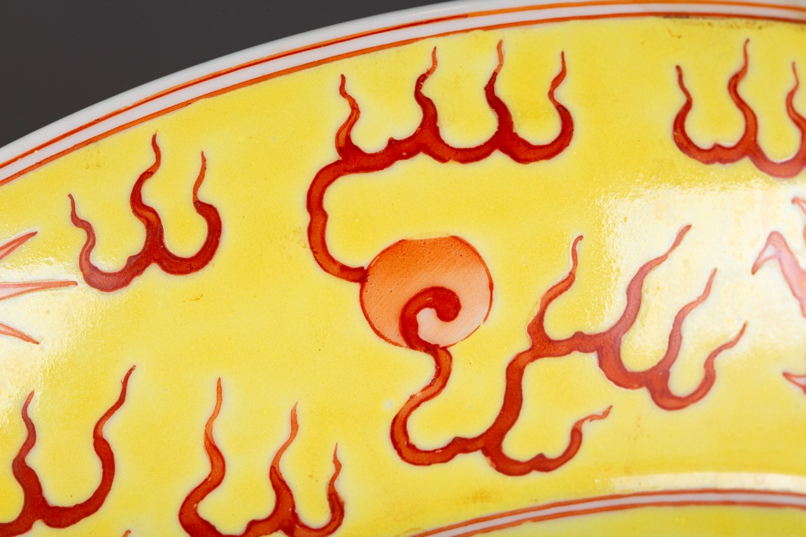 Chinese. The shallow rounded sides supported on a short tapered foot, painted to the interior with a ferocious dragon amidst flames, all reserved against a rich egg-yolk yellow ground, the white base inscribed with a six-character reign mark in underglaze blue within double circles. Qing Dynasty period.