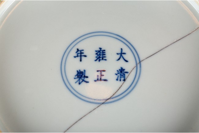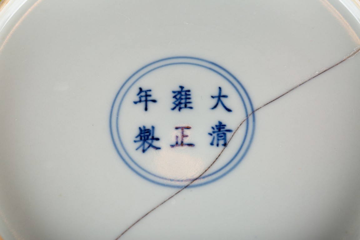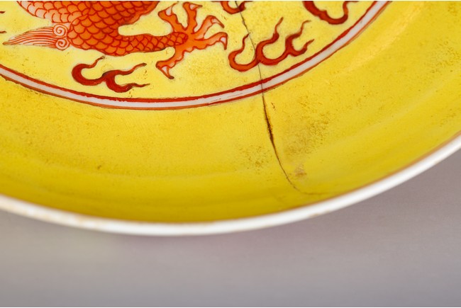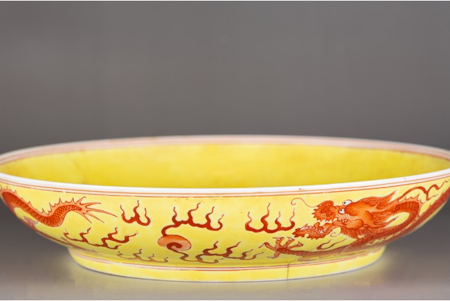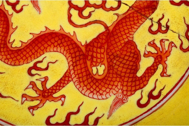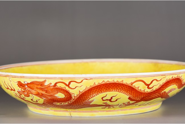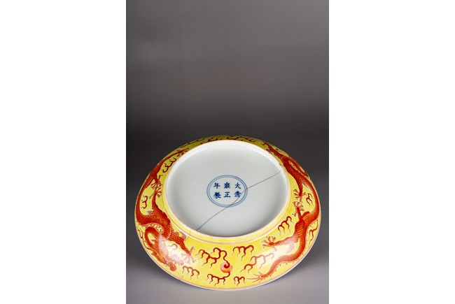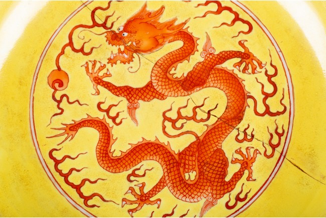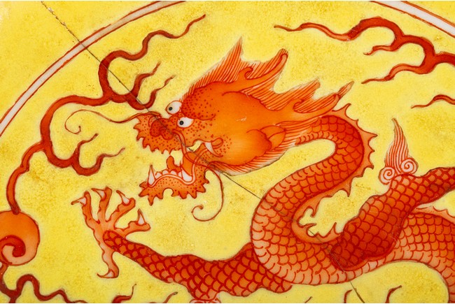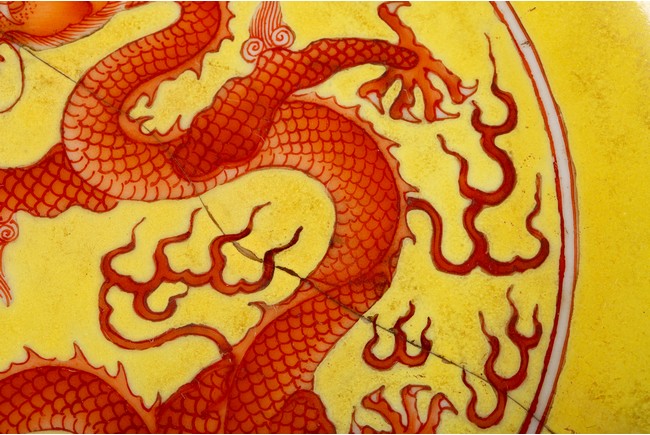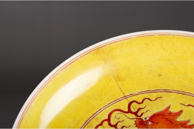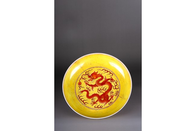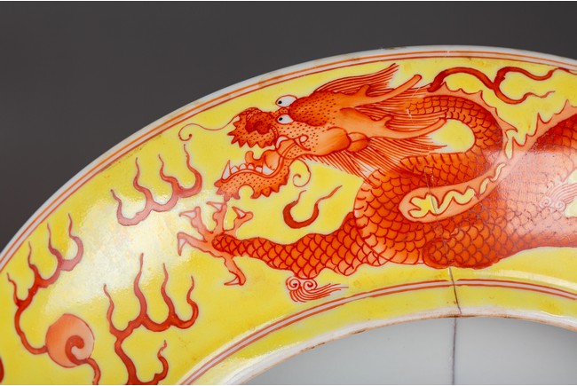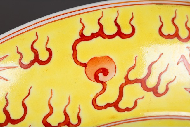 “黃地紅彩”又稱 “黃釉紅彩” 、 “黃上紅” 。明代嘉靖彩瓷中的一種特殊品種 。先以高 溫燒成瓷胎, 澆上黃釉, 然後以 850—900℃的火候燒成黃釉器, 再用鐵紅描繪花紋, 以低 火度烘烤而成。雍正一朝雖僅十三年, 但其瓷器質量高超, 本品黃地紅彩龍紋盤為雍正慕古 之作, 此類釉色的龍紋盤在雍正時期極甚罕見, 雖殘猶珍。盤敞口, 弧壁, 淺腹, 圈足, 其形端莊秀雅, 簡潔清新, 釉汁厚潤胎骨堅致細膩 。通體以 嬌黃釉為地, 黃色純正嬌嫩, 盤心繪“正面龍紋”, 盤壁繪“雲龍趕珠紋”, 口齒怒張, 須 髮披散, 氣勢磅礡, 右前爪前伸追逐前方的火珠, 肌肉鼓脹, 龍爪為五爪, 皆鋒利尖銳, 氣 勢撼人。其畫法流暢典雅, 紅彩勾繪細膩精緻, 黃彩厚潤靜穆, “大清雍正年制”款識 。 (參 閱故宮博物院黃地紅彩二龍趕珠紋碗)