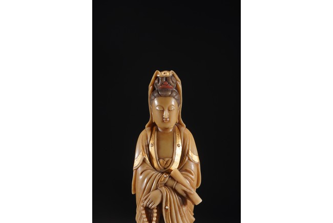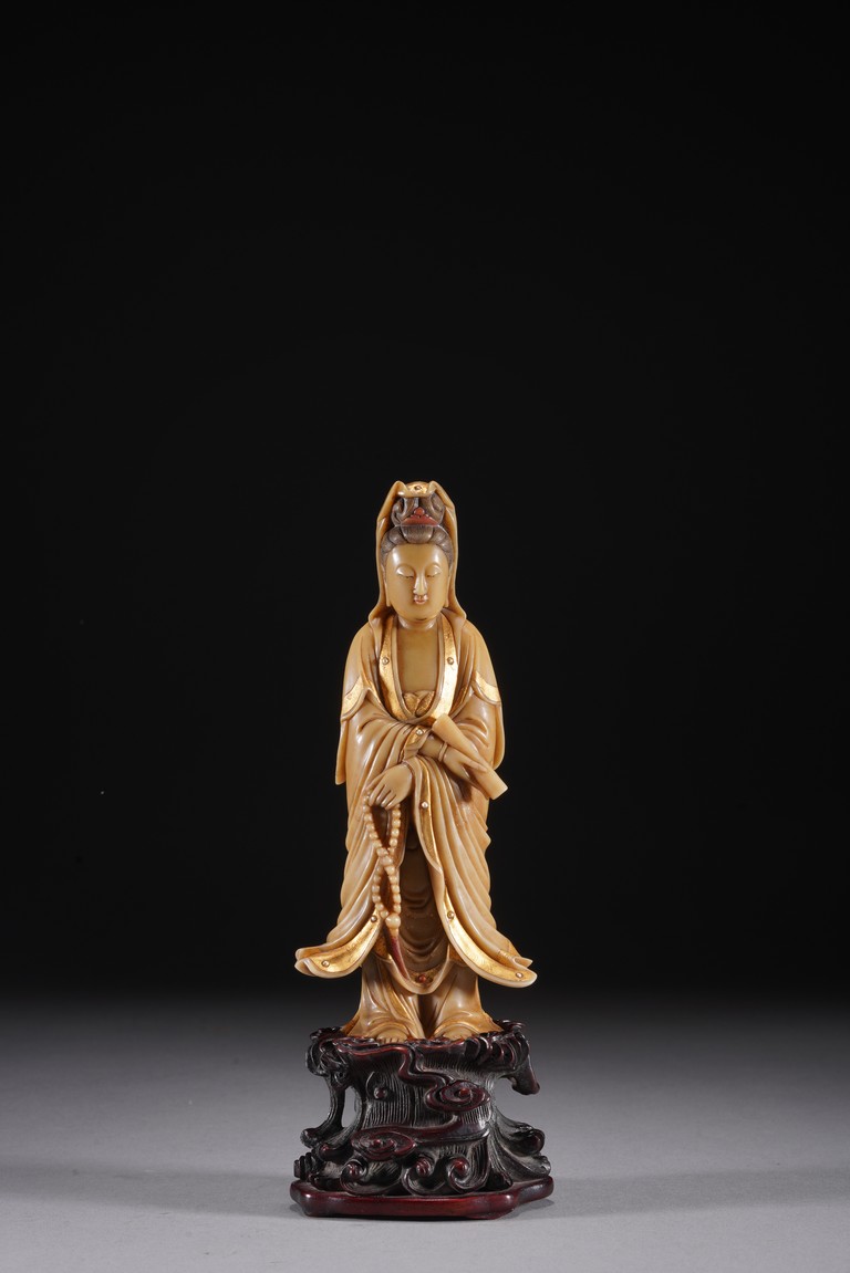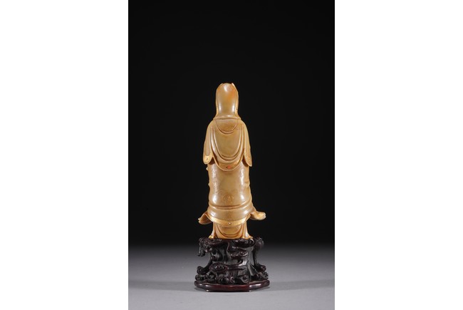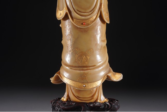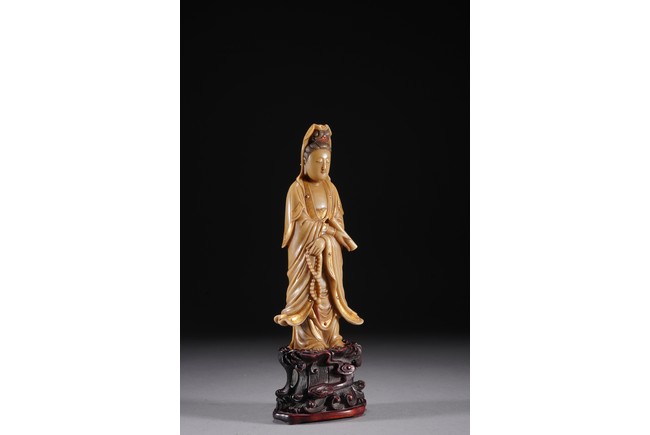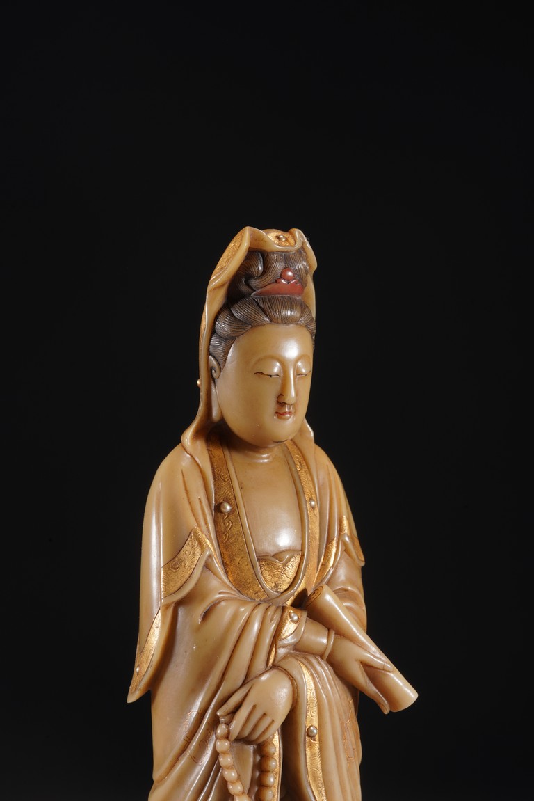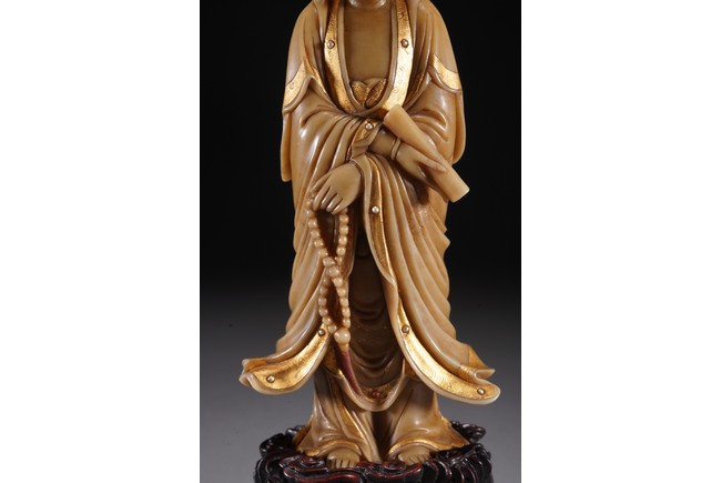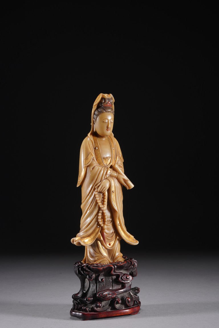 觀音大士面部慈祥,身著紗衣,衣帶飄飄,周身嵌寶石,一手持經卷,一手持念珠,於海水雲紋紫檀底座之上,壽山石選料精良,雕工精湛細膩,包漿溫潤雅緻。