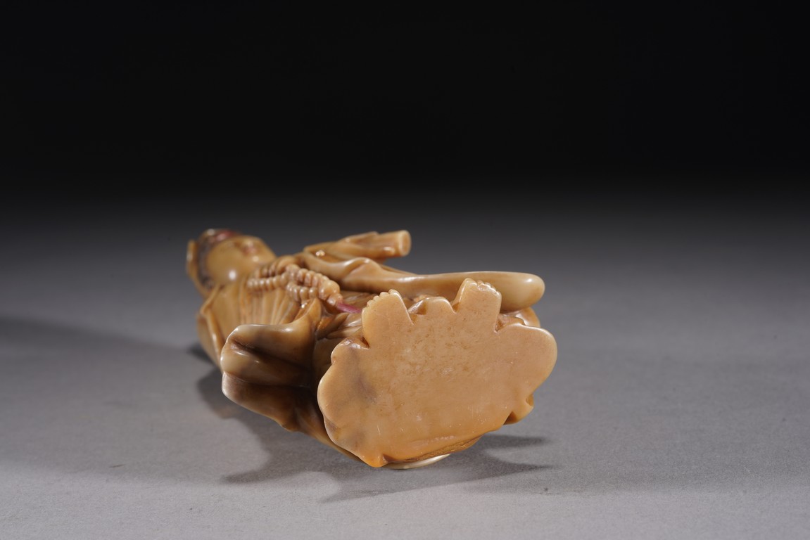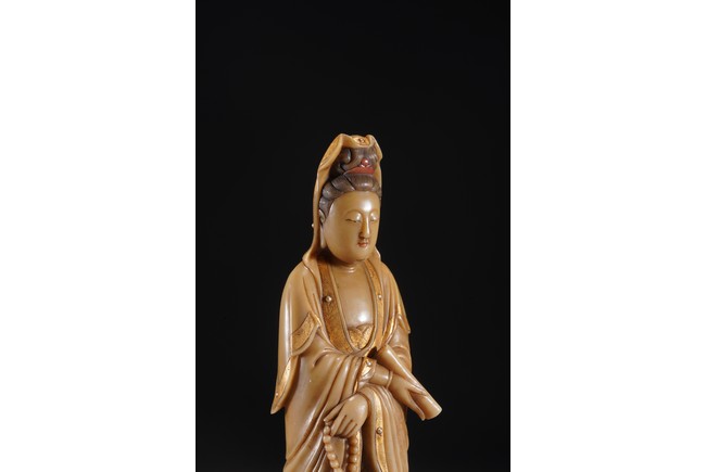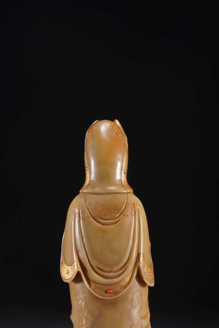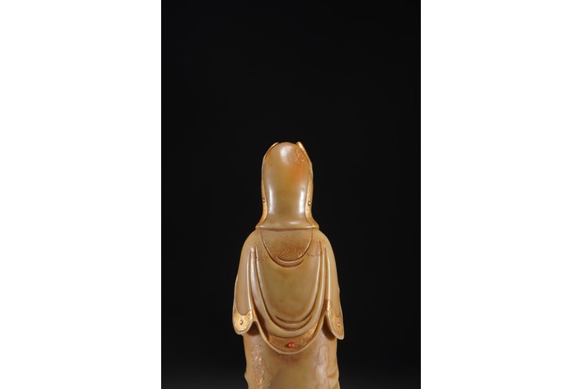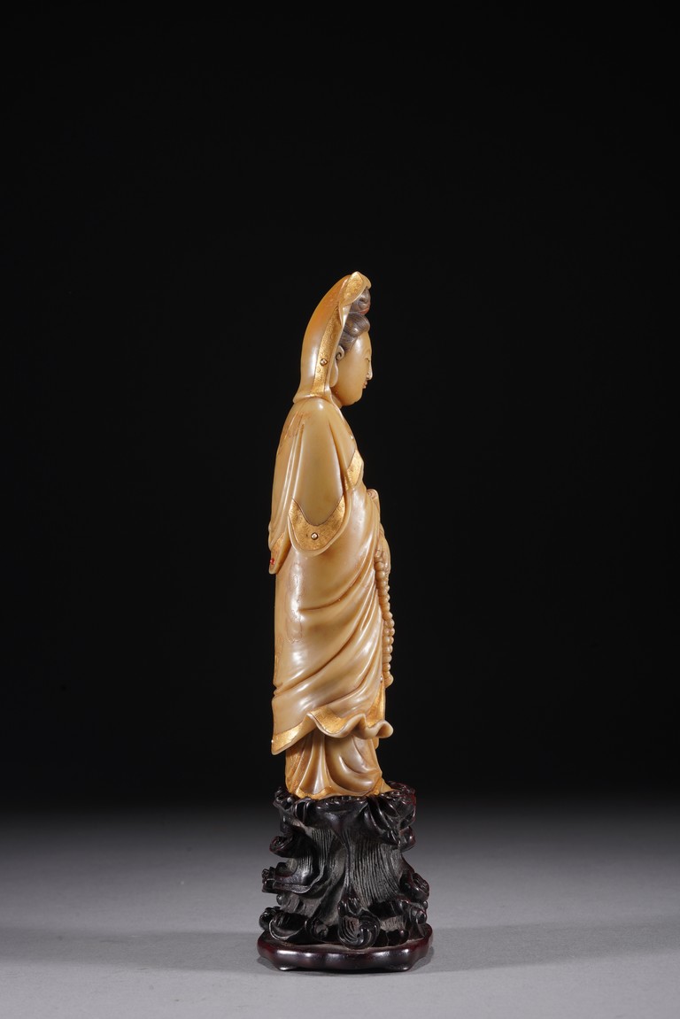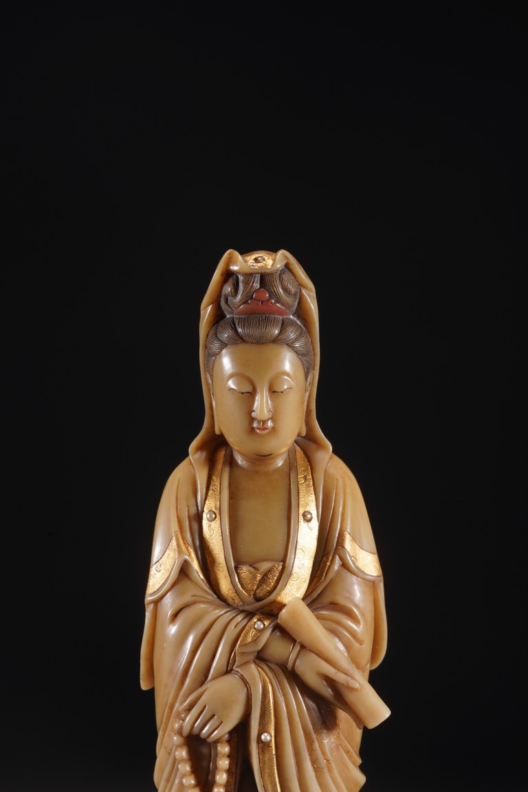 觀音大士面部慈祥,身著紗衣,衣帶飄飄,周身嵌寶石,一手持經卷,一手持念珠,於海水雲紋紫檀底座之上,壽山石選料精良,雕工精湛細膩,包漿溫潤雅緻。
