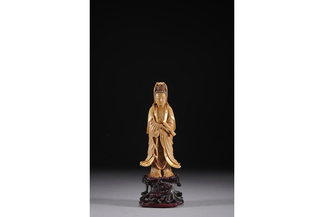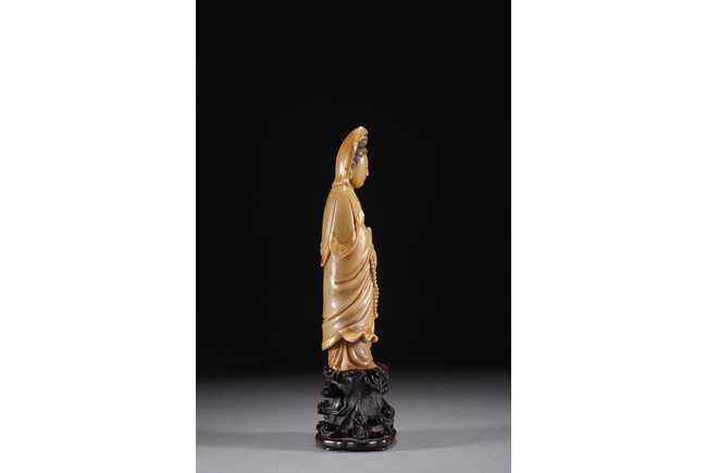 Chinese. The standing deity dressed in long flowing robes finely incised overall with detached cloud swirls and scrolling lotus along the hems, holding a scroll in one hand and necklace on the other hand, her face framed by a cowl and high chignon, set atop a carved rosewood stand. Qing Dynasty period.