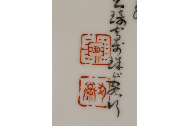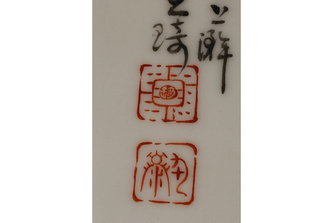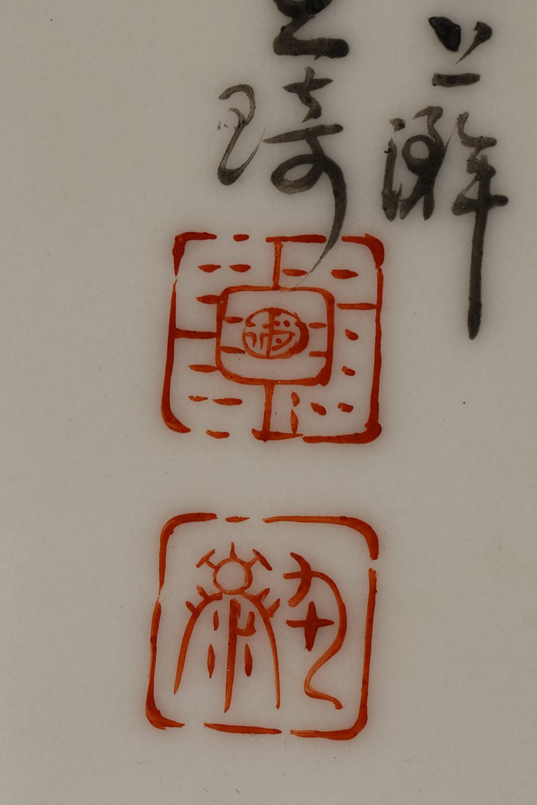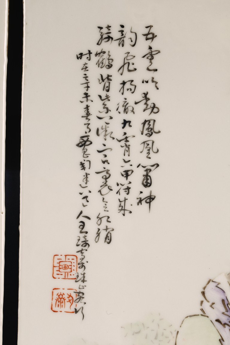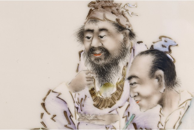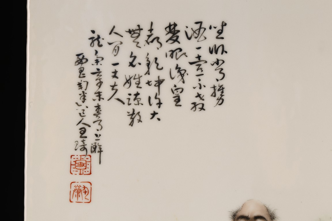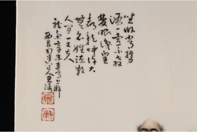 此對瓷板注重臉部描繪,神情捕捉準確,衣紋勾線放達而疏鬆,簡練概括,用筆粗放卻不失結構嚴謹,作品描繪精心,寥寥數筆就賦予了人物強烈的立體感,使人物形神兼備。人物應為八仙其中的四仙,分別為呂洞賓,漢鐘離,韓湘子,鐵拐李,寓意美好。墨彩落款字跡清晰,飄逸自然。