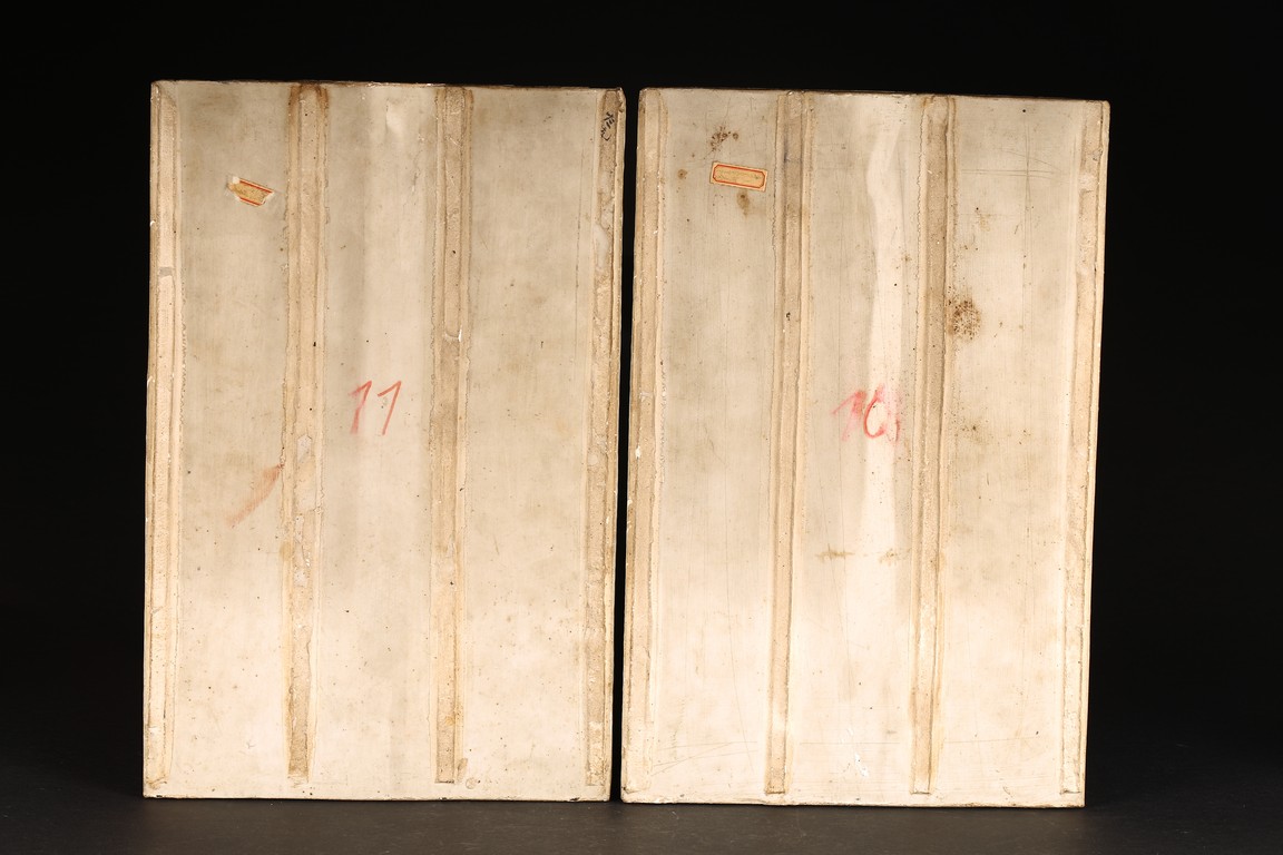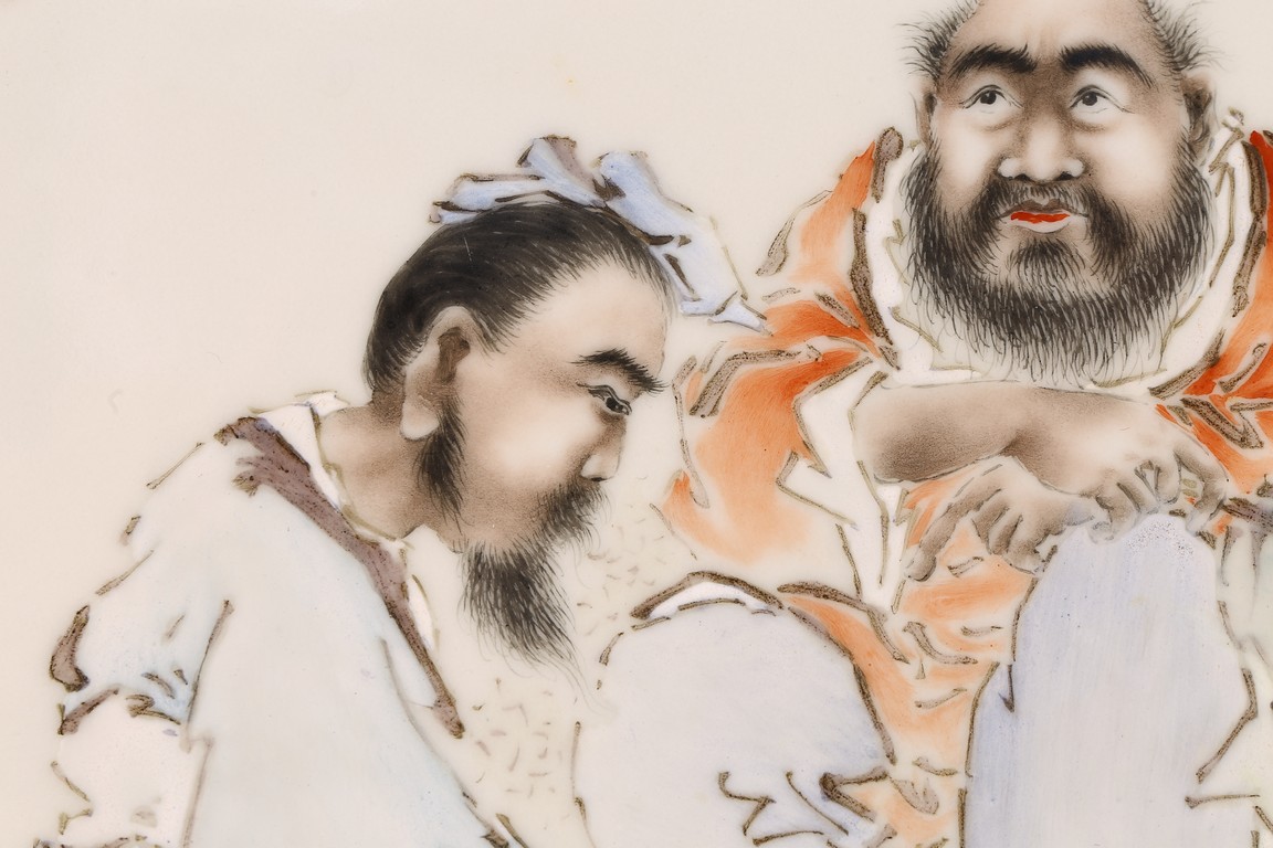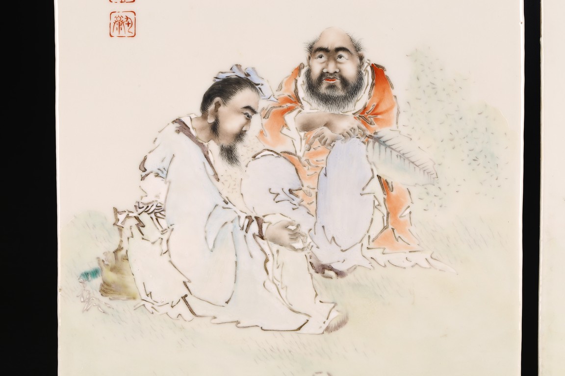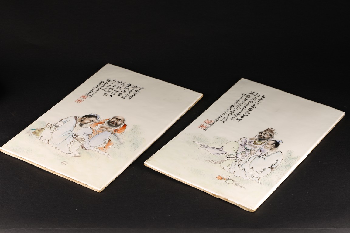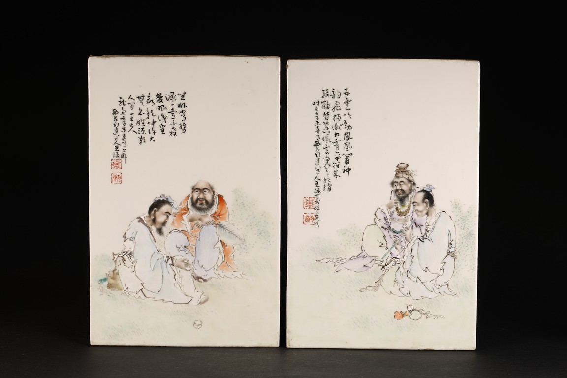 Republic period. Consisting of two famille rose panels, one depicting a man seated and holding a flute next to a beard man holding his necklace, with inscription and signed Wang Qi, with two seal marks; the other panel depicts two seated figures, one holding fan, with inscription and signed Wang Qi with two seal marks.