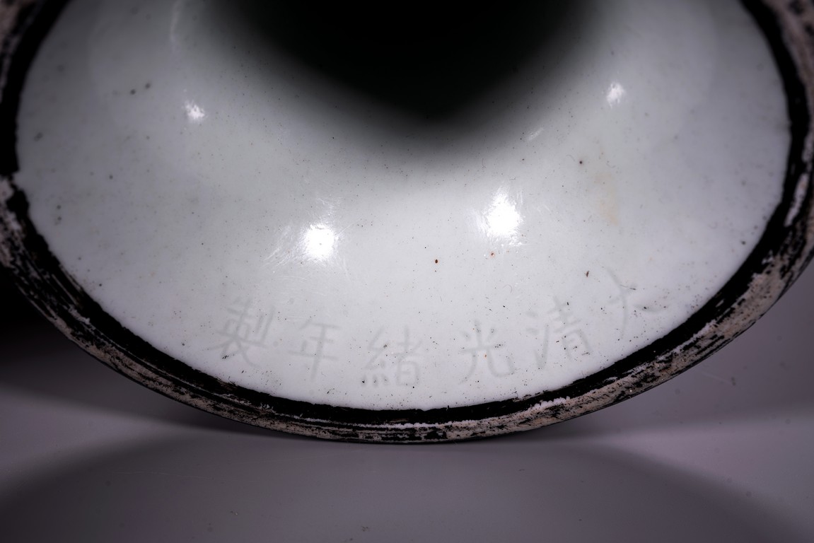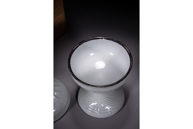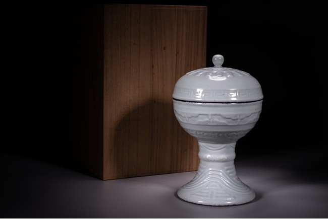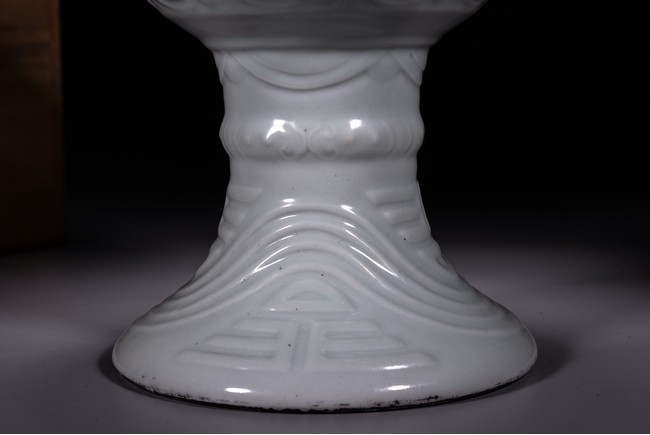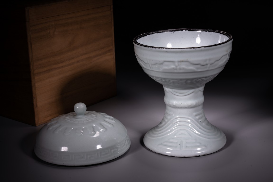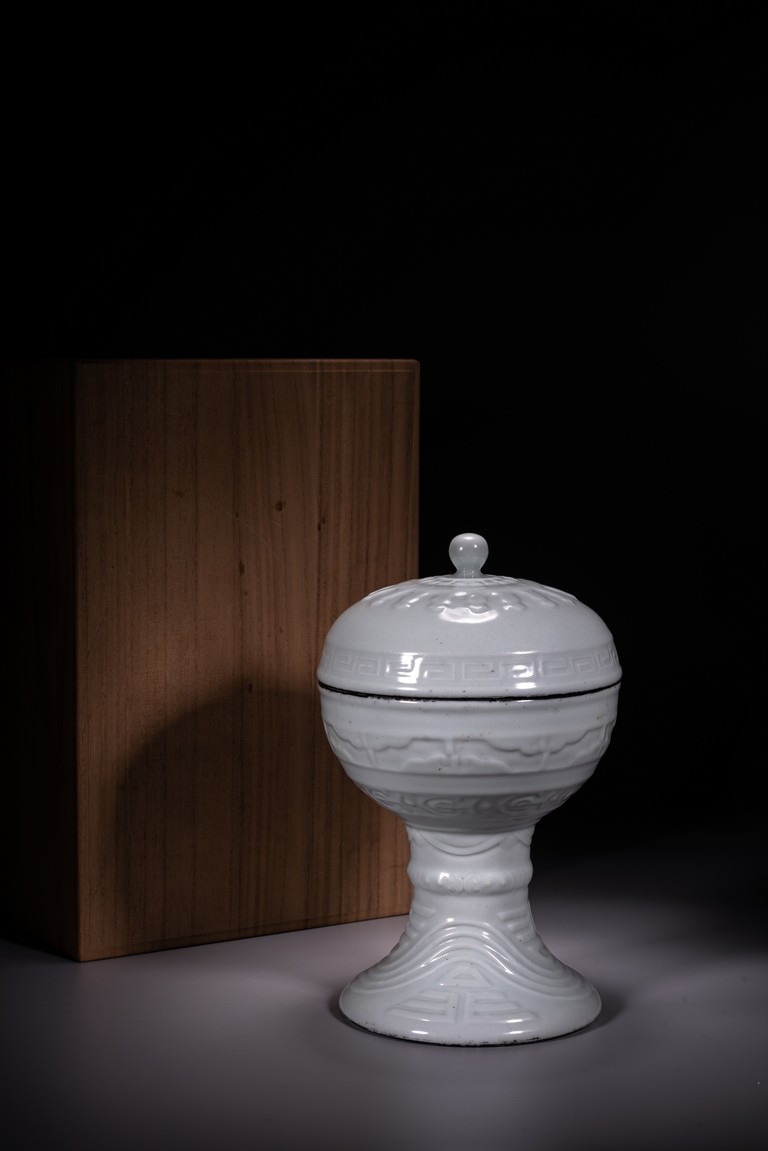 此豆有蓋,為半球形寶珠紐蓋,子口。豆身半球形,與蓋扣合似一球。竹節狀柄,喇叭形外撇高圈足。器表面以模印手法裝飾多層紋飾,器蓋有蓮瓣紋,回紋等,器身自上而下有正反如意雲紋頭紋十組,CC-1紋九組,正反斐紋四組及弧線紋等。紋飾古雅。通體施白釉。豆為食器,後發展為禮器。此豆整體色澤莊重富貴,器型周正,胎質細膩,包漿自然,保存完好,是光緒官窯專供宮廷禮儀場合使用而生產的重要器具,收藏佳器。來源: 洛杉磯私人藏家收藏 Provenance: Private collection, Los Angeles