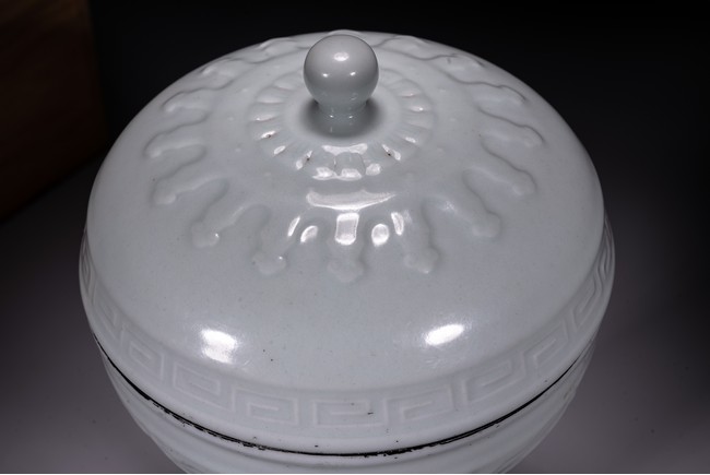 The rounded bowl supported on a columnar base encircled with a raised band and terminating in a splayed pedestal foot, surmounted by a fitted domed cover with globular knob, moulded with bands of archaistic design in shallow relief, the interior of the base incised with a reign mark.Qing Dynasty period.